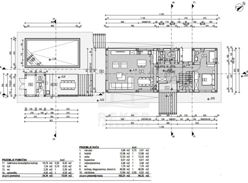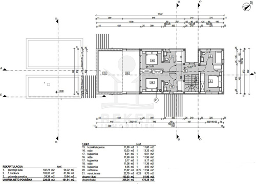 Das Haus umfasst 176,28 m² Wohnfläche auf zwei Etagen. Im Erdgeschoss (94,32 m²) erwarten Sie Eingang, Flur, Zimmer, Bad, Gäste-WC, Waschküche, Küche mit Essbereich und ein Wohnzimmer mit Zugang zur Terrasse. Im Obergeschoss (81,96 m²) befinden sich drei großzügige Schlafzimmer, jeweils mit eigenem Bad. Dazu eine überdachte und eine offene Terrasse mit schönem Blick auf das Meer und die Brijuni-Inseln.