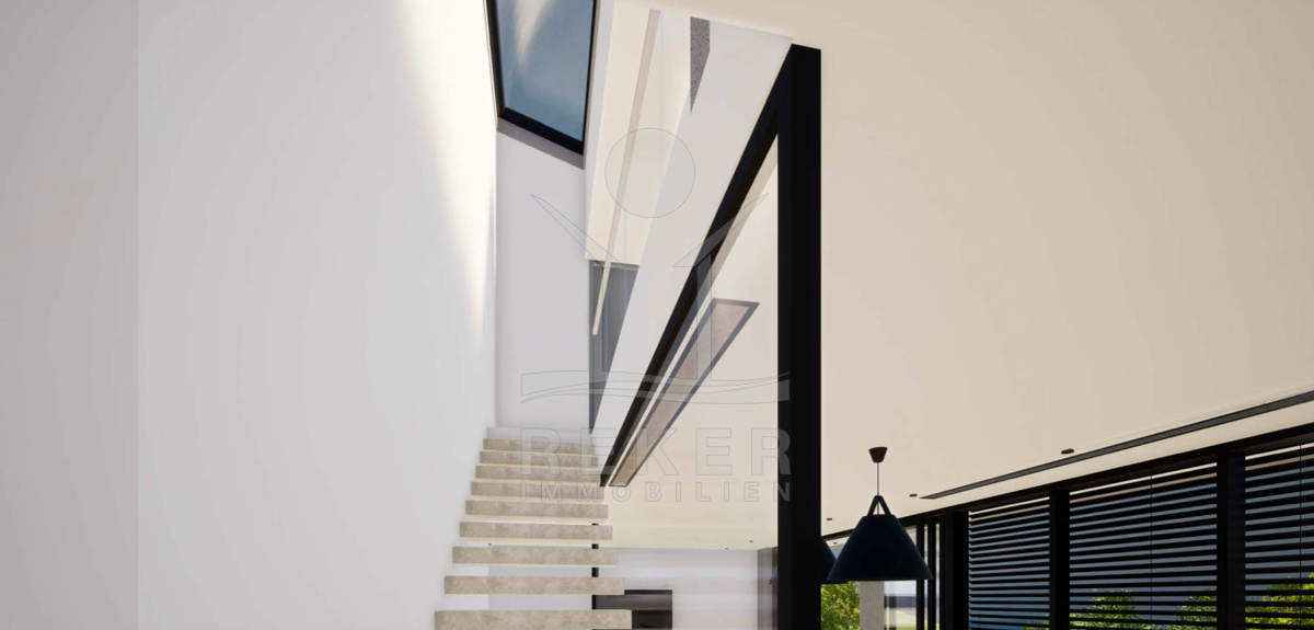 Im Erdgeschoss erwartet Sie ein luftiger Wohn- und Essbereich mit offener Küche. Dieses offene Konzept besticht durch eine 12 Meter lange Glaswand mit einer Höhe von 2,6 Metern, die für eine lichtdurchflutete Atmosphäre sorgt. Zusätzlich finden Sie hier ein Badezimmer, einen begehbaren Kleiderschrank und einen Wasch- und Trockenraum.