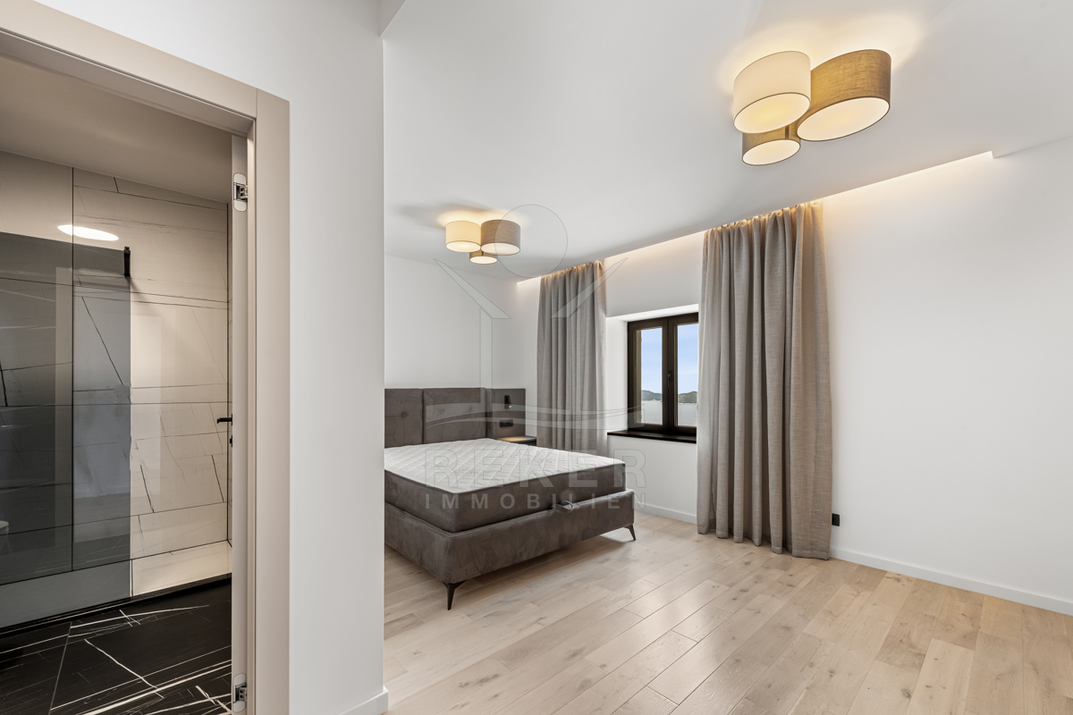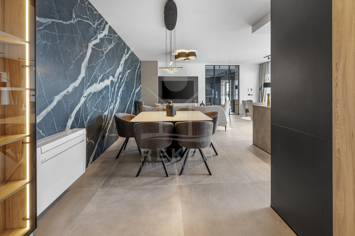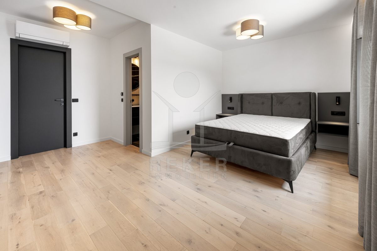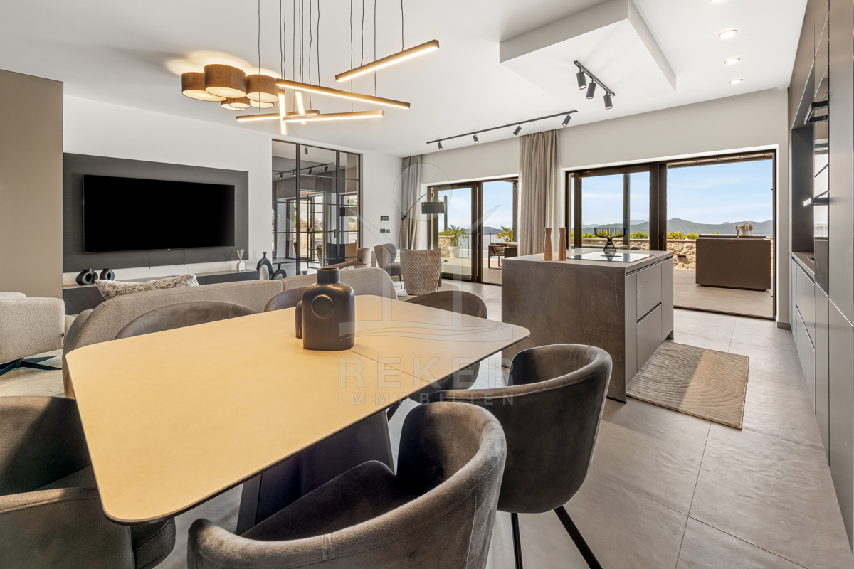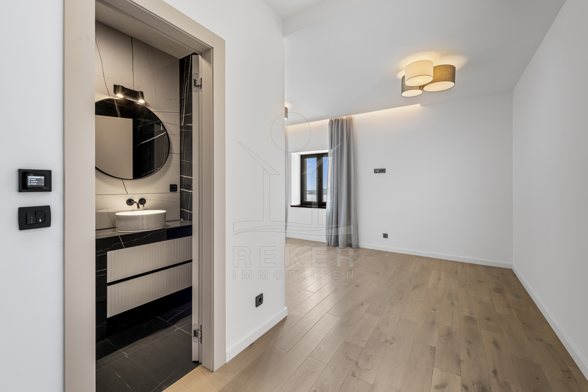 Im Inneren erwarten Sie ca. 280 m² Wohnfläche, die modernen Wohnkomfort mit mediterranem Charakter verbinden. Der großzügige Wohn- und Essbereich mit offener Designküche überzeugt durch edle Materialien, stimmige Beleuchtung und hochwertige Markengeräte. Vier Schlafzimmer, jeweils mit eigenem Bad en suite, sorgen für Privatsphäre und Komfort. Die Villa bietet Platz für bis zu zehn Personen und ist auch als Ferienhaus geeignet.