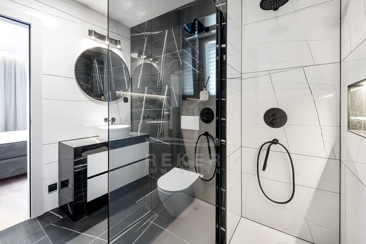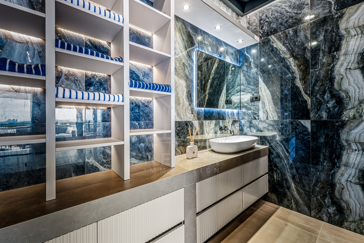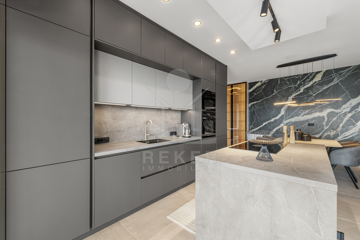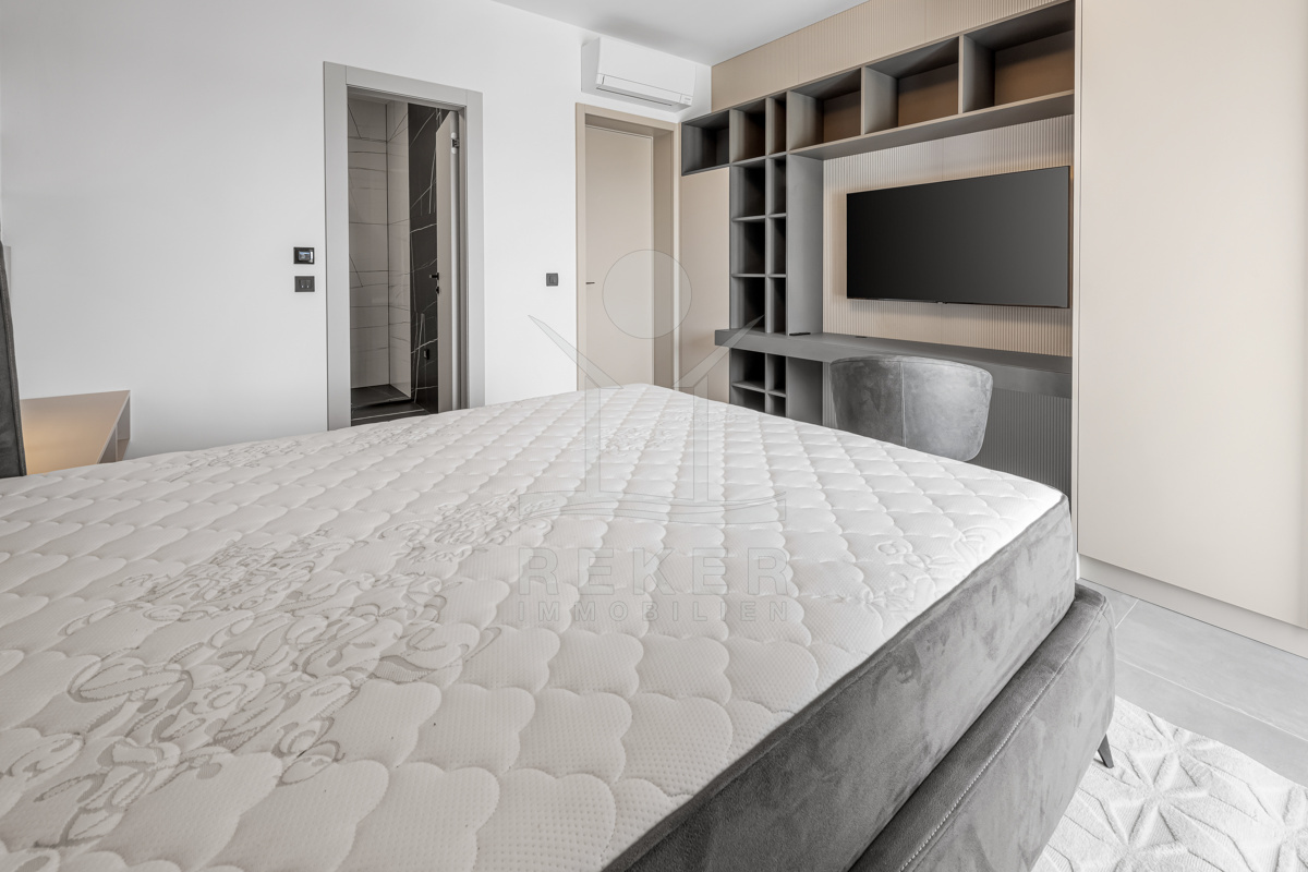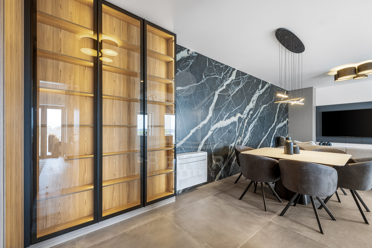 Im Inneren erwarten Sie ca. 280 m² Wohnfläche, die modernen Wohnkomfort mit mediterranem Charakter verbinden. Der großzügige Wohn- und Essbereich mit offener Designküche überzeugt durch edle Materialien, stimmige Beleuchtung und hochwertige Markengeräte. Vier Schlafzimmer, jeweils mit eigenem Bad en suite, sorgen für Privatsphäre und Komfort. Die Villa bietet Platz für bis zu zehn Personen und ist auch als Ferienhaus geeignet.