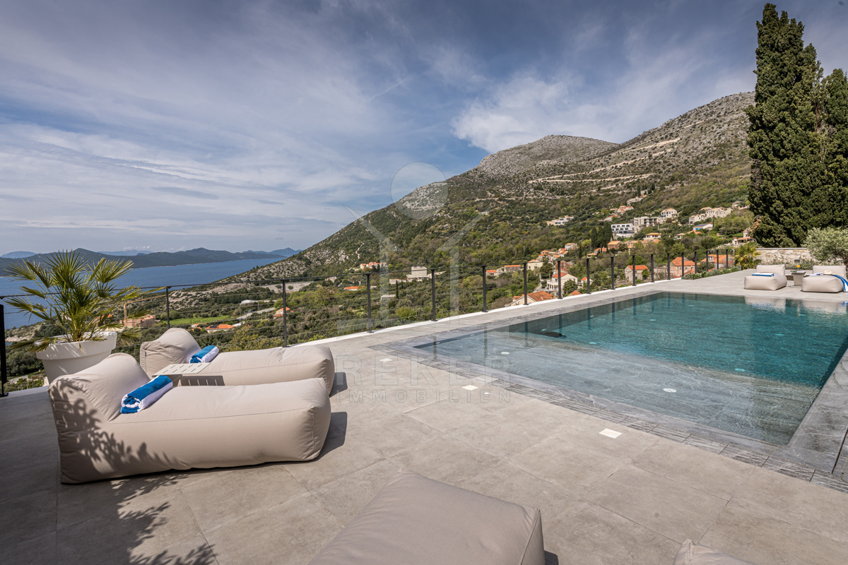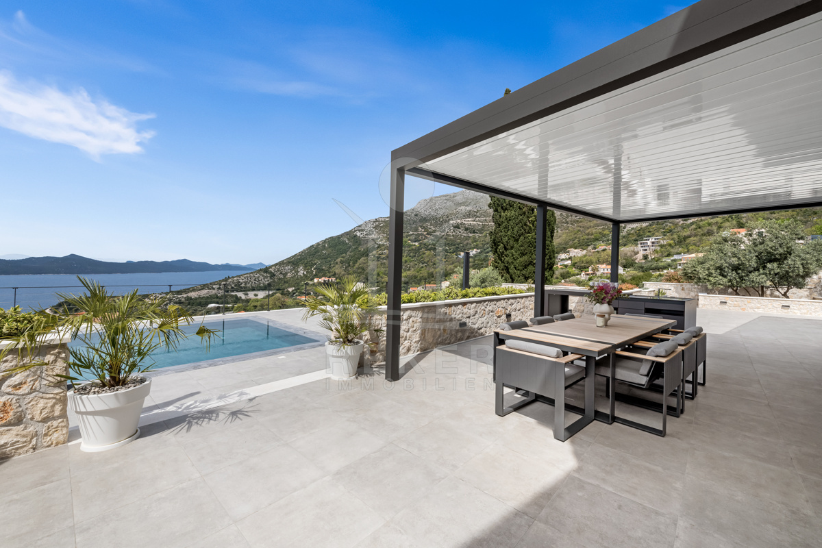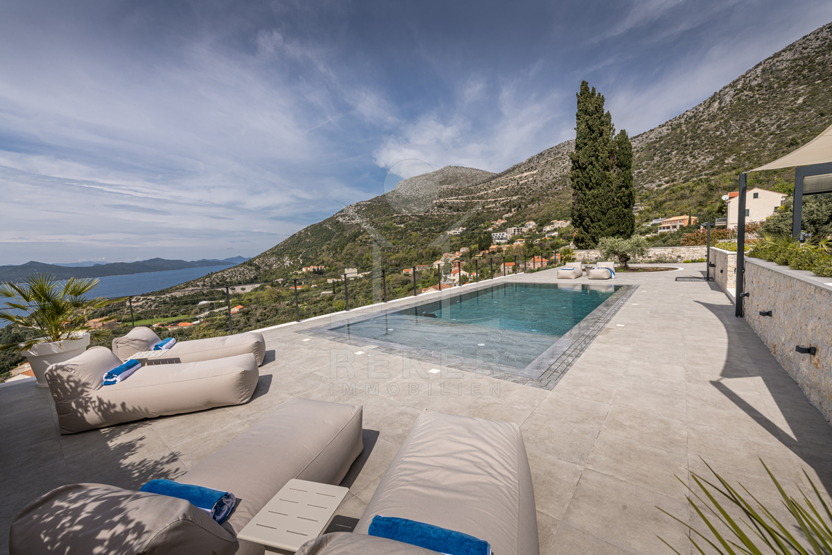 Eingebettet in eine idyllische Hügellandschaft nur etwa 15 Minuten von Dubrovnik entfernt, befindet sich diese neu erbaute Luxusvilla in einem kleinen, ruhigen Ort. Dank der Hanglage genießen Sie hier einen unverbaubaren Blick über die grüne Umgebung und den westlichen Horizont mit Sonnenuntergängen über dem Meer. Die Anfahrt erfolgt bequem über eine Zufahrtsstraße, am Haus stehen überdachte Parkplätze zur Verfügung.