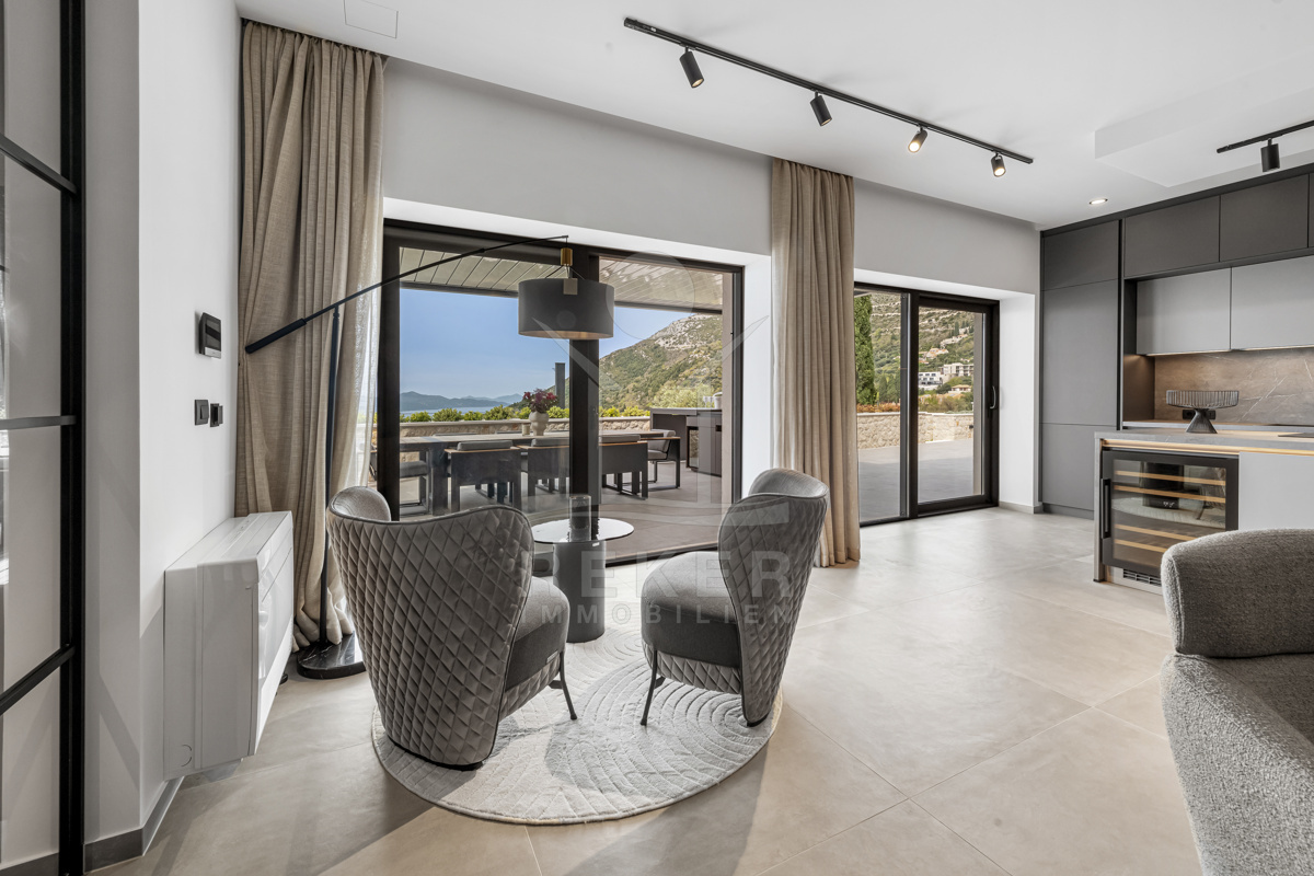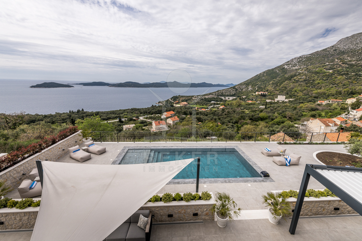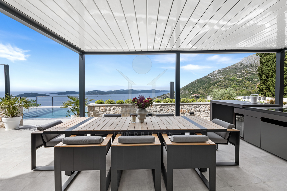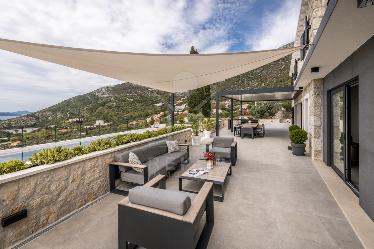Eingebettet in eine idyllische Hügellandschaft nur etwa 15 Minuten von Dubrovnik entfernt, befindet sich diese neu erbaute Luxusvilla in einem kleinen, ruhigen Ort. Dank der Hanglage genießen Sie hier einen unverbaubaren Blick über die grüne Umgebung und den westlichen Horizont mit Sonnenuntergängen über dem Meer. Die Anfahrt erfolgt bequem über eine Zufahrtsstraße, am Haus stehen überdachte Parkplätze zur Verfügung.