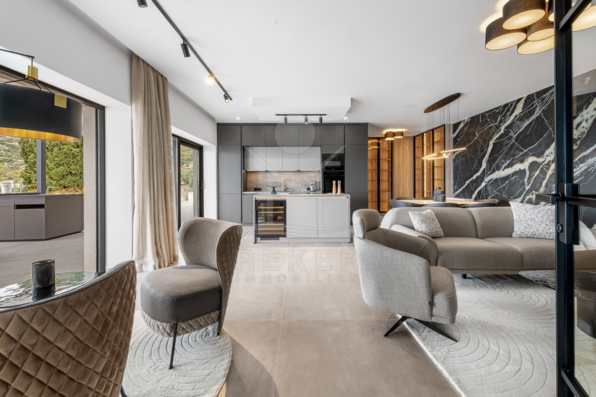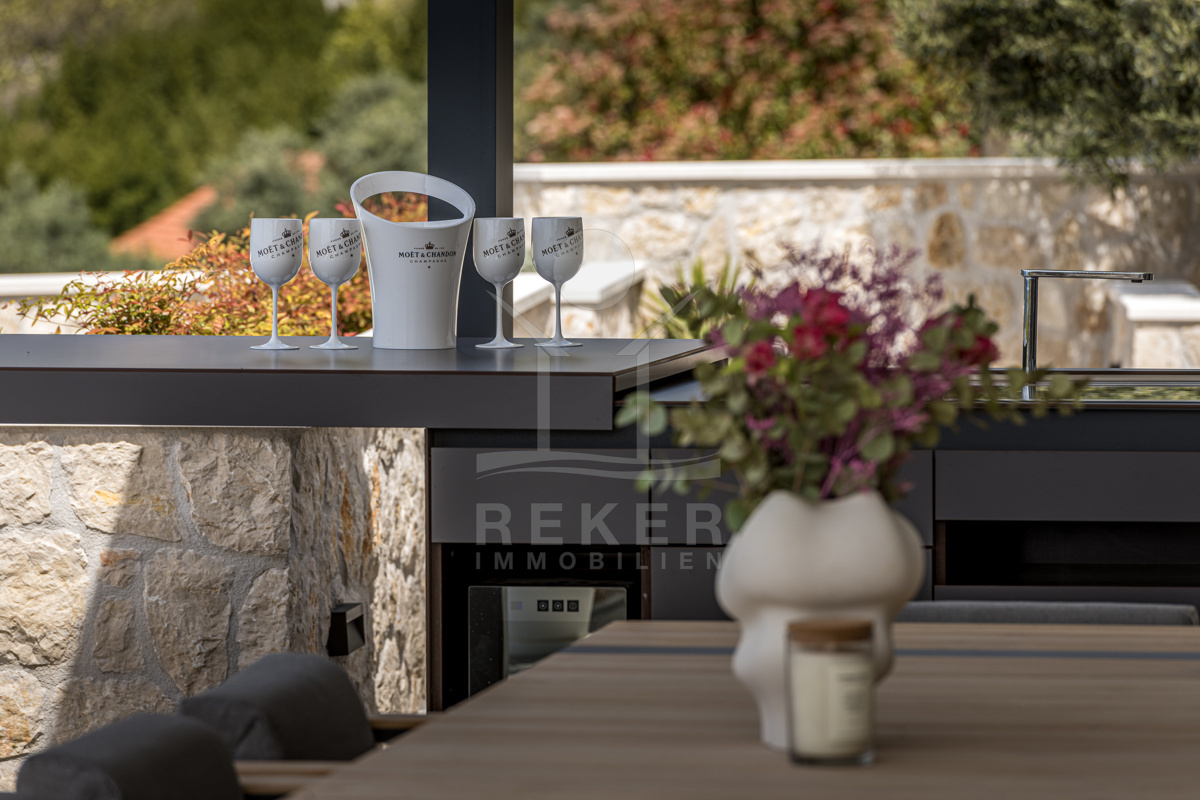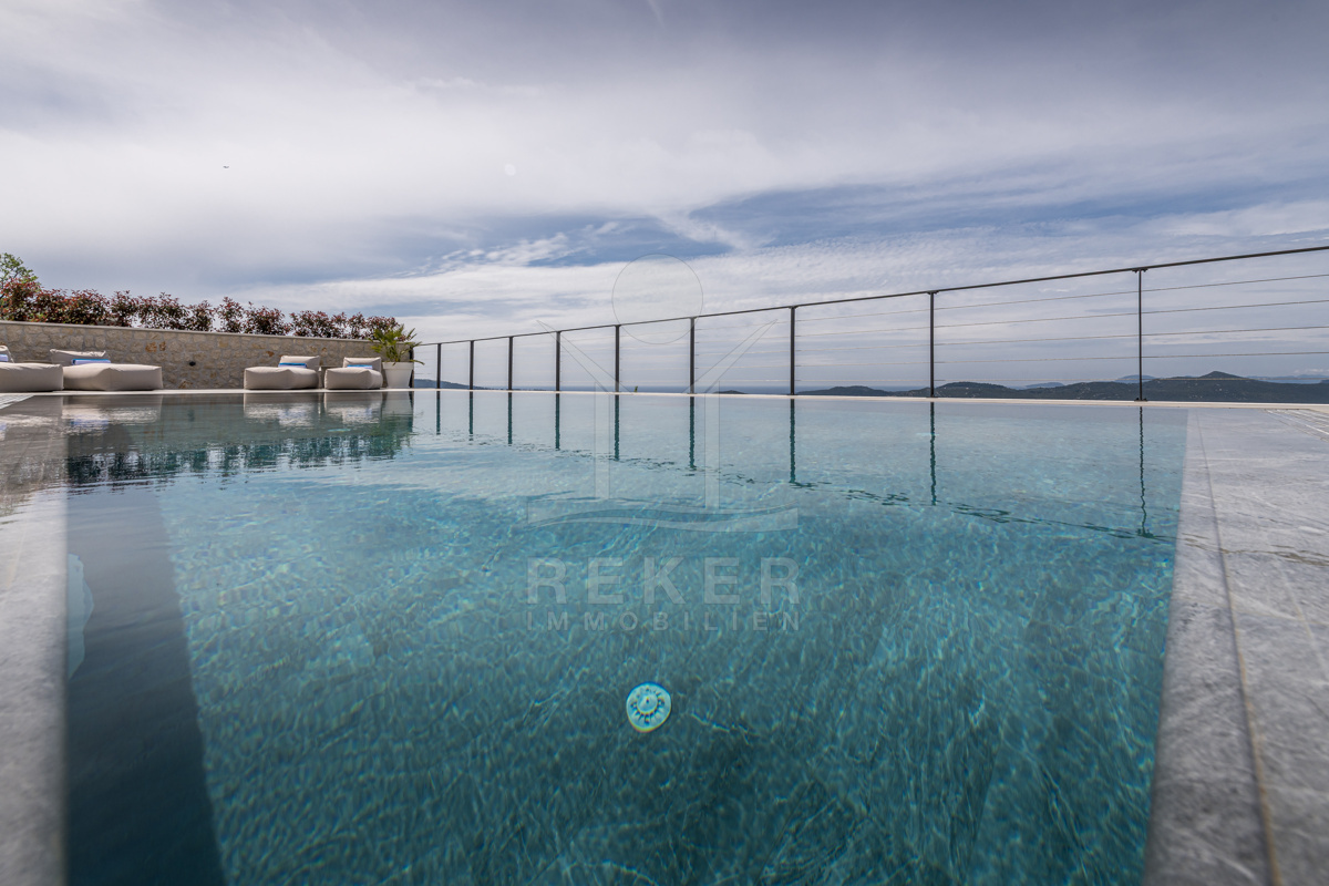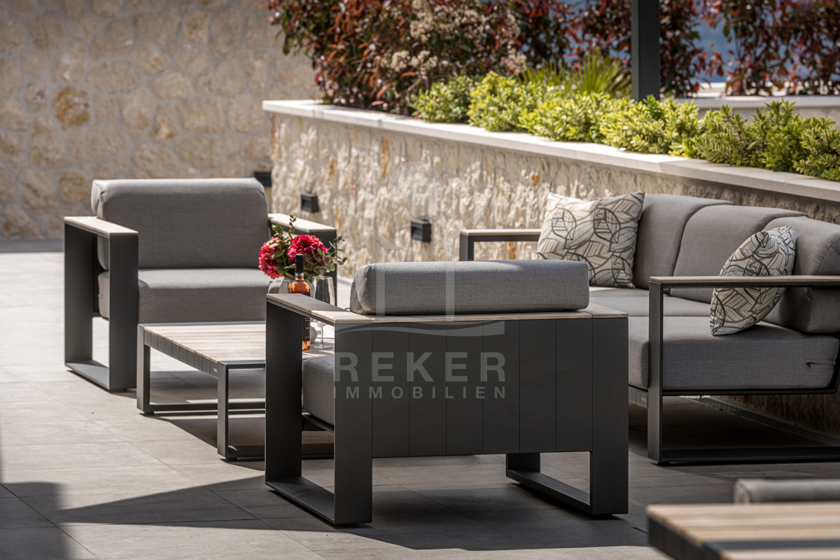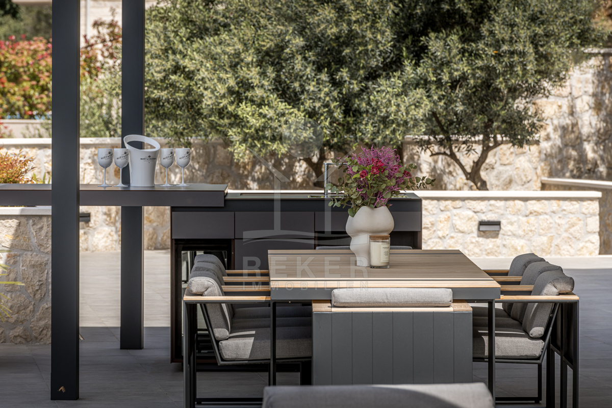 Das rund 1.000 m² große Grundstück ist mit mediterranen Pflanzen gestaltet und bietet zahlreiche Möglichkeiten zum Entspannen im Freien. Mehrere großzügige Terrassen, teilweise überdacht, schaffen unterschiedliche Bereiche – von der gemütlichen Lounge-Ecke bis zum Essplatz im Freien. Das Herzstück ist der Infinity-Pool, der beheizt werden kann und sich mit türkisfarbenem Wasser in die Aussicht aufs Meer einfügt. Eine voll ausgestattete Außenküche macht Grillabende oder Dinnerpartys unter freiem Himmel zum Vergnügen.