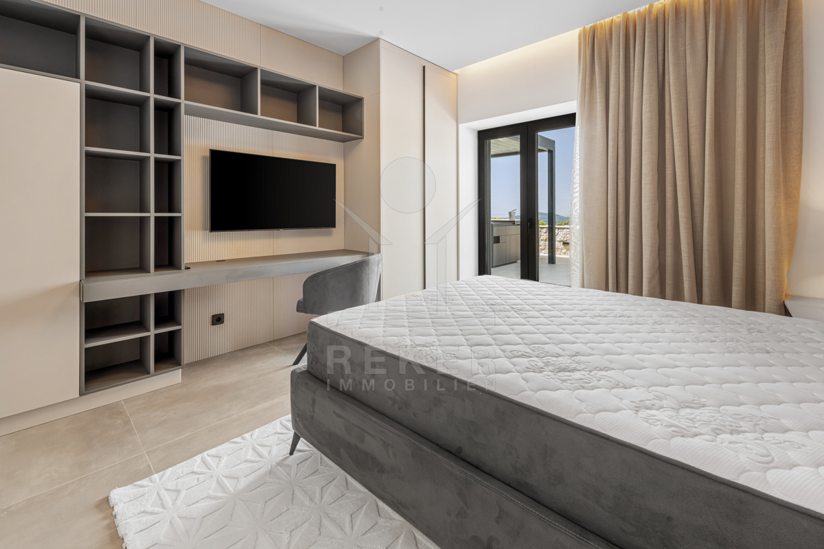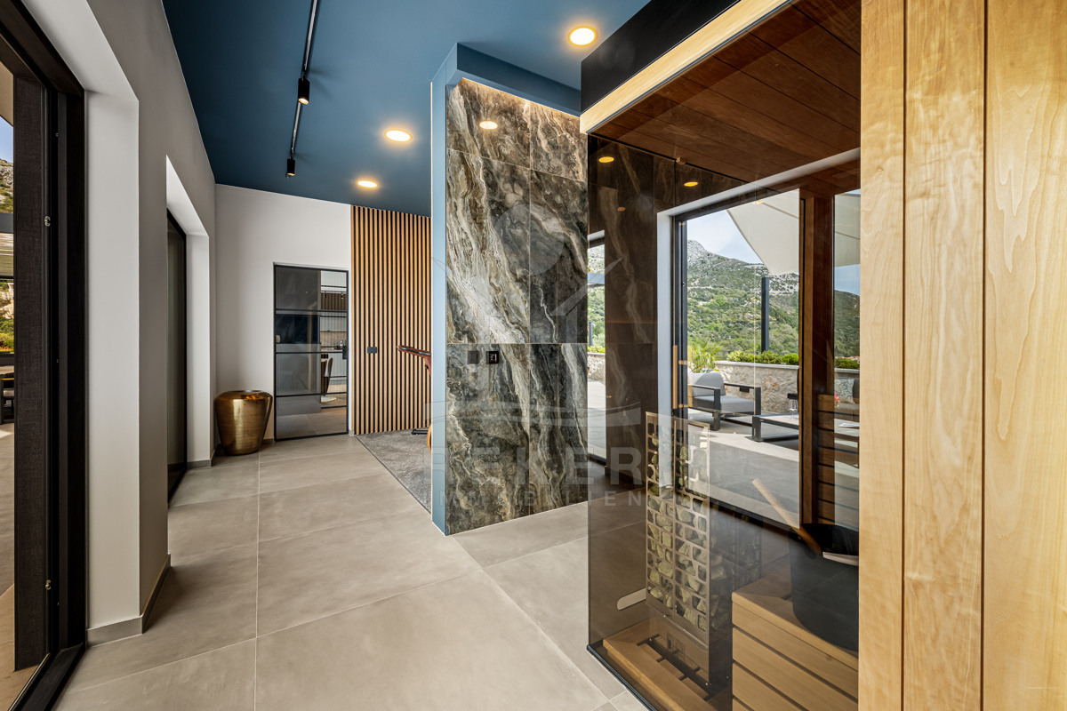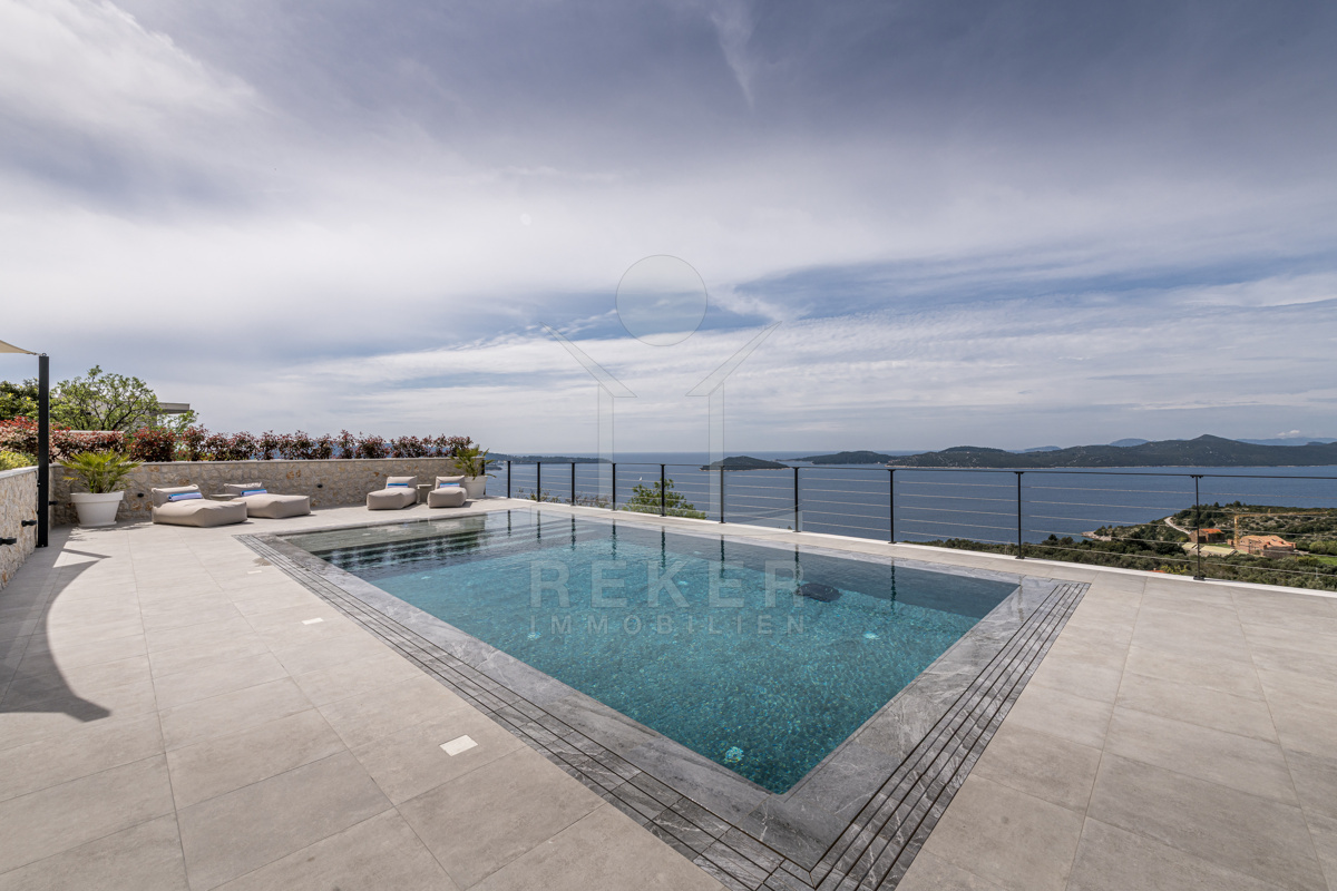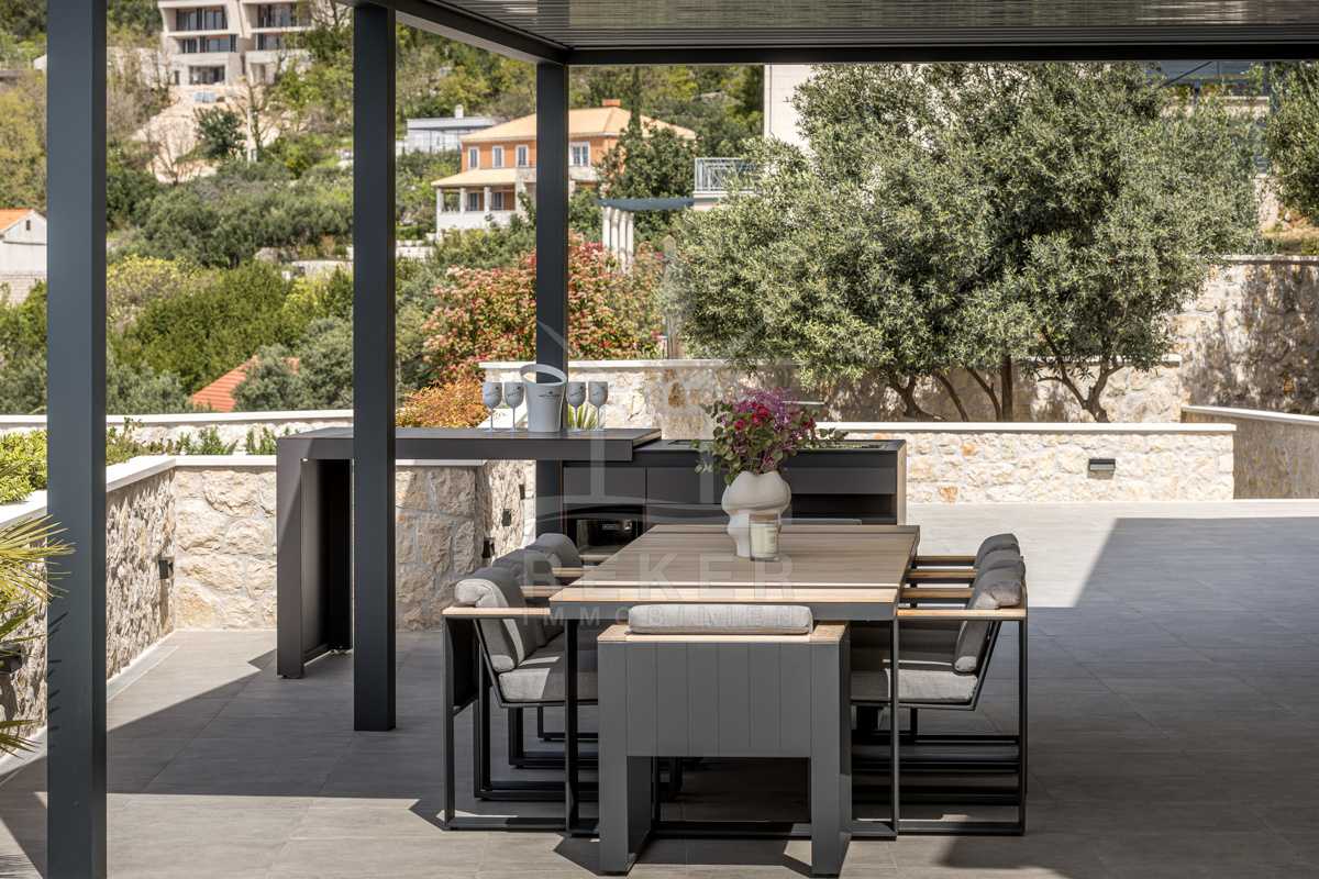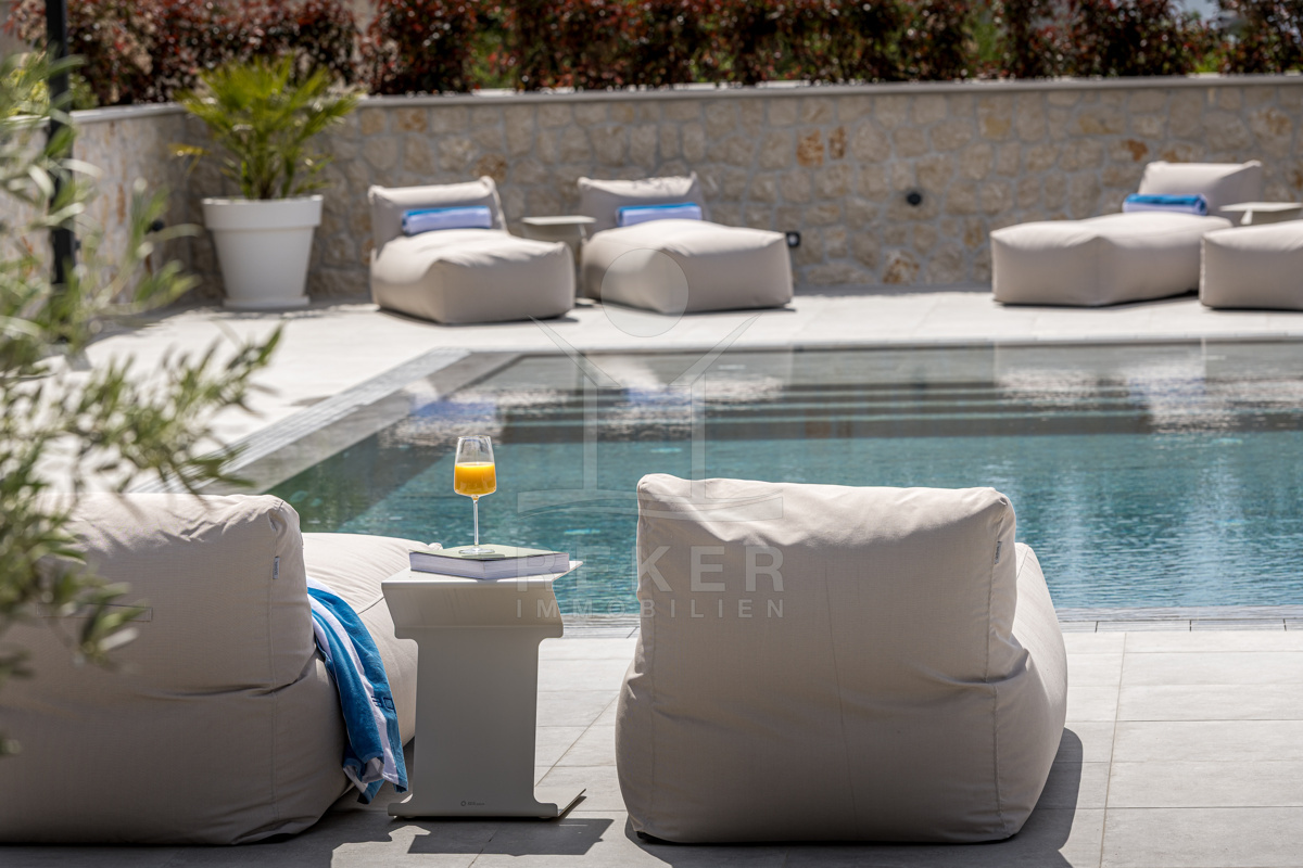 Das rund 1.000 m² große Grundstück ist mit mediterranen Pflanzen gestaltet und bietet zahlreiche Möglichkeiten zum Entspannen im Freien. Mehrere großzügige Terrassen, teilweise überdacht, schaffen unterschiedliche Bereiche – von der gemütlichen Lounge-Ecke bis zum Essplatz im Freien. Das Herzstück ist der Infinity-Pool, der beheizt werden kann und sich mit türkisfarbenem Wasser in die Aussicht aufs Meer einfügt. Eine voll ausgestattete Außenküche macht Grillabende oder Dinnerpartys unter freiem Himmel zum Vergnügen.