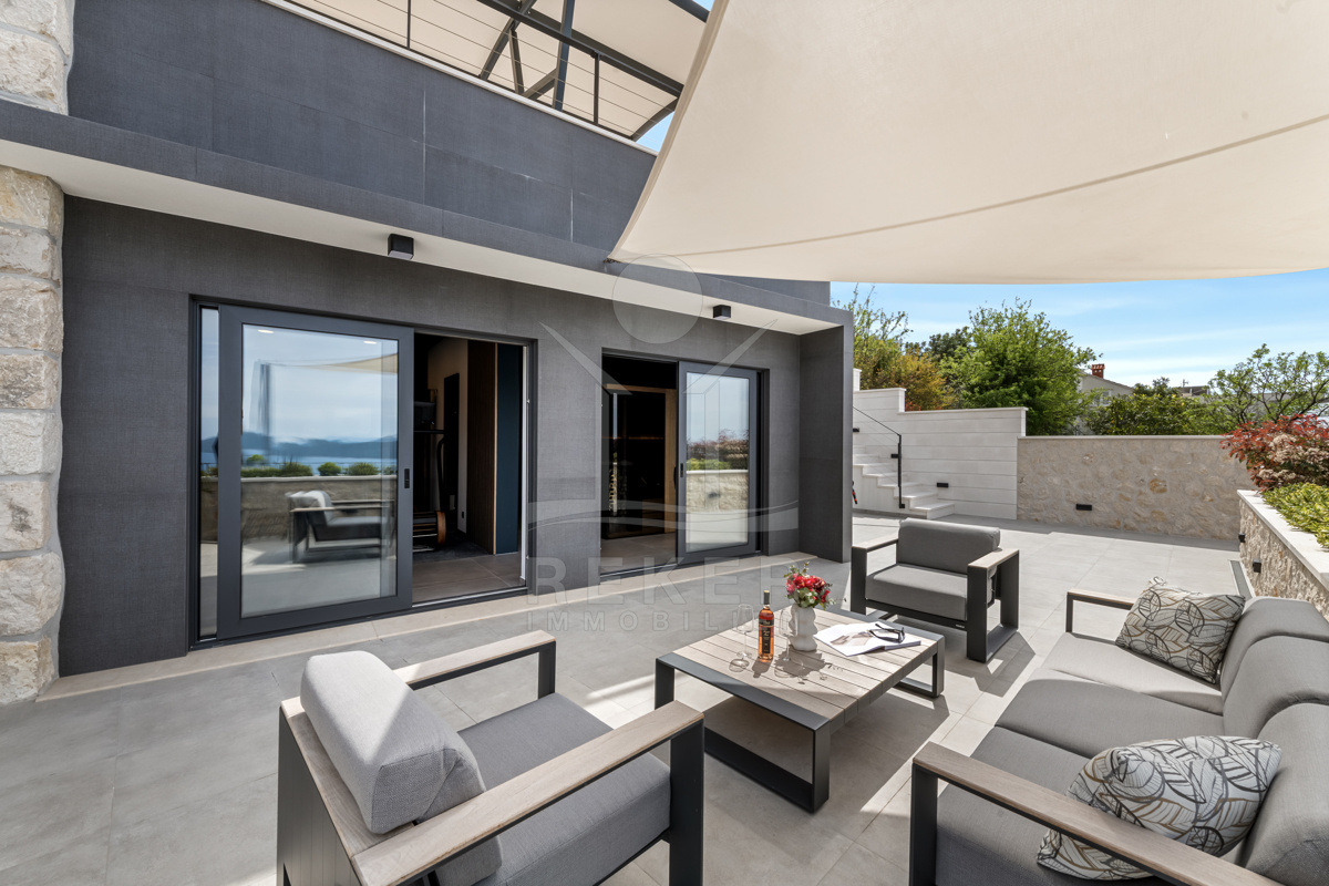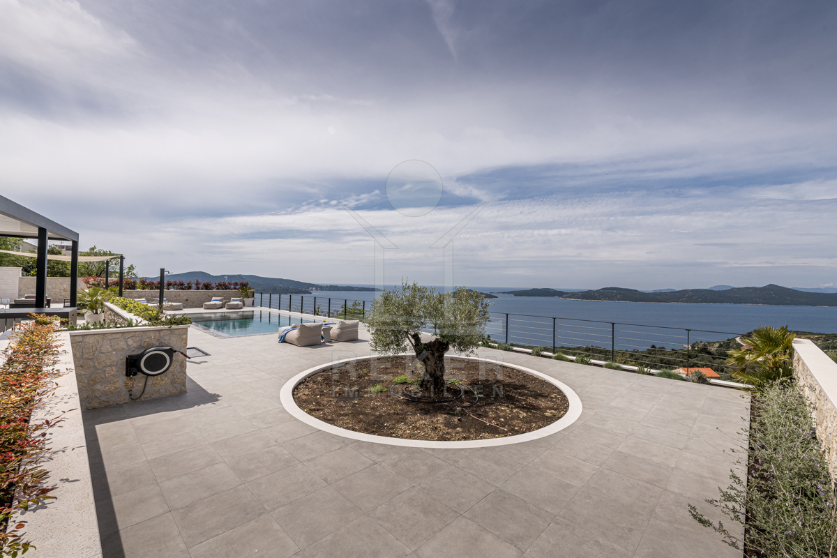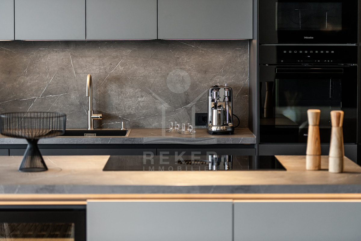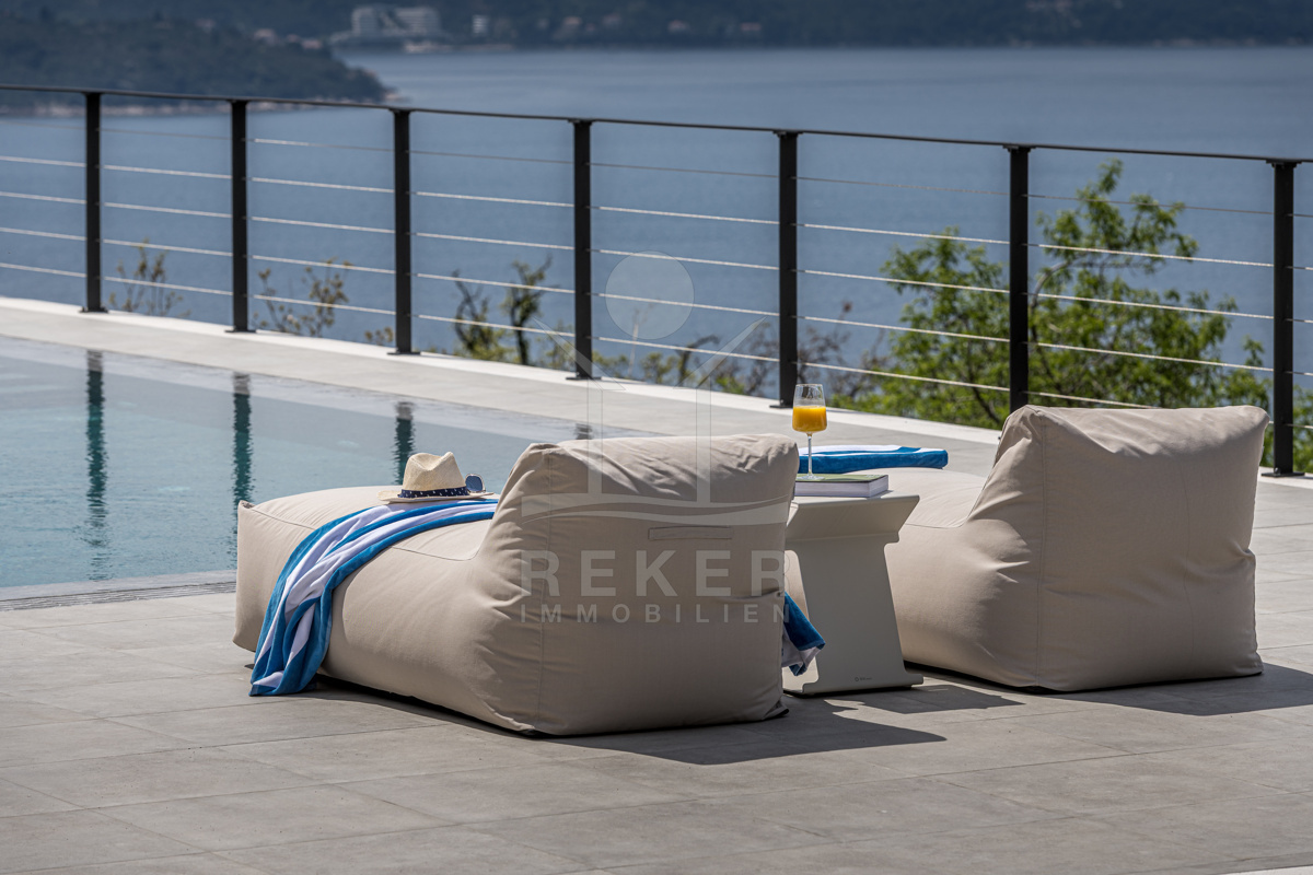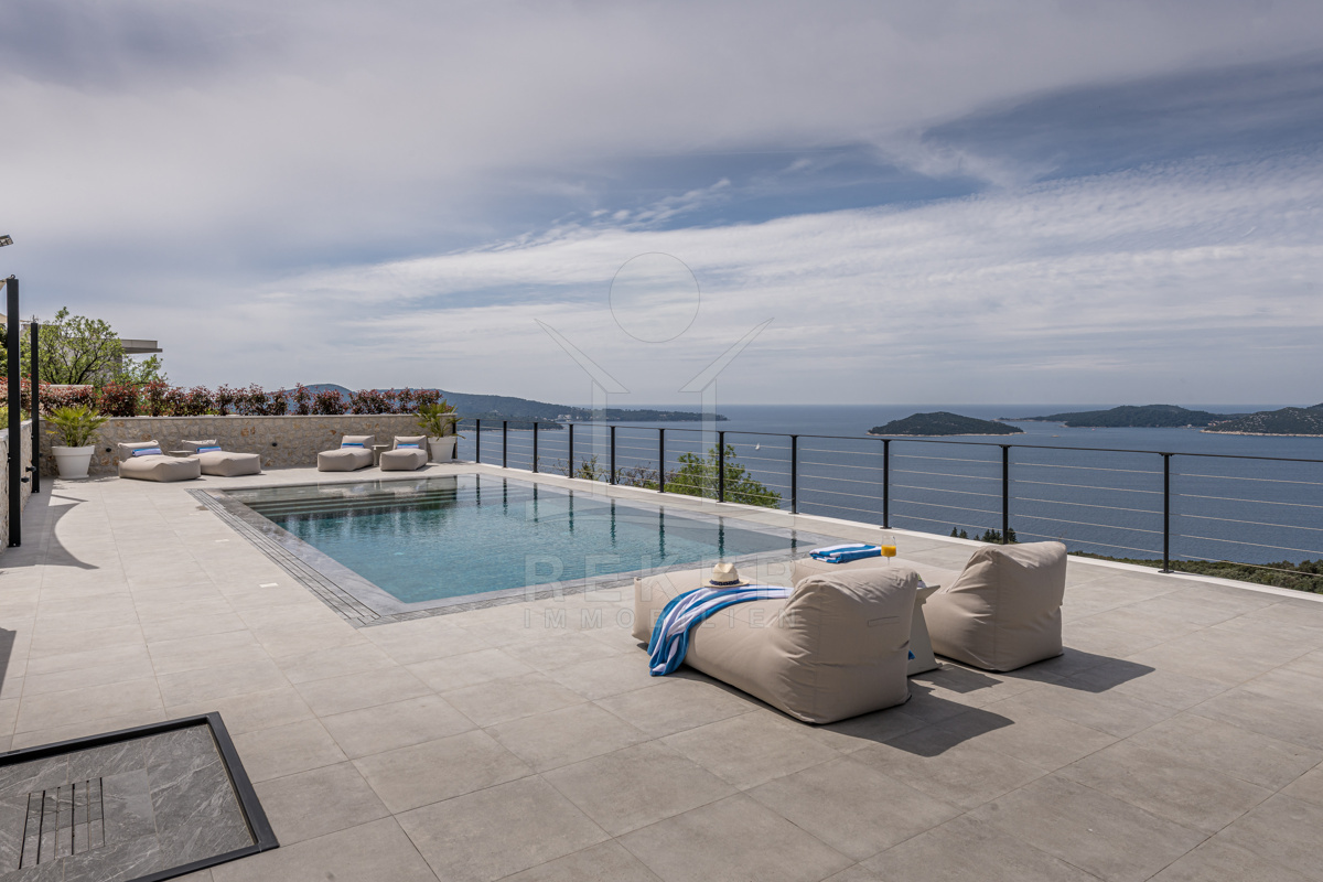 Das rund 1.000 m² große Grundstück ist mit mediterranen Pflanzen gestaltet und bietet zahlreiche Möglichkeiten zum Entspannen im Freien. Mehrere großzügige Terrassen, teilweise überdacht, schaffen unterschiedliche Bereiche – von der gemütlichen Lounge-Ecke bis zum Essplatz im Freien. Das Herzstück ist der Infinity-Pool, der beheizt werden kann und sich mit türkisfarbenem Wasser in die Aussicht aufs Meer einfügt. Eine voll ausgestattete Außenküche macht Grillabende oder Dinnerpartys unter freiem Himmel zum Vergnügen.