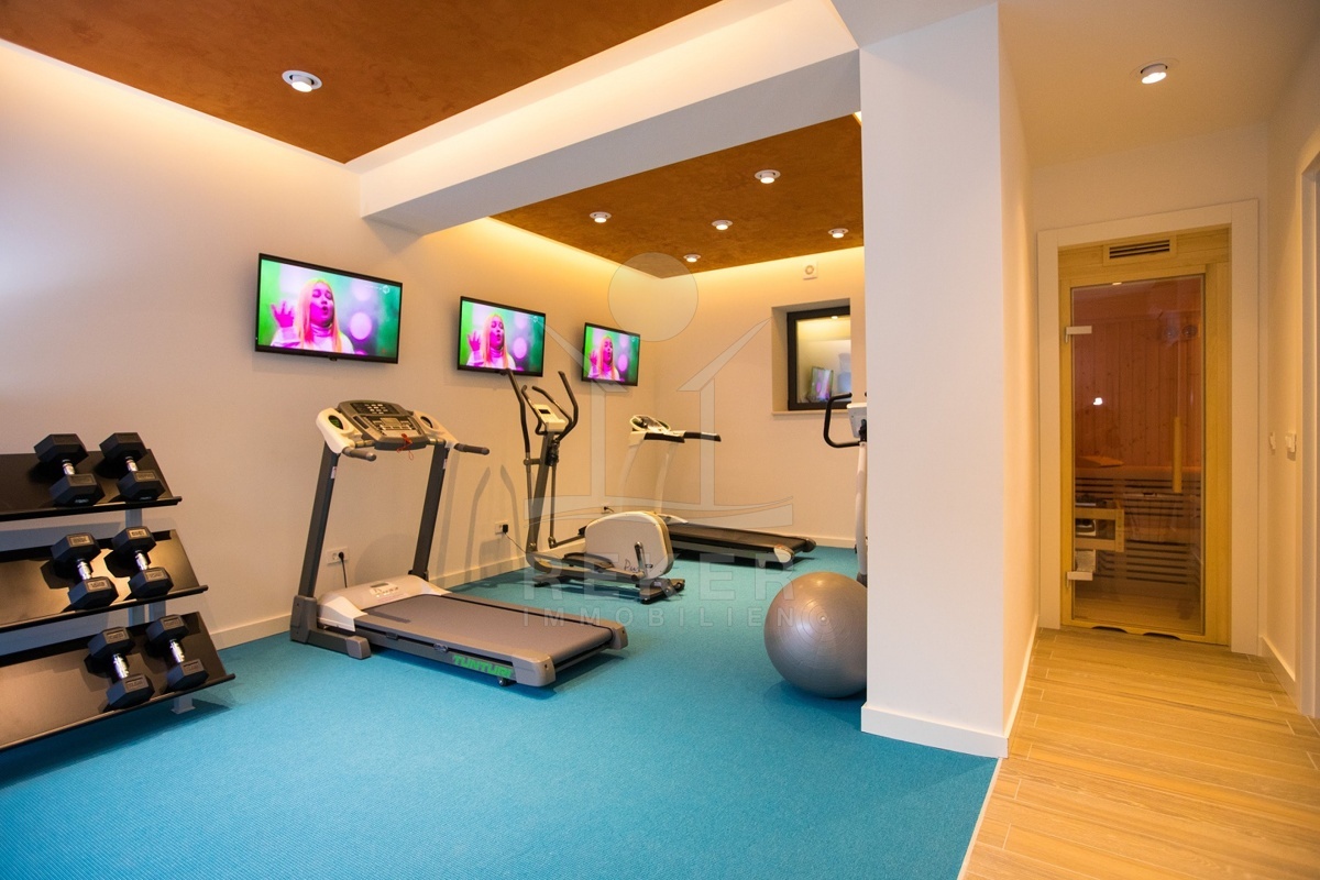 Innen überzeugt das Anwesen mit Vielfalt. Insgesamt gibt es 12 Schlafzimmer und 10 Badezimmer. Die Villa beherbergt eine großzügige Wohneinheit mit vier Schlafzimmern. Das Mehrfamilienhaus bietet acht Apartments, die Komfort und Privatsphäre vereinen. Dazu kommen ein Wellnesscenter mit Sauna, Fitnessraum und Whirlpool, eine Rezeption, Personalunterkünfte sowie Service- und Küchenbereiche. Hochwertige Möbel, eine moderne Kücheninsel, Kamin, Fußbodenheizung und Sicherheitstechnik wie Videoüberwachung und Alarmanlage ergänzen die Ausstattung.