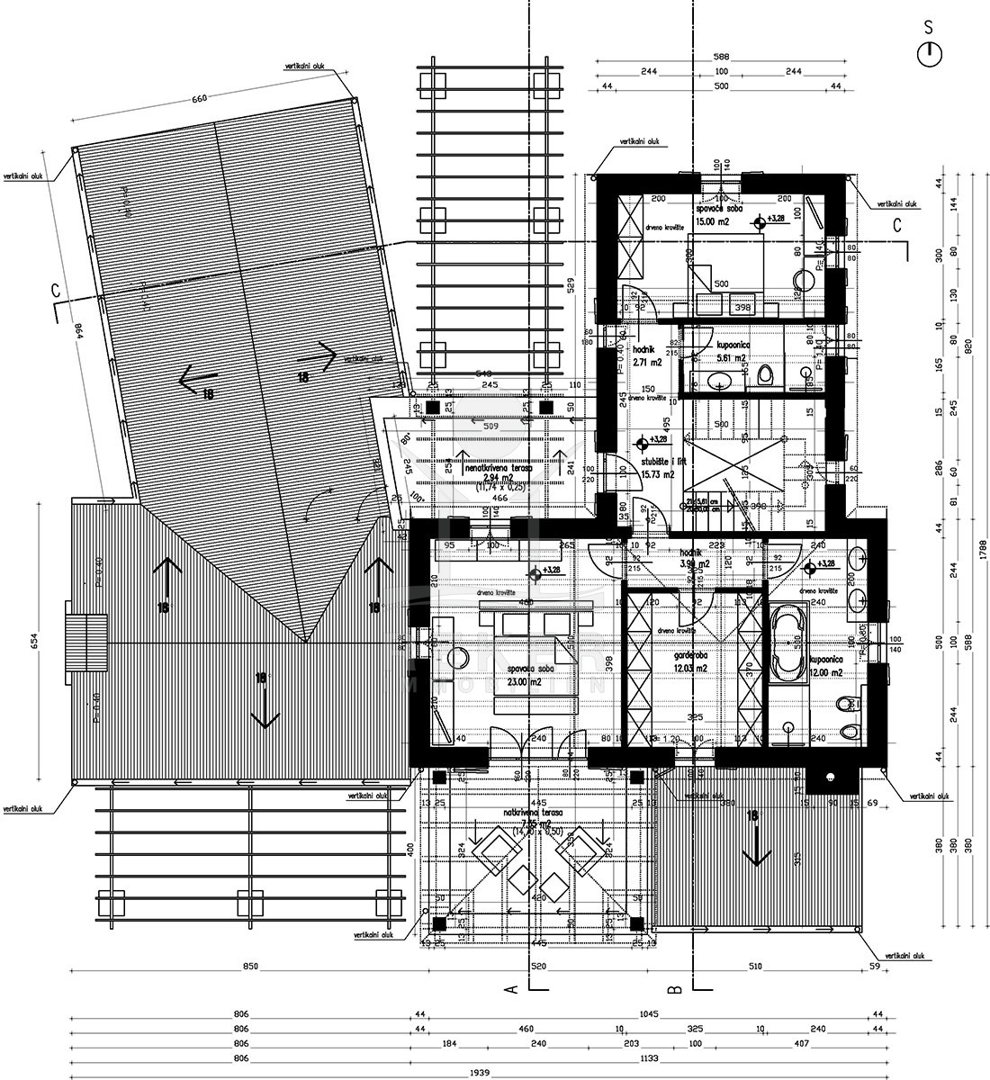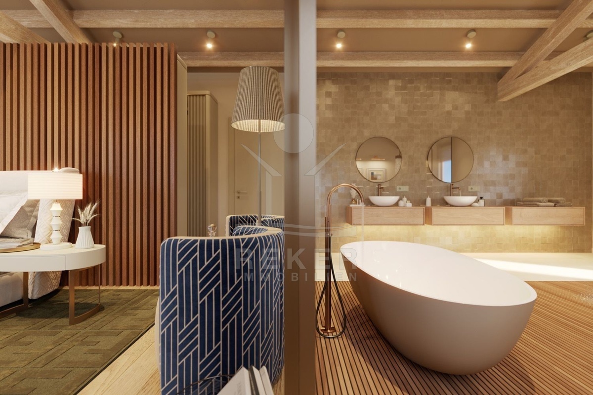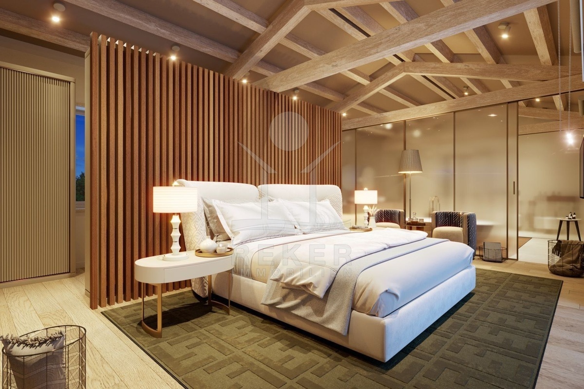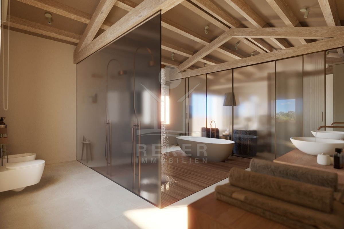 Im ersten Stock finden Sie drei Schlafzimmer, jeweils mit eigenem Badezimmer und Zugang zu zwei großen Terrassen im Stil der istrischen Balladura. Durch die zahlreichen Glaswände wird eine natürliche Beleuchtung und eine luftige Atmosphäre gewährleistet. Die überdachten Terrassen bieten einen einzigartigen Blick auf das Meer und die umliegende Natur. Genießen Sie den Komfort und die Ruhe dieser einzigartigen Mikrolage.