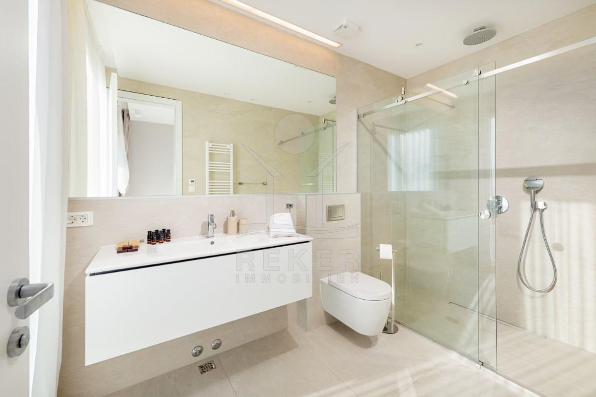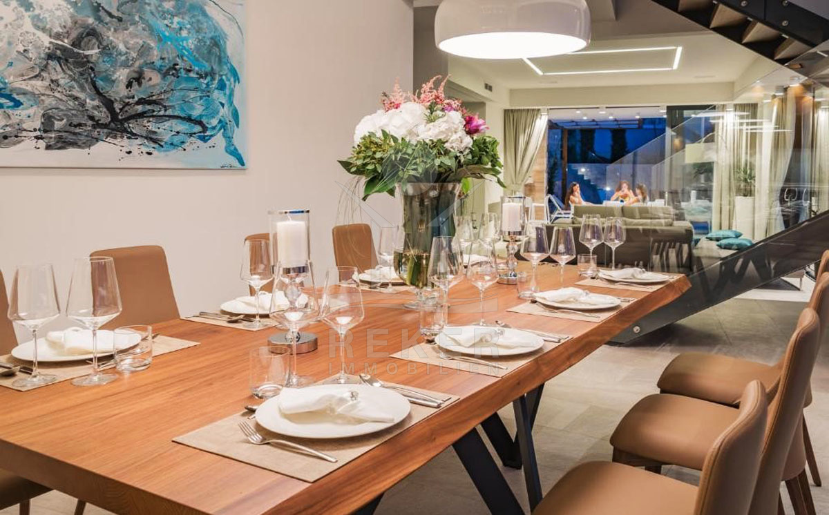 Die beeindruckende Villa wird vollständig mit exquisiten Möbeln möbliert verkauft. Beim Betreten werden Sie von einem stilvollen Eingangsbereich empfangen, der den offenen Wohn-, Ess- und Küchenbereich mit harmonischem Design verbindet. Ein ideales Ambiente für gesellige Abende und entspannte Familienmomente.