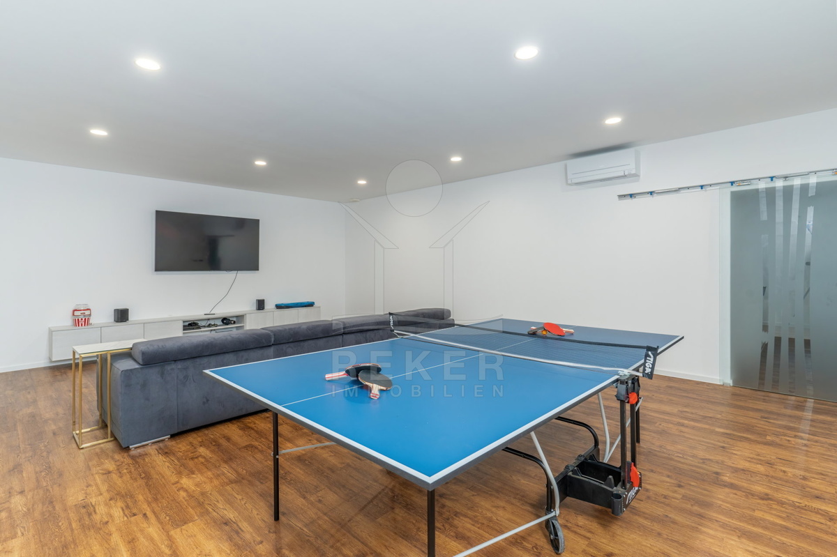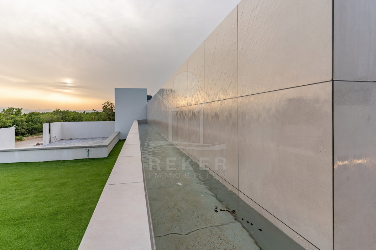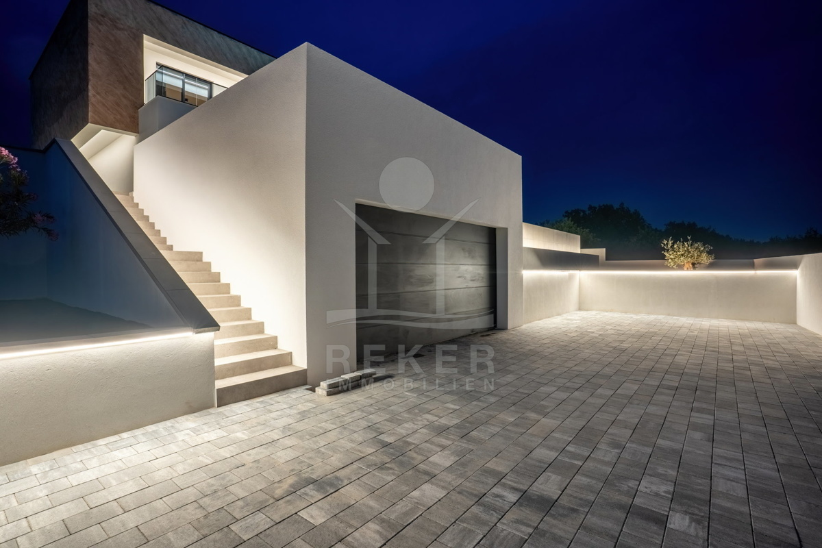 Die Terrasse der Luxusvilla ist ein wahres Juwel der Erholung. Der große Garten und der Infinity-Pool mit einer Größe von 55 m² bieten einen beeindruckenden Blick auf das offene Meer. Das Sonnendeck lädt zu entspannten Momenten in der Sonne ein. Hier können Sie sommerliche Abende genießen und sich entspannen, während Sie den Blick auf das Meer und die Umgebung genießen. Eine überdachte Bereich mit einer Sitzlounge bietet Ihnen außerdem einen gemütlichen Platz zum Entspannen im Freien. Eine Garage und Außenparkplätze stehen für Sie zur Verfügung. Diese Villa bietet absolute Privatsphäre und ist eine Investition in höchsten Luxus und höchsten Komfort.