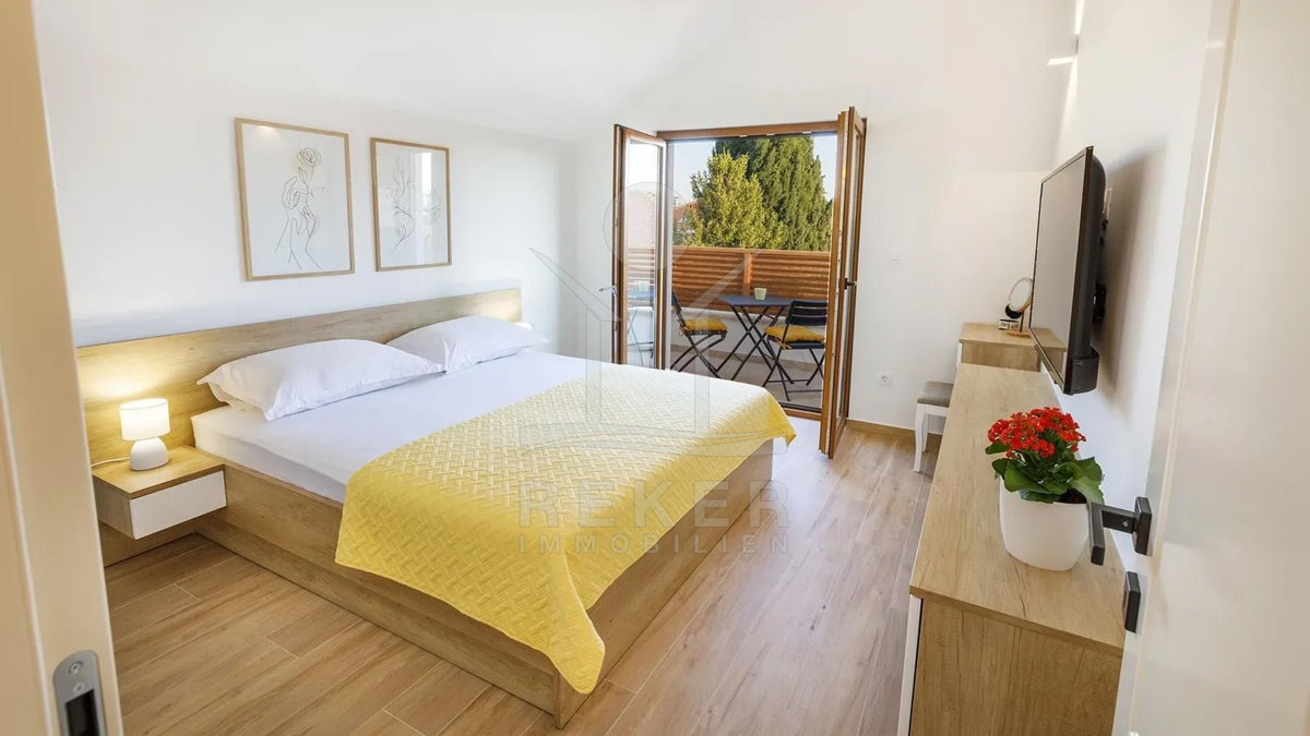 Innen überzeugt die Villa mit durchdachter Raumaufteilung: Drei Etagen, sieben Schlafzimmer – sechs davon mit eigenem Bad. Ideal, wenn Sie Gäste haben oder vermieten möchten. Im Erdgeschoss finden Sie eine komplett ausgestattete Einliegerwohnung. Im Obergeschoss wohnen, essen und kochen Sie mit Meerblick. Ein Balkon bringt Licht und Luft ins Haus. Ganz oben liegen drei weitere Schlafzimmer, eines mit privatem Balkon – perfekt als Rückzugsort. Alles ist hochwertig ausgestattet, klimatisiert und mit Fußbodenheizung versehen. Sie können sofort einziehen – oder sofort vermieten.
