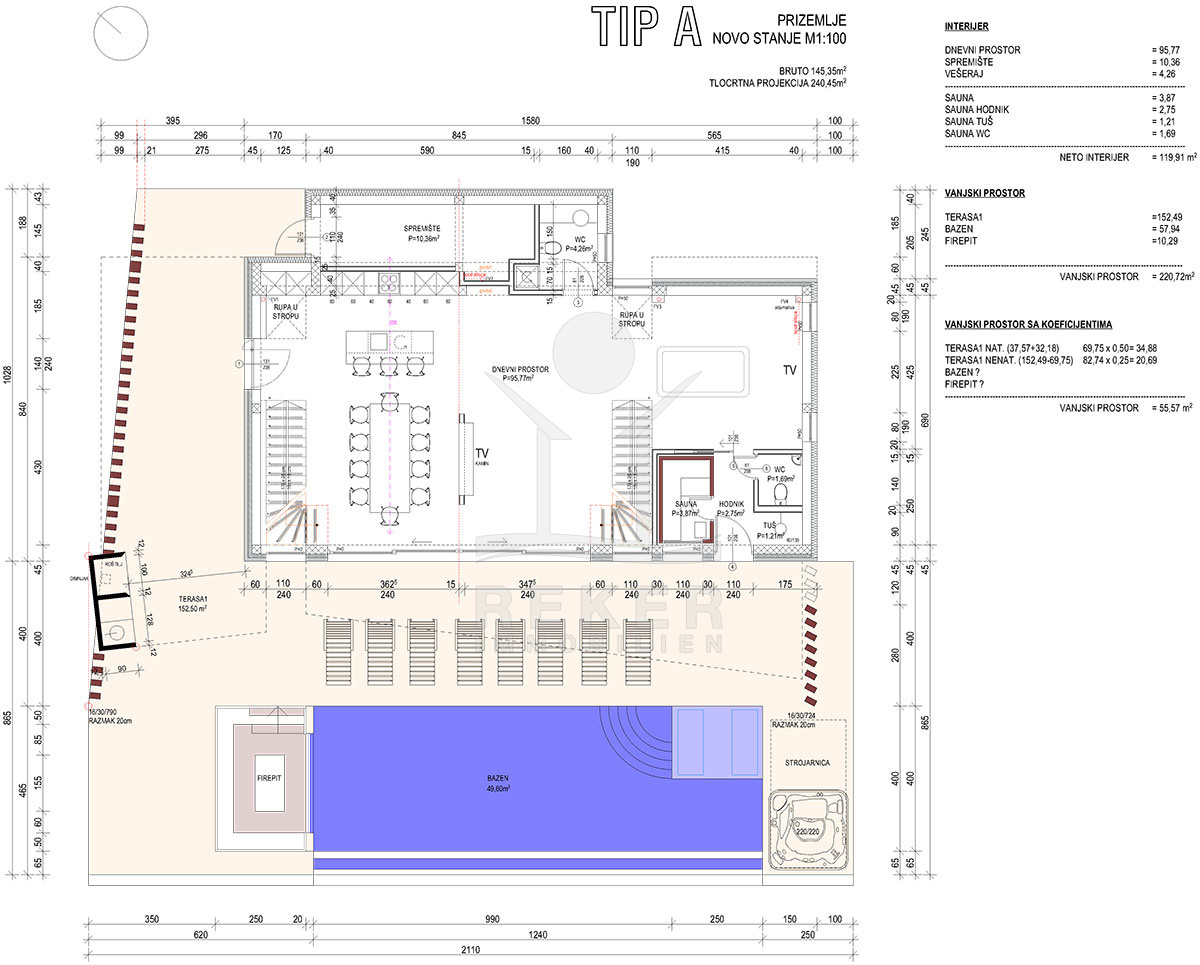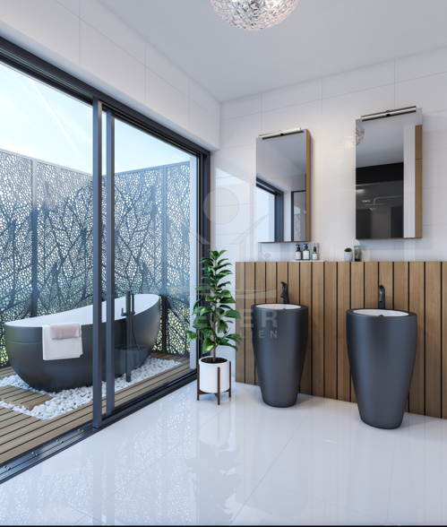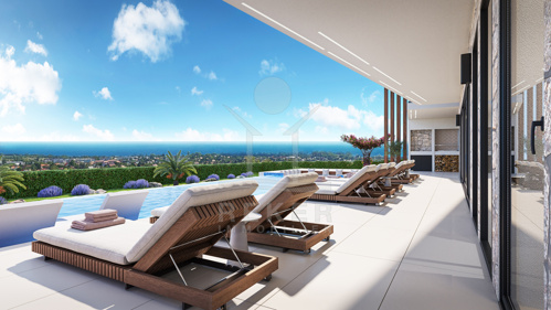 Die ausgedehnte Terrasse mit ist ein wahrer Traum, der Luxus und Entspannung vereint. Der atemberaubende Infinity-Pool mit Größe von 50 m², dessen eine Wand aus transparentem Glas besteht, ist das Zentrum der Terrasse. Neben dem Pool befindet sich eine eingebaute Feuerstelle 10 m² mit Sitzgelegenheiten, die für wunderbare Events und romantische Abende sorgt. Der Pool und der Whirlpool bieten eine absolute Entspannung und ermöglichen es Ihnen, den Alltag zu vergessen. Diese Terrasse bietet ein umfassendes Erlebnis und ist der perfekte Ort, um die Zeit in Gesellschaft zu genießen. Parkplätze für vier Fahrzeuge stehen ebenfalls zur Verfügung, um Ihren Komfort zu gewährleisten. Willkommen in Ihrem luxuriösen Zuhause!