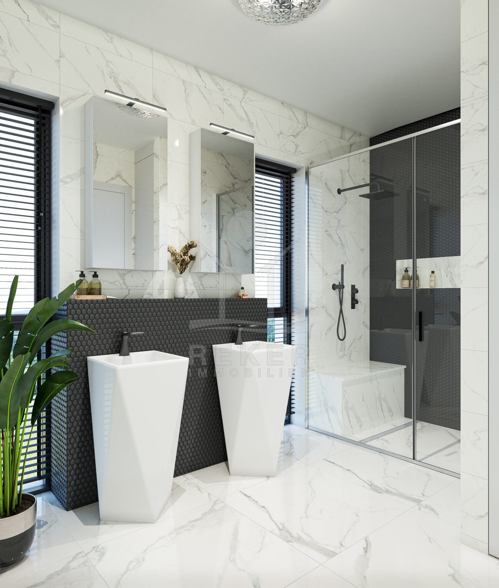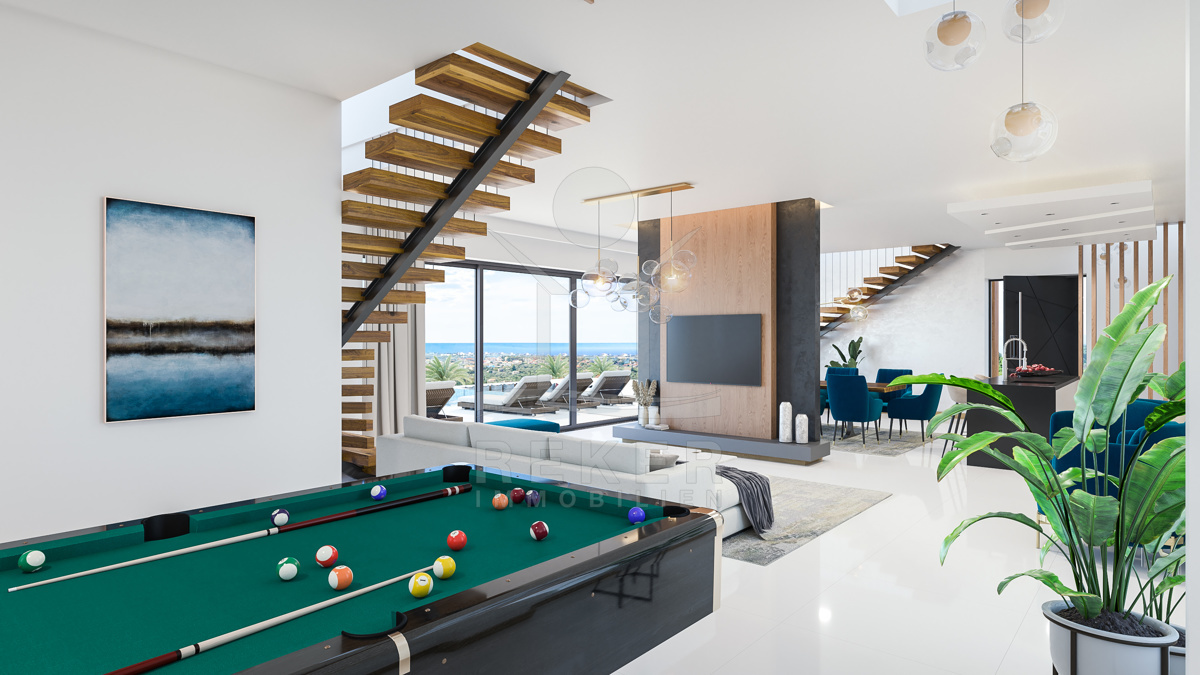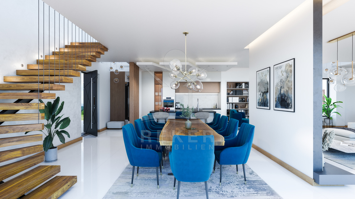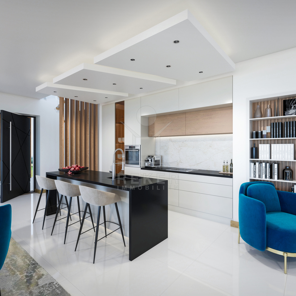 Die Anlage bietet modernes Wohnen auf höchstem Niveau, ausgestattet mit Fußbodenheizung und Kühlung durch eine effiziente Wärmepumpe und Ventilatorkonventoren. Im Erdgeschoss erwartet Sie ein offener Grundriss mit einem harmonisch gestalteten Wohn- und Essbereich sowie einer modernen Küche. Ein Highlight ist die Billardstelle, die für Unterhaltung und Spaß sorgt. Ein Gäste-WC und eine finnische Sauna bieten zudem Entspannung und Erholung vom stressigen Alltag.