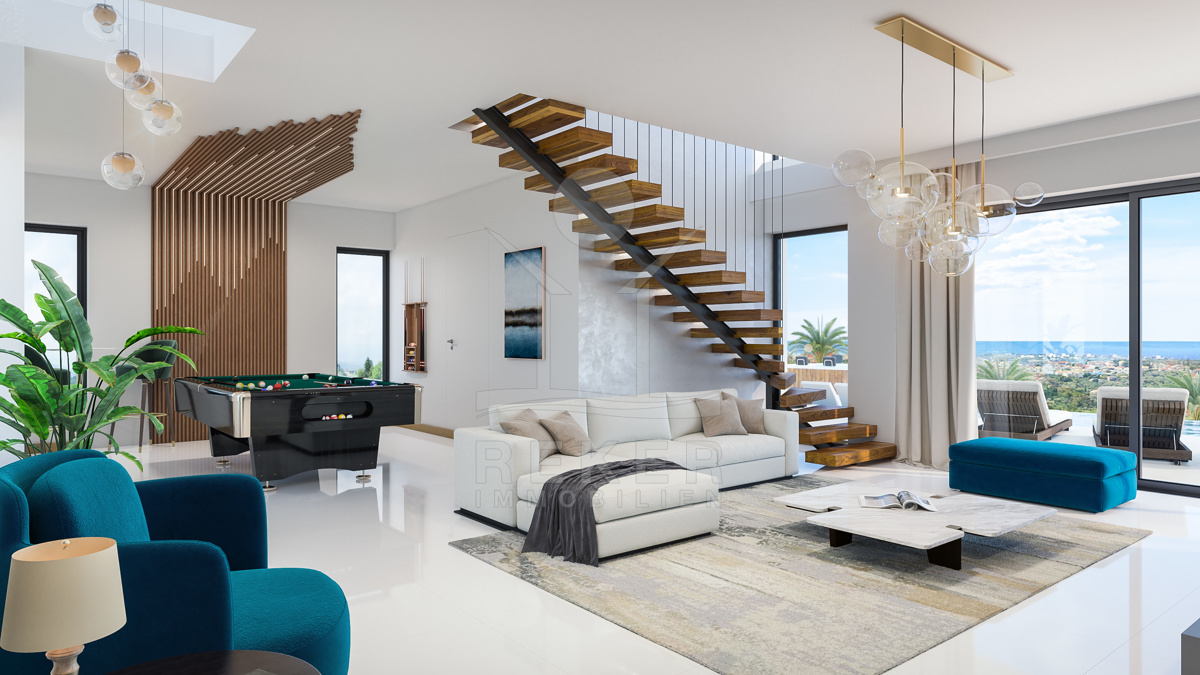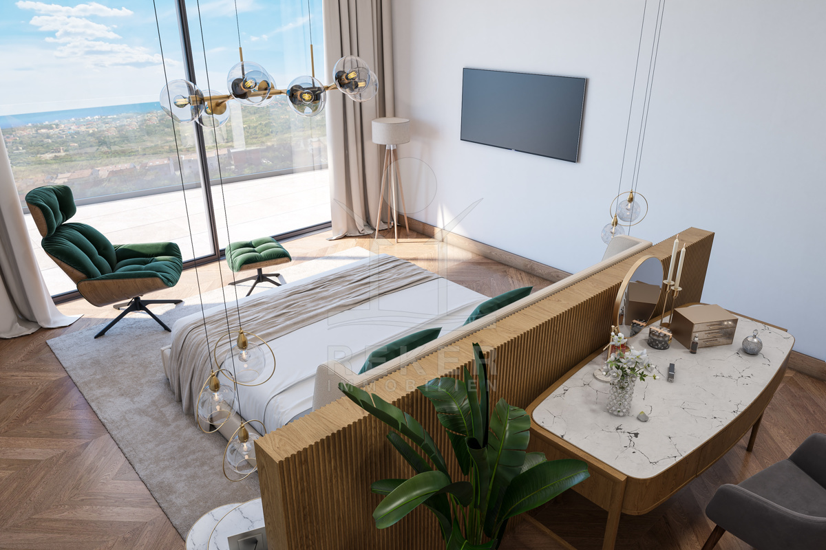 Über eine doppelte Innentreppe gelangen Sie in den ersten Stock, der mit seinen atemberaubenden Ausblicken auf das Meer und die wunderbare Landschaft beeindruckt. Vier Schlafzimmer, jeweils mit eigenem Badezimmer, bieten Platz für erholsame Nächte und private Rückzugsmöglichkeiten. Die verglasten Geländer geben den Balkonen einen besonderen Charme. Zwei Badezimmer verfügen über offene Balkone und Badewannen, die von allen Seiten einsehbar sind.