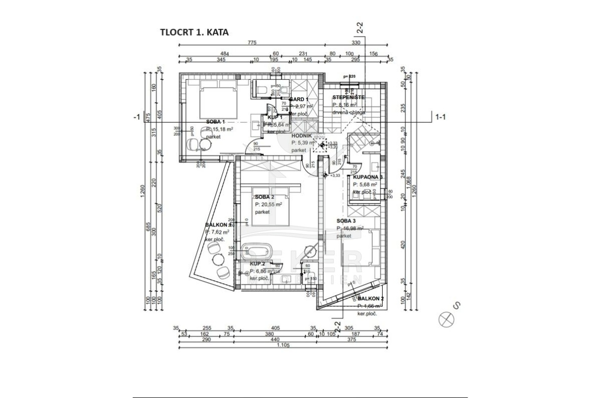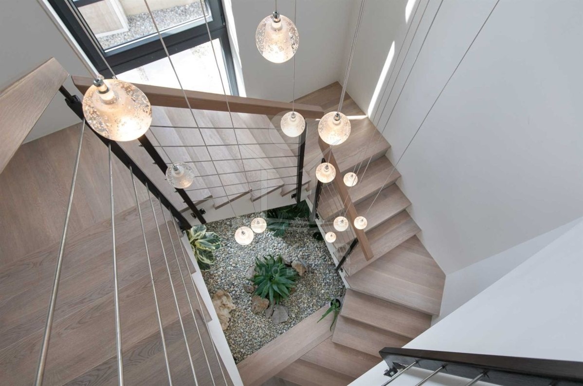Eine interne Treppe führt Sie in den oberen Stock, wo Sie von einem beeindruckenden, hellen Treppenhaus empfangen werden. Der 1. Stock verfügt über drei Schlafzimmer, jedes mit eigenem Bad und Kleiderschrank, sodass Sie hier eine luxuriöse Privatsphäre genießen können. Zwei Balkone bieten zudem eine herrliche Aussicht und sorgen für zusätzlichen Komfort und Entspannungsmöglichkeiten.
