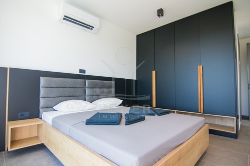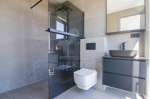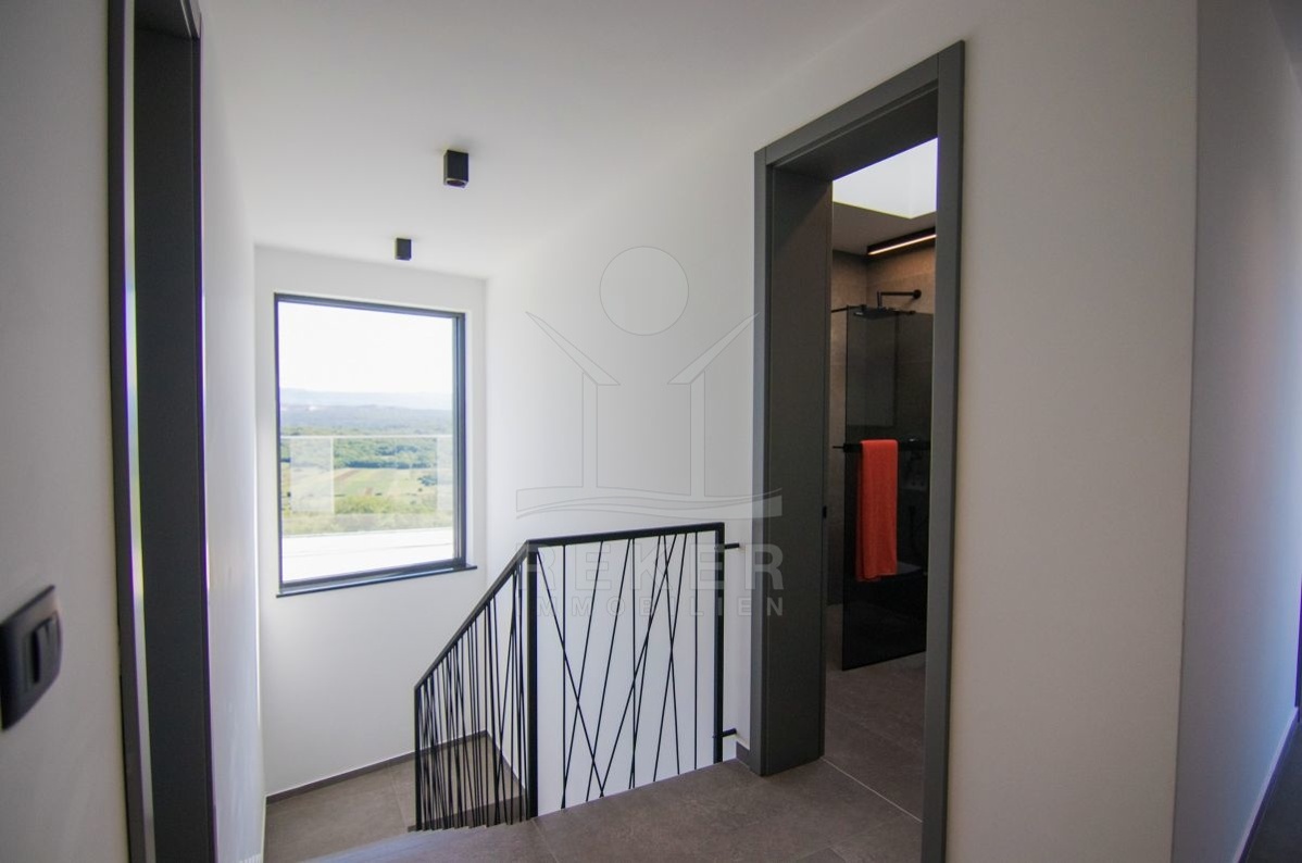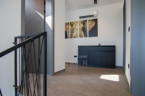 Im Obergeschoss befinden sich vier großzügige Schlafzimmer – jedes mit eigenem Bad und Zugang zur Terrasse. Die Glasbrüstung sorgt für freie Sicht auf das Panorama. Die Ausstattung im ganzen Haus ist hochwertig: Fußbodenheizung über Wärmepumpe, Klimaanlagen in allen Räumen, moderne LED-Spots und viel Tageslicht.