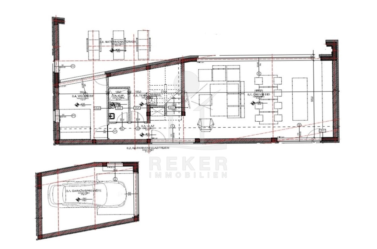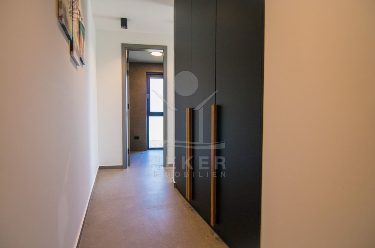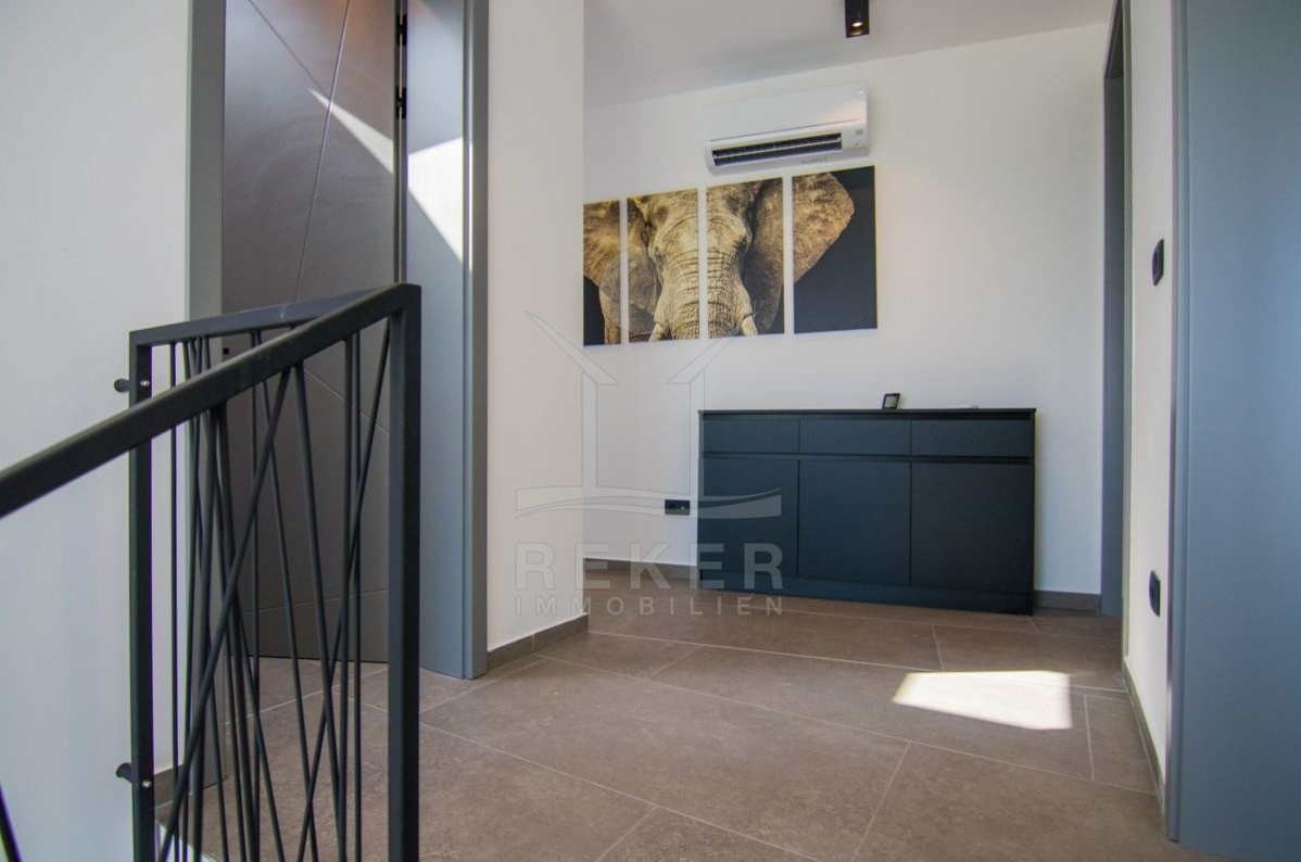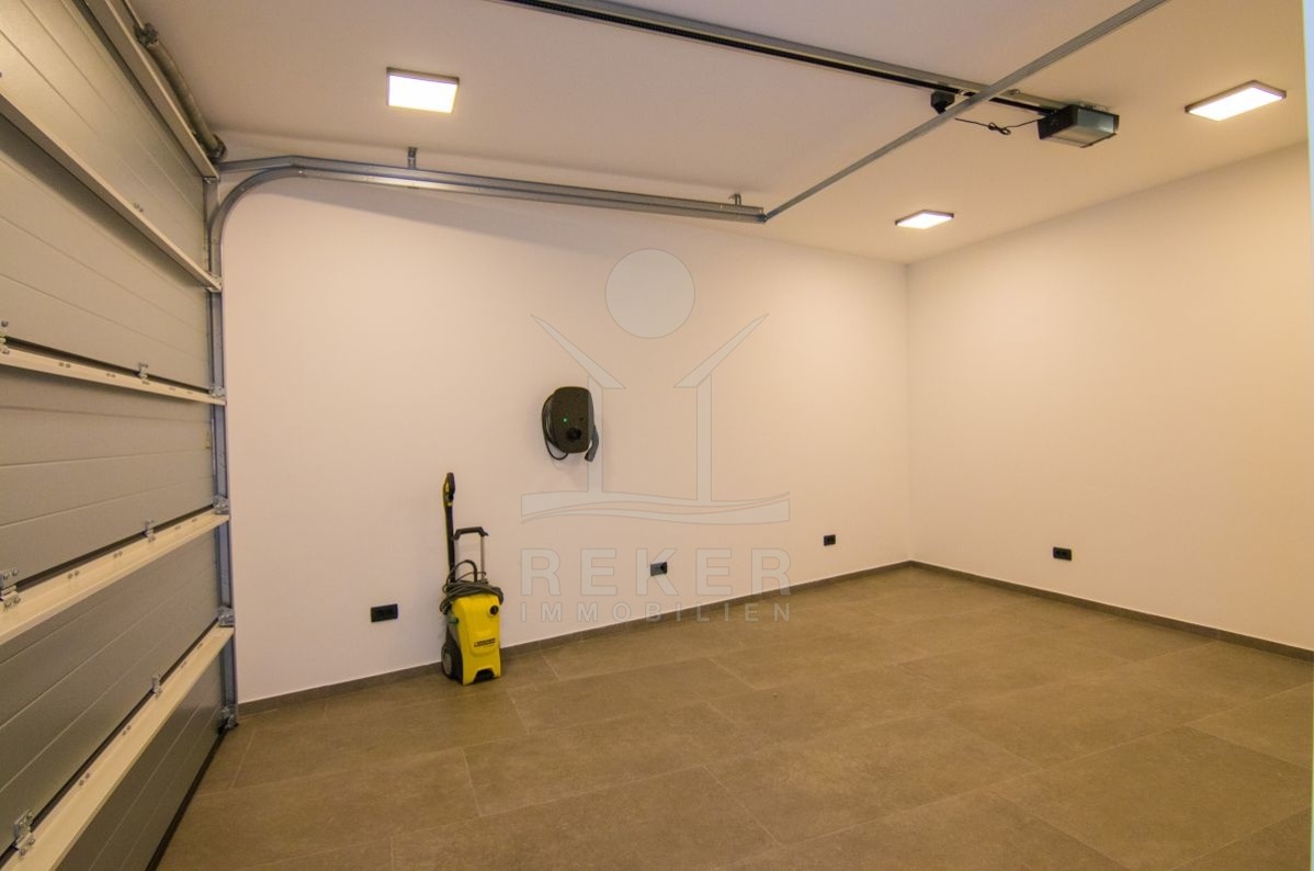 Ruhige Lage in den grünen Hügeln oberhalb der Stadt Krk. Nur zehn Minuten vom Meer und dem Ortskern entfernt – mit dem Auto schnell alles erreichbar, aber angenehm abseits vom Trubel. Die Umgebung ist locker bebaut, mit neuen Villen und mediterranem Flair. Zwei Stellplätze auf dem Grundstück, zusätzlich eine integrierte Garage mit Zugang ins Haus.
