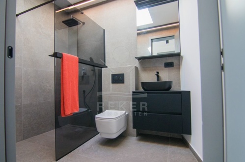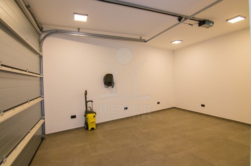 Innen erwarten Sie klare Linien, hochwertige Materialien und viel Raum. Das Erdgeschoss ist offen gestaltet: Wohnzimmer, Essbereich und Design-Küche in mattem Schwarz gehen fließend ineinander über. Die großen Fensterfronten öffnen sich komplett zur Terrasse. Im Erdgeschoss gibt’s außerdem einen Fitnessraum, einen Wäscheraum, ein Gäste-WC und den Zugang zur Garage.