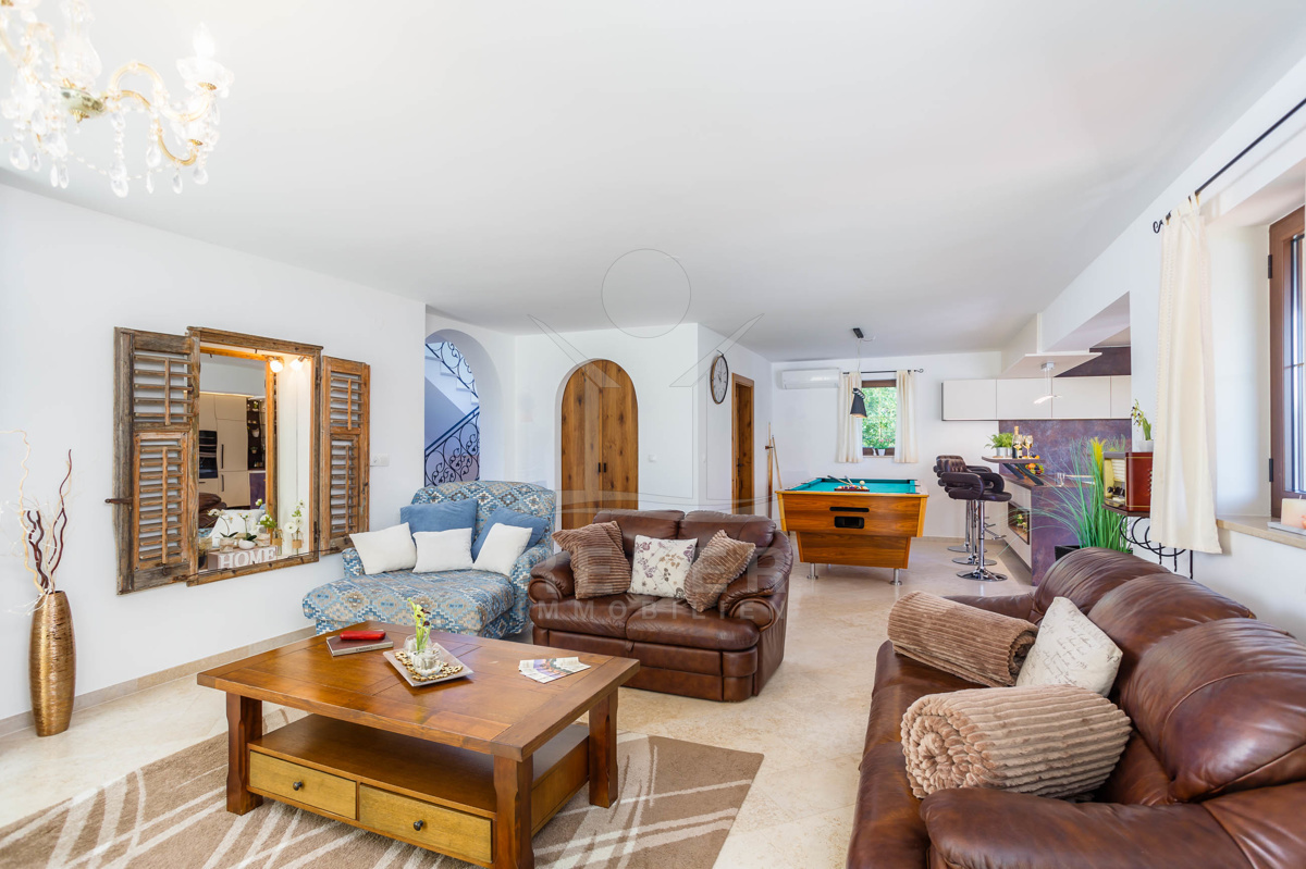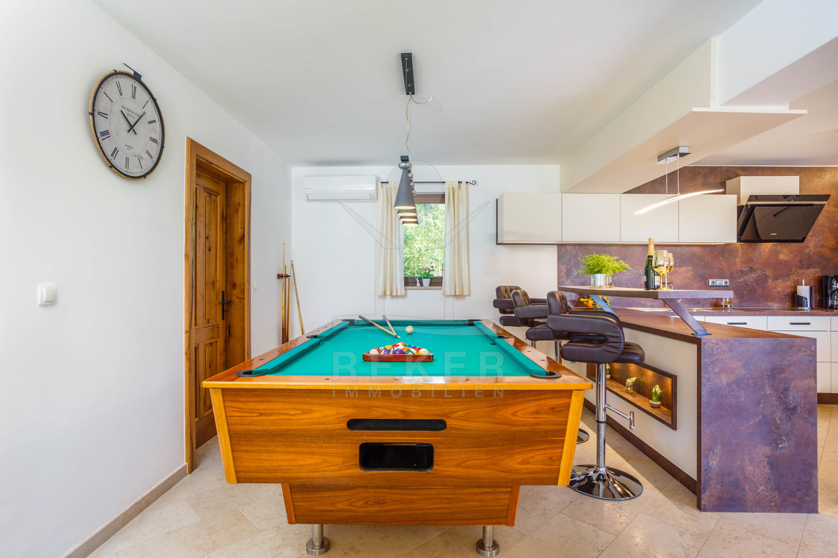 Großzügiger Wohn- Essbereich mit offener Küche und Billiardtisch