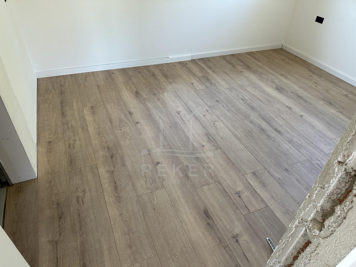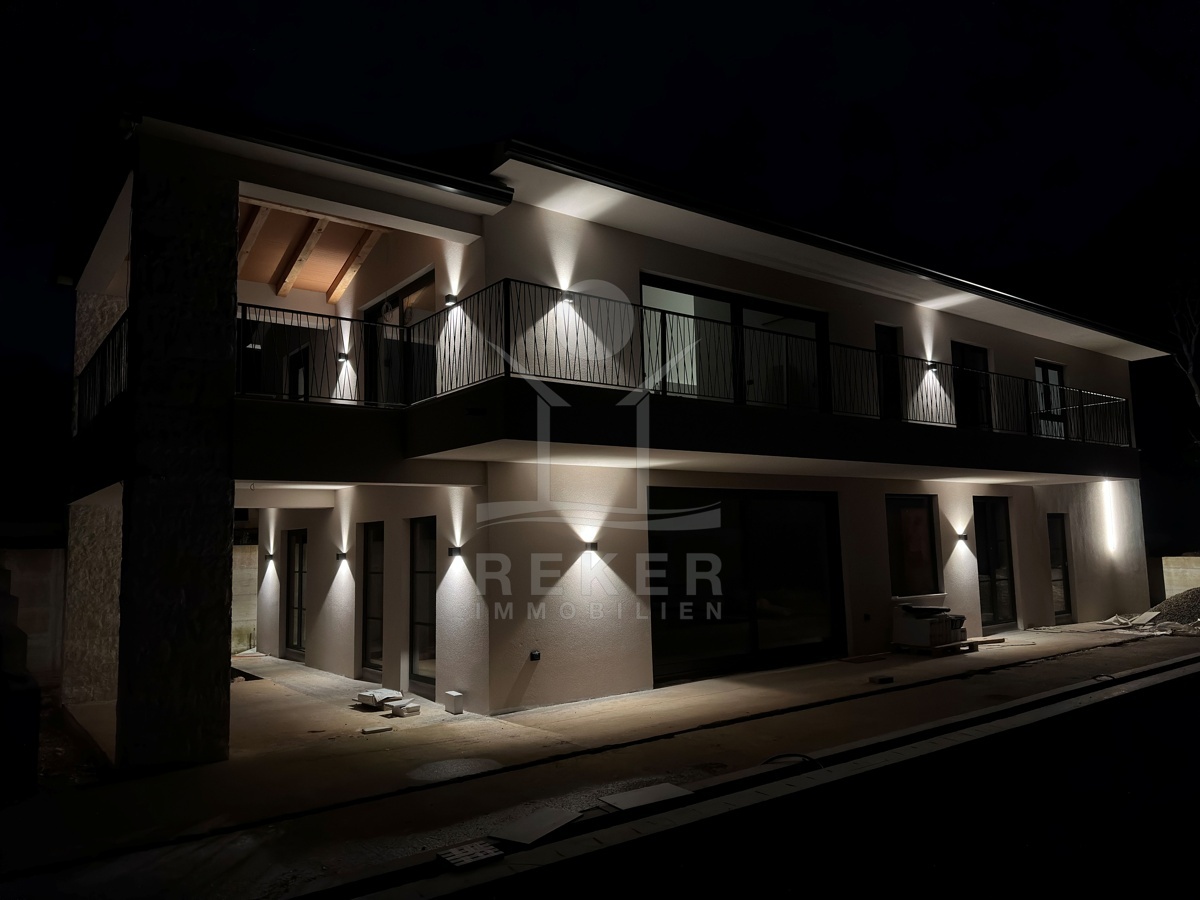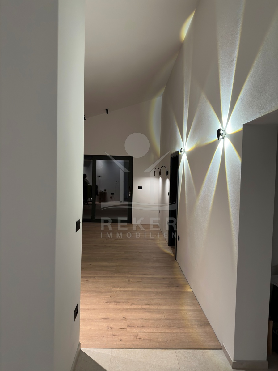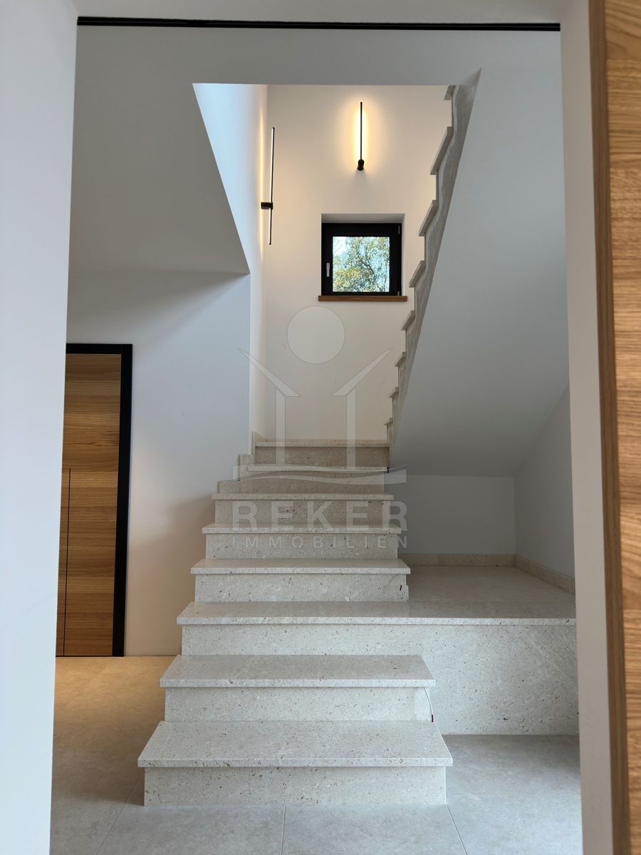 Die Ausstattung erfüllt höchste Ansprüche. Fußbodenheizung in Kombination mit Wärmepumpe sorgt für ein angenehmes Klima, Klimaanlagen in allen Wohn- und Schlafräumen ergänzen den Komfort. Ein Security-System schützt die Außenbereiche. Teile der Innen- und Außenbeleuchtung sind bereits montiert. Fenster, Balkon- und Eingangstüren bestehen aus anthrazitfarbenem Aluminium mit 3-fach-Verglasung. Süd- und Schlafzimmeröffnungen sind mit Rollläden und Insektenschutz versehen. Die Innentüren aus Eiche mit anthrazitfarbener Zarge runden das elegante Gesamtbild ab.
