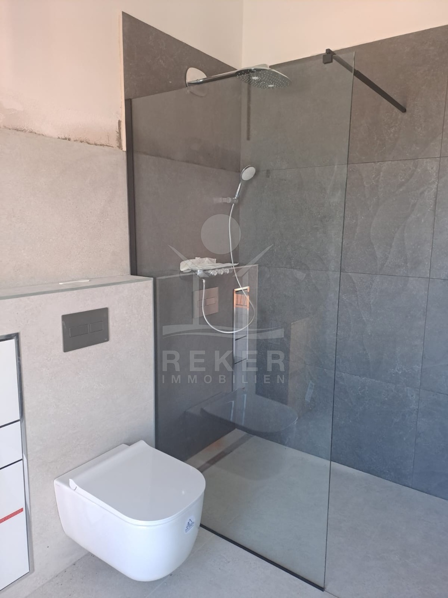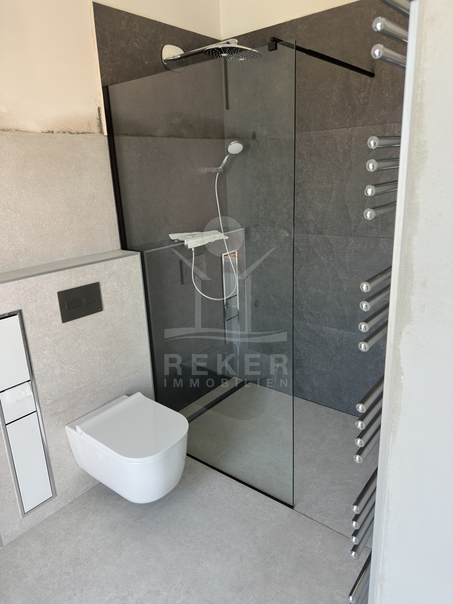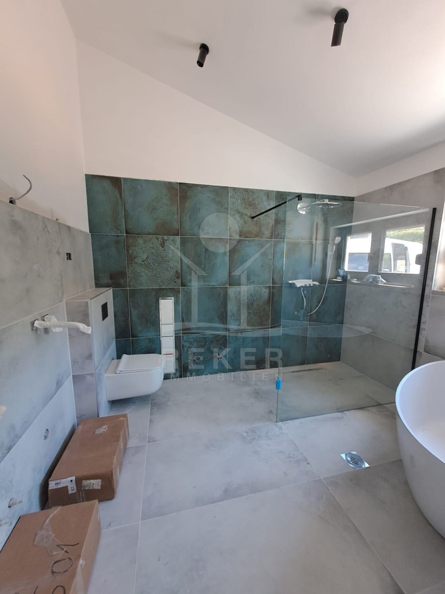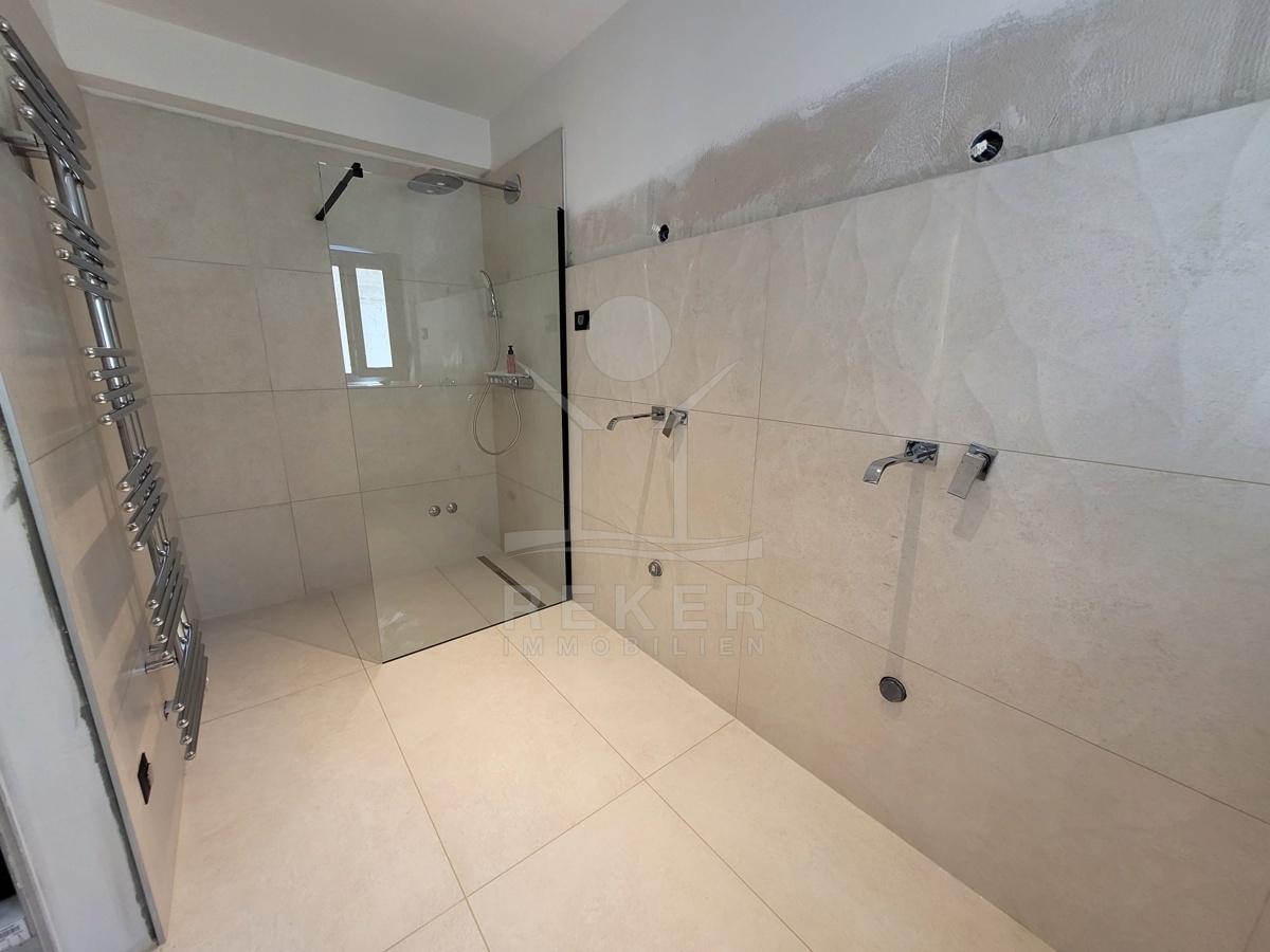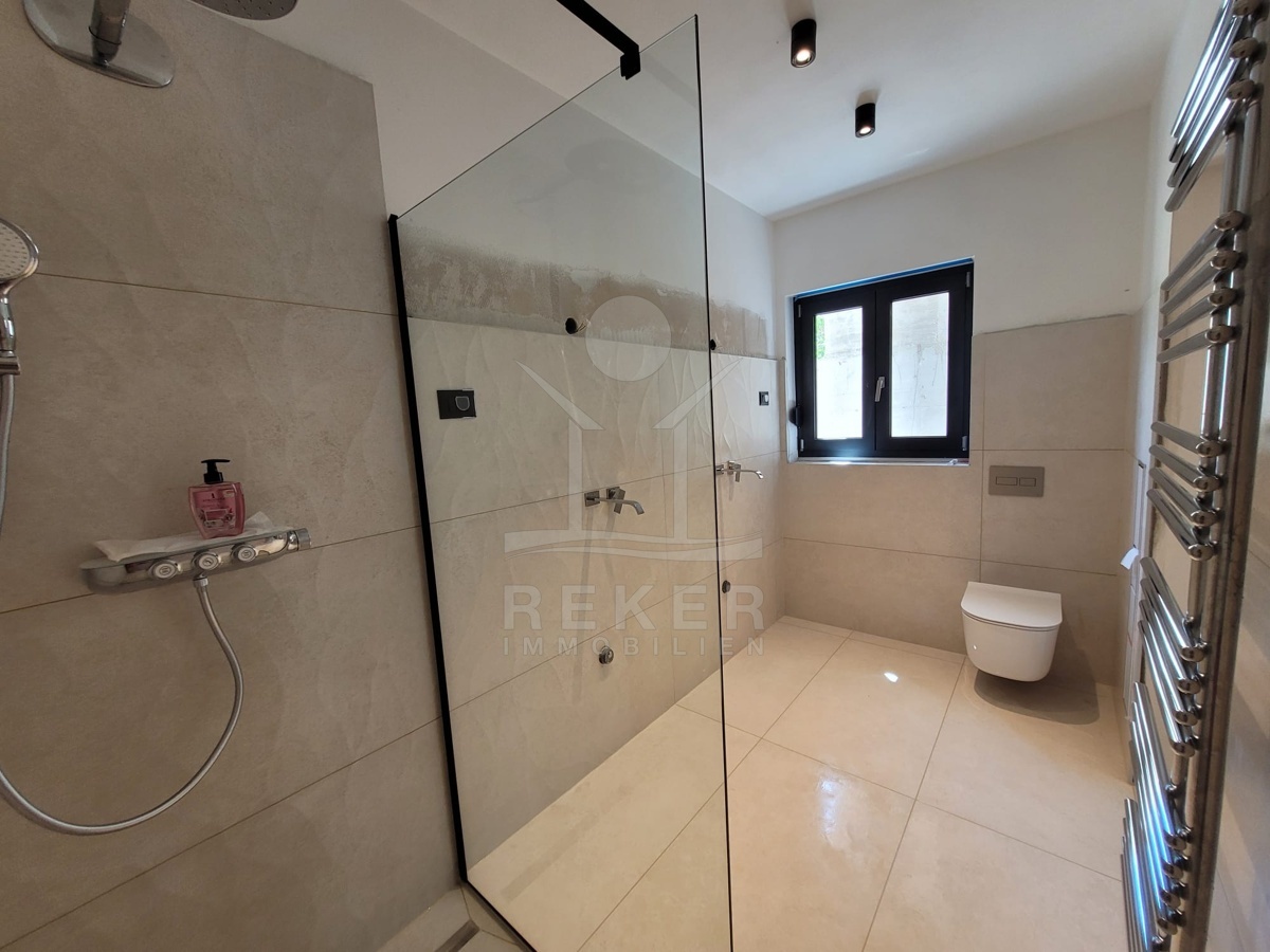 Das Obergeschoss bietet drei weitere Schlafzimmer, alle mit eigenem Bad. Dazu kommen ein rund 30 m² großer Relaxbereich sowie eine praktische Waschküche. Zwei Balkone mit 15 m² und 38 m², teils überdacht, öffnen sich Richtung Meer. Frühstück in der Sonne, ein Glas am Abend mit Blick auf die Bucht, was könnte schöner sein?