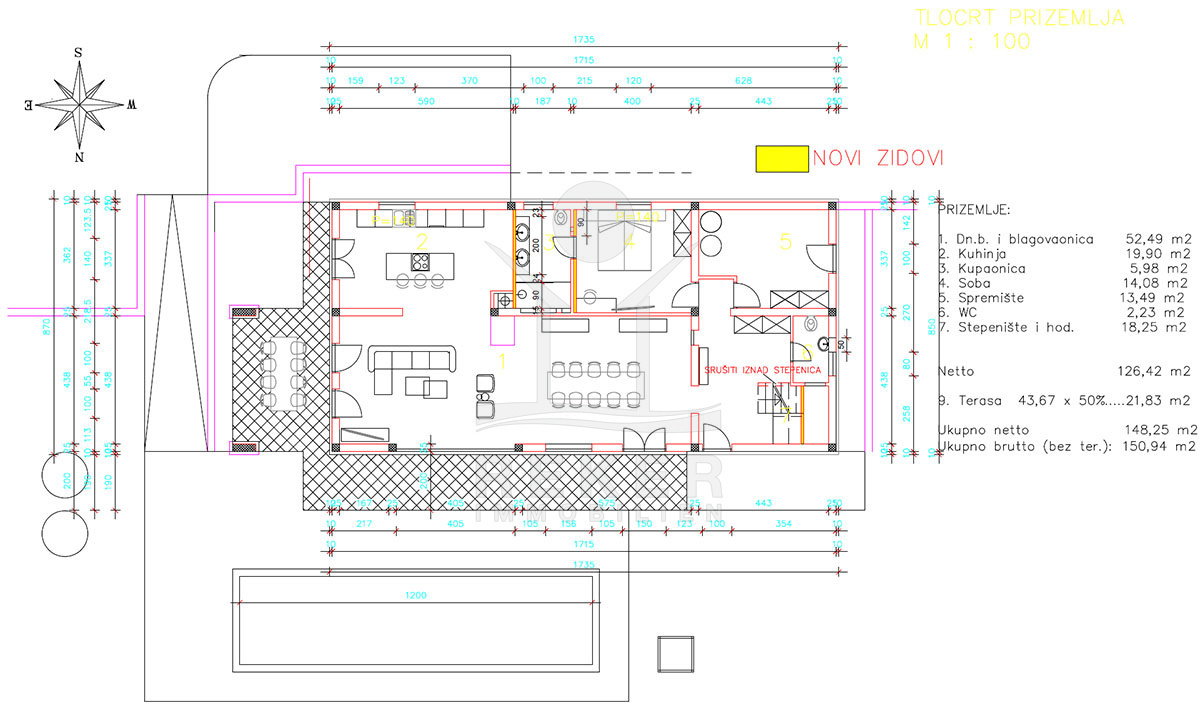 Der Außenbereich ist ganz auf entspannte Urlaubstage zugeschnitten. Direkt am Erdgeschoss öffnet sich eine 44 m² große, geflieste Terrasse. Geplant ist ein großzügiger, beheizbarer Salz-Überlaufpool (Innenmaß ca. 12 × 3 m) mit Mosaikfliesen, die bereits bereitliegen. Auch eine Außendusche ist vorgesehen. Anschlüsse für Strom und Leitungen ermöglichen den Bau einer Außenküche. Die Gartenbeleuchtung ist vorbereitet. Balkone und Terrassen sind hydroisoliert. Geländer bestehen aus verzinktem, schwarz lackiertem Eisen. Das Balkondach ist aus Holz und mit Betonpfannen gedeckt. Säulen und Eingangsbereich sind mit Naturstein verkleidet. Ein Mattenzaun ergänzt die Anlage.