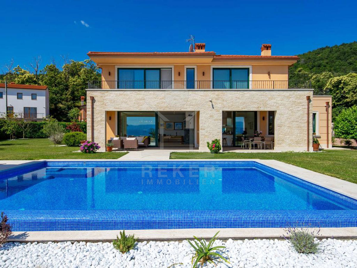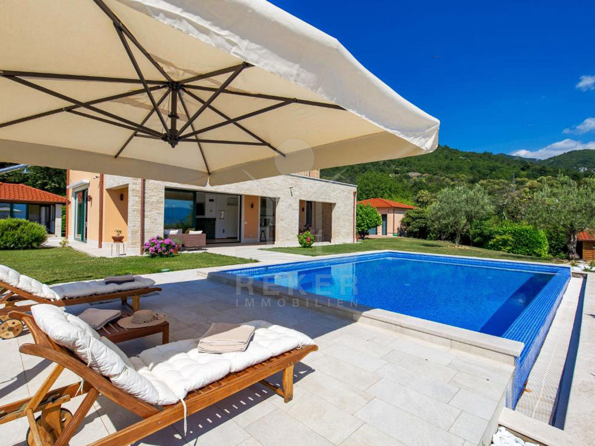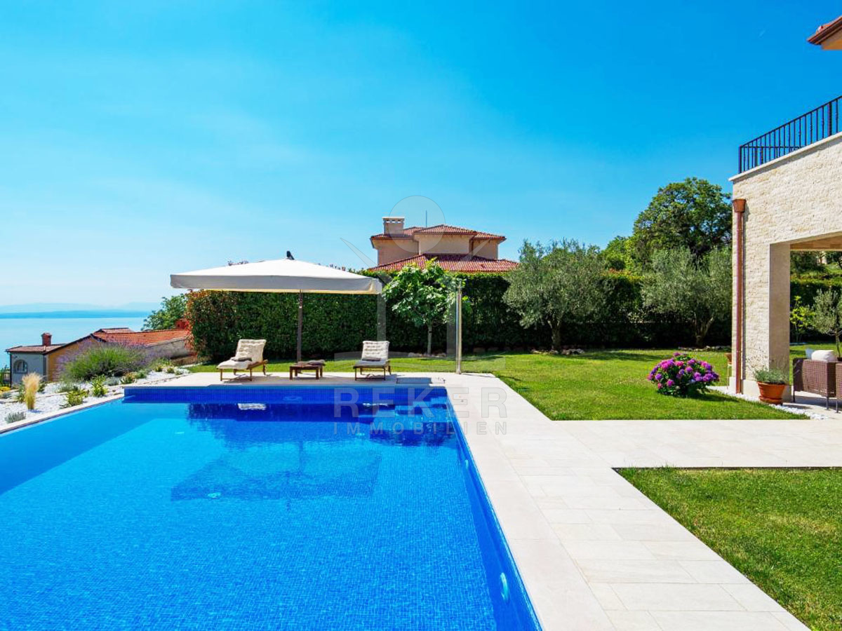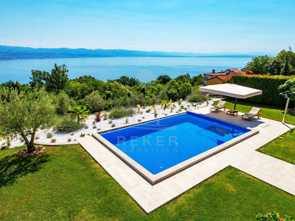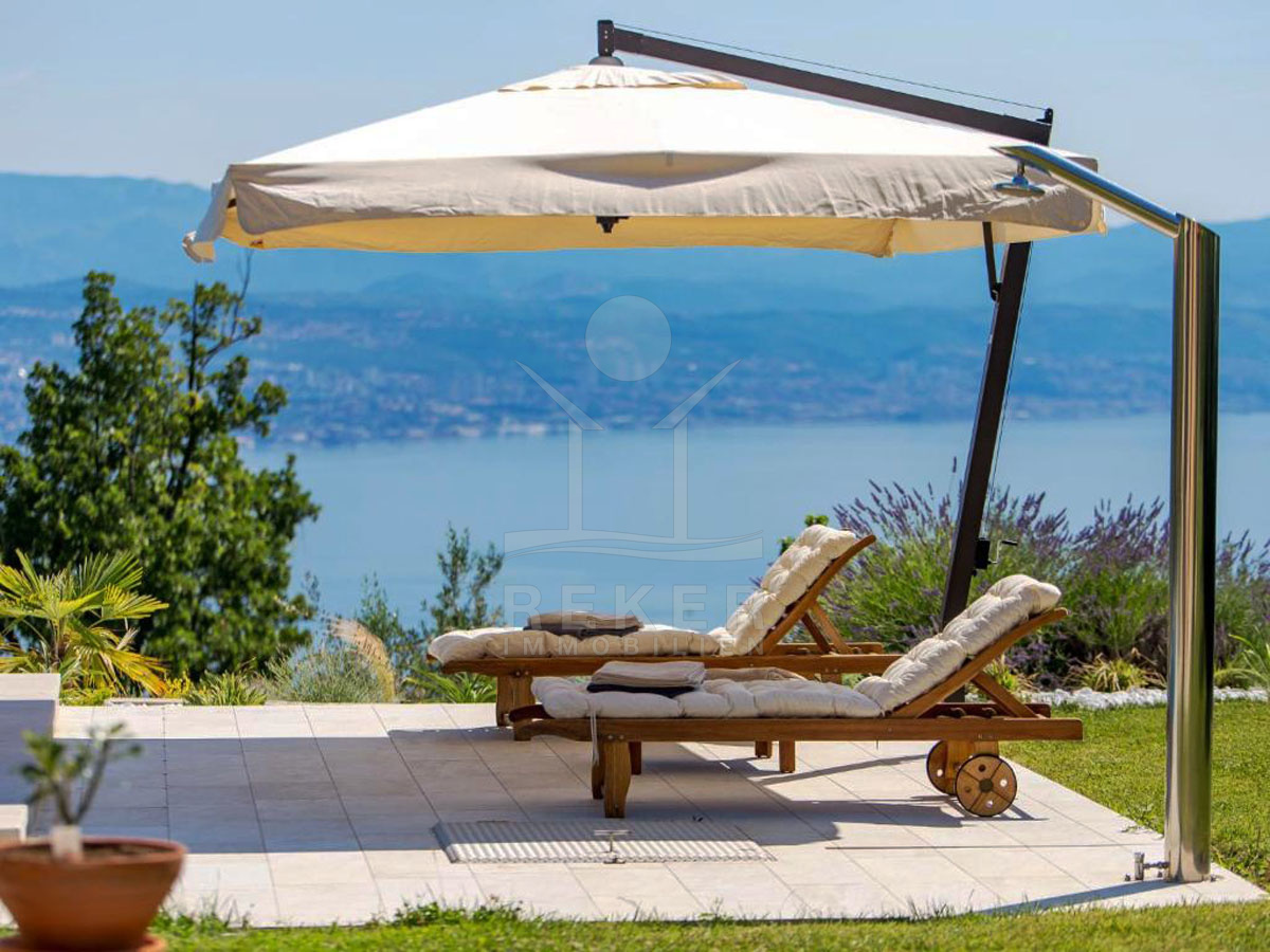 Das Anwesen ist ein wahres Juwel, das auf einem imposanten 3.400 m² großen Grundstück in Hanglage thront. Der harmonisch angelegte Garten mit Olivenbäumen und mediterranen Pflanzen bietet einen offenen Blick auf die Kvarner-Bucht, während der gepflegte Rasen mit automatischer Bewässerung von einer grünen Hecke umgeben ist, die für absolute Privatsphäre sorgt. Das Gebäude selbst erstreckt sich über 2 Etagen und verfügt über eine Wohnfläche von 250 m², wurde im Jahr 2018 erbaut und ist mit erstklassigen Merkmalen ausgestattet, darunter eine Wärmepumpe, Solarpaneelen zur Warmwasseraufbereitung, eine Alarmanlage und Videoüberwachung. Darüber hinaus gibt es ein Gartenhäuschen für Gartengeräte.