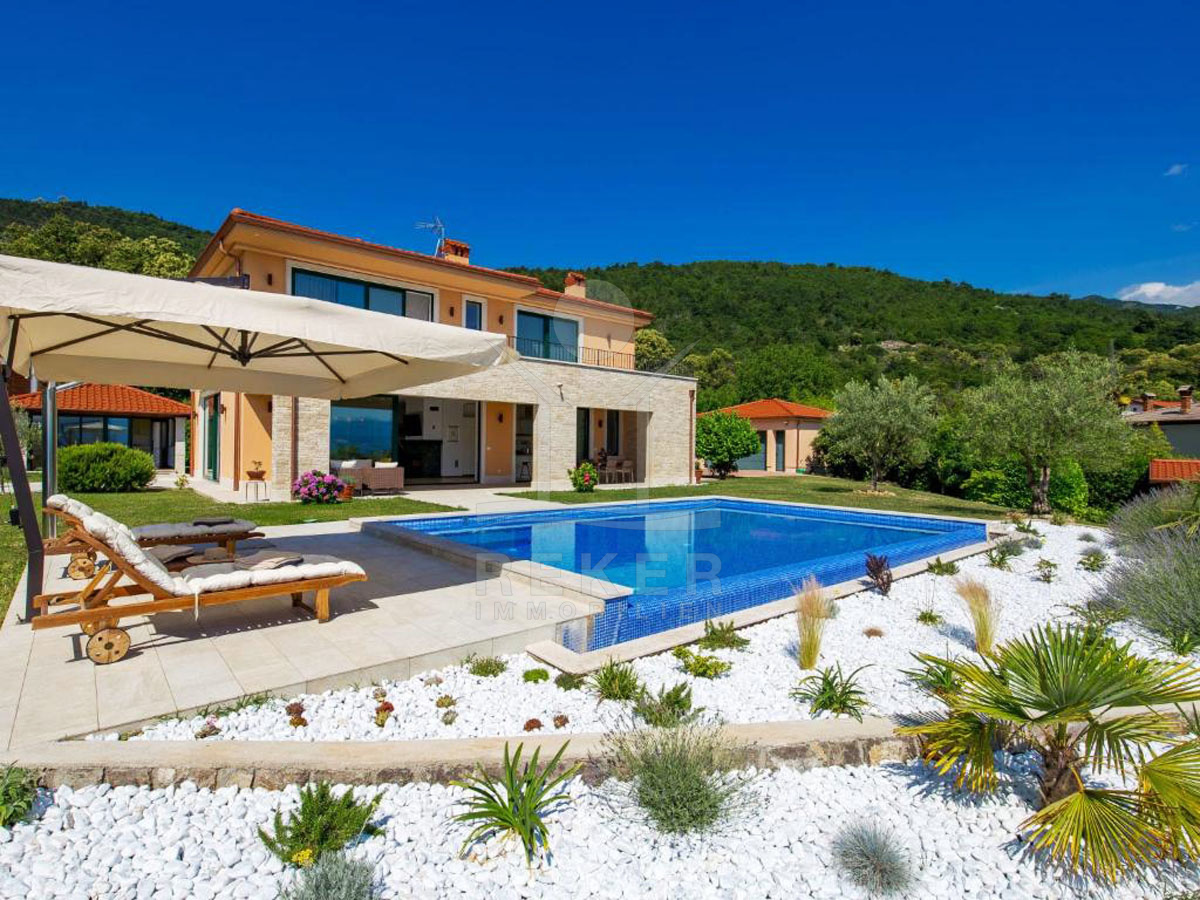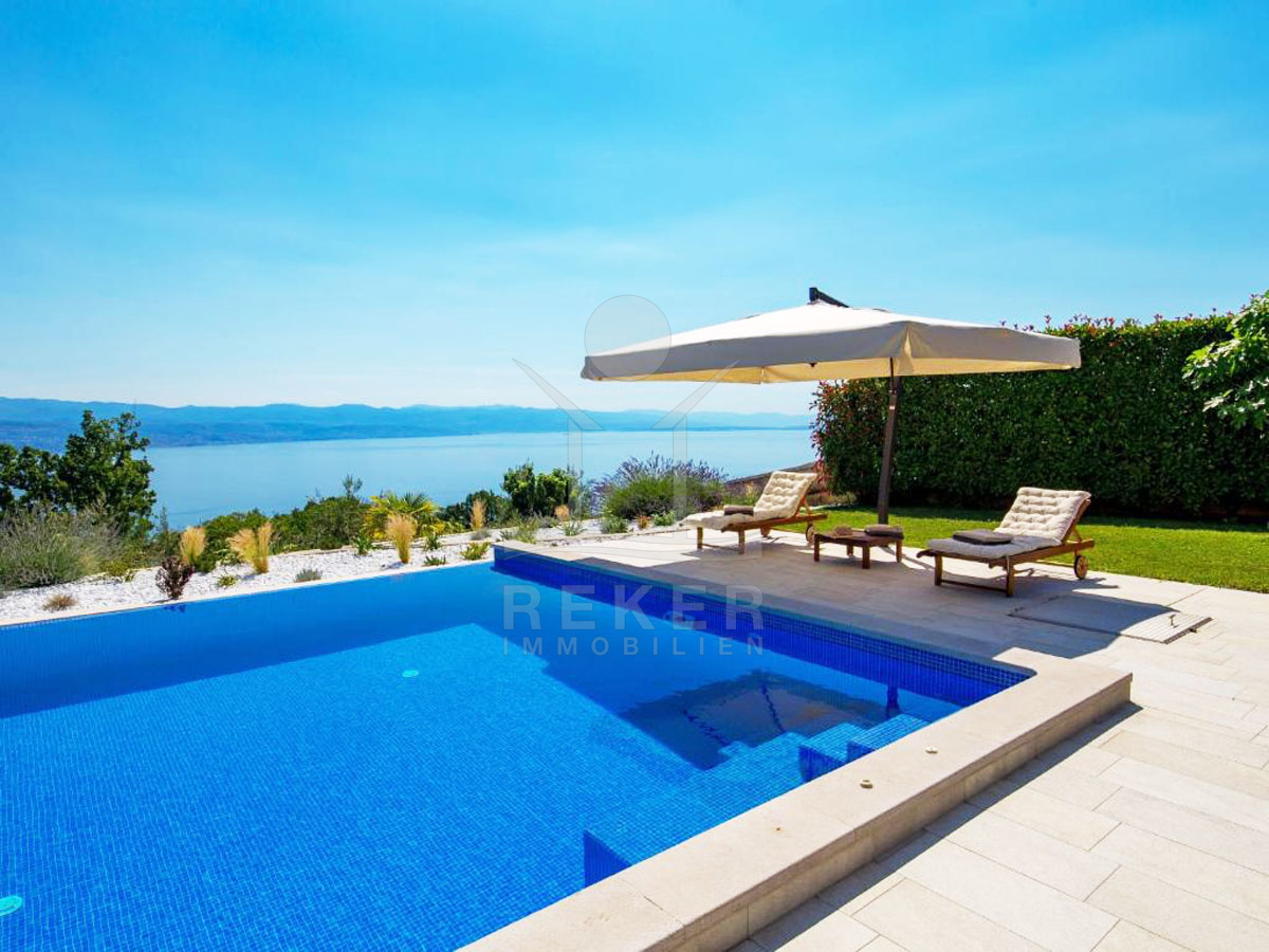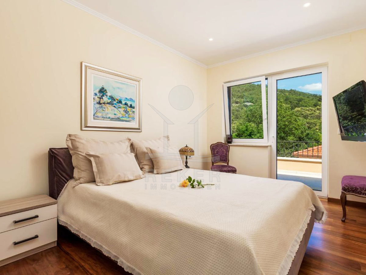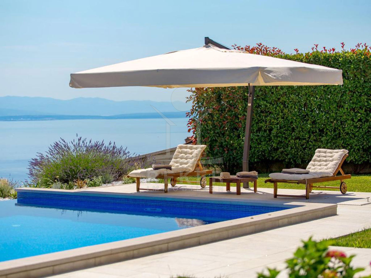 Das Anwesen ist ein wahres Juwel, das auf einem imposanten 3.400 m² großen Grundstück in Hanglage thront. Der harmonisch angelegte Garten mit Olivenbäumen und mediterranen Pflanzen bietet einen offenen Blick auf die Kvarner-Bucht, während der gepflegte Rasen mit automatischer Bewässerung von einer grünen Hecke umgeben ist, die für absolute Privatsphäre sorgt. Das Gebäude selbst erstreckt sich über 2 Etagen und verfügt über eine Wohnfläche von 250 m², wurde im Jahr 2018 erbaut und ist mit erstklassigen Merkmalen ausgestattet, darunter eine Wärmepumpe, Solarpaneelen zur Warmwasseraufbereitung, eine Alarmanlage und Videoüberwachung. Darüber hinaus gibt es ein Gartenhäuschen für Gartengeräte.