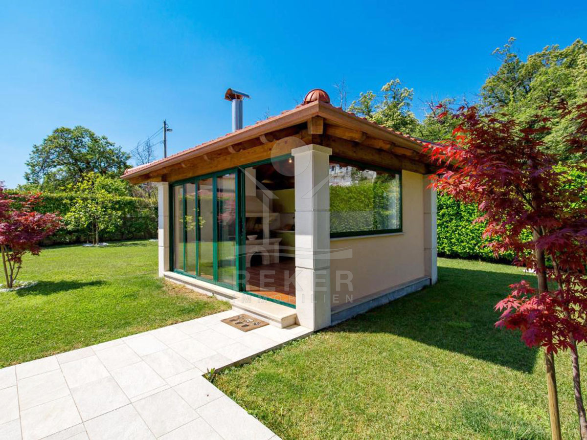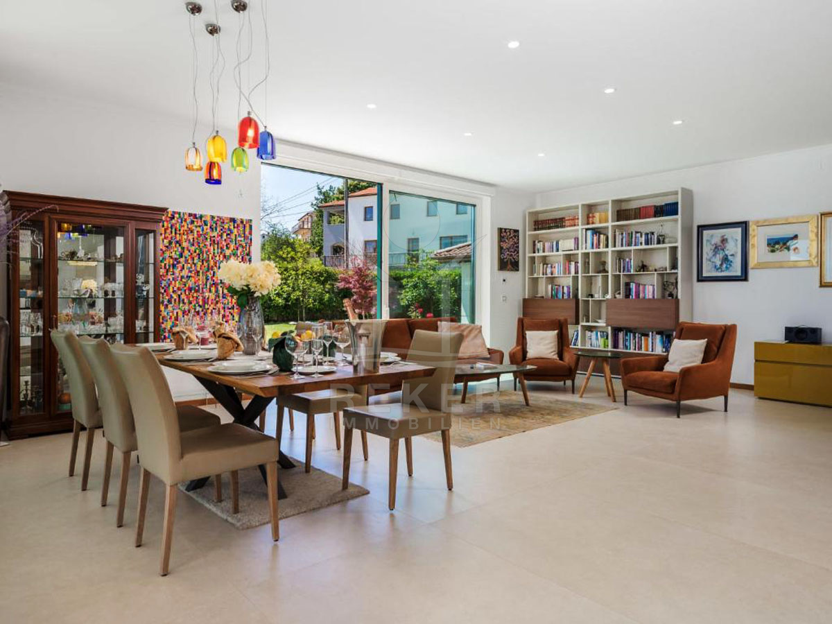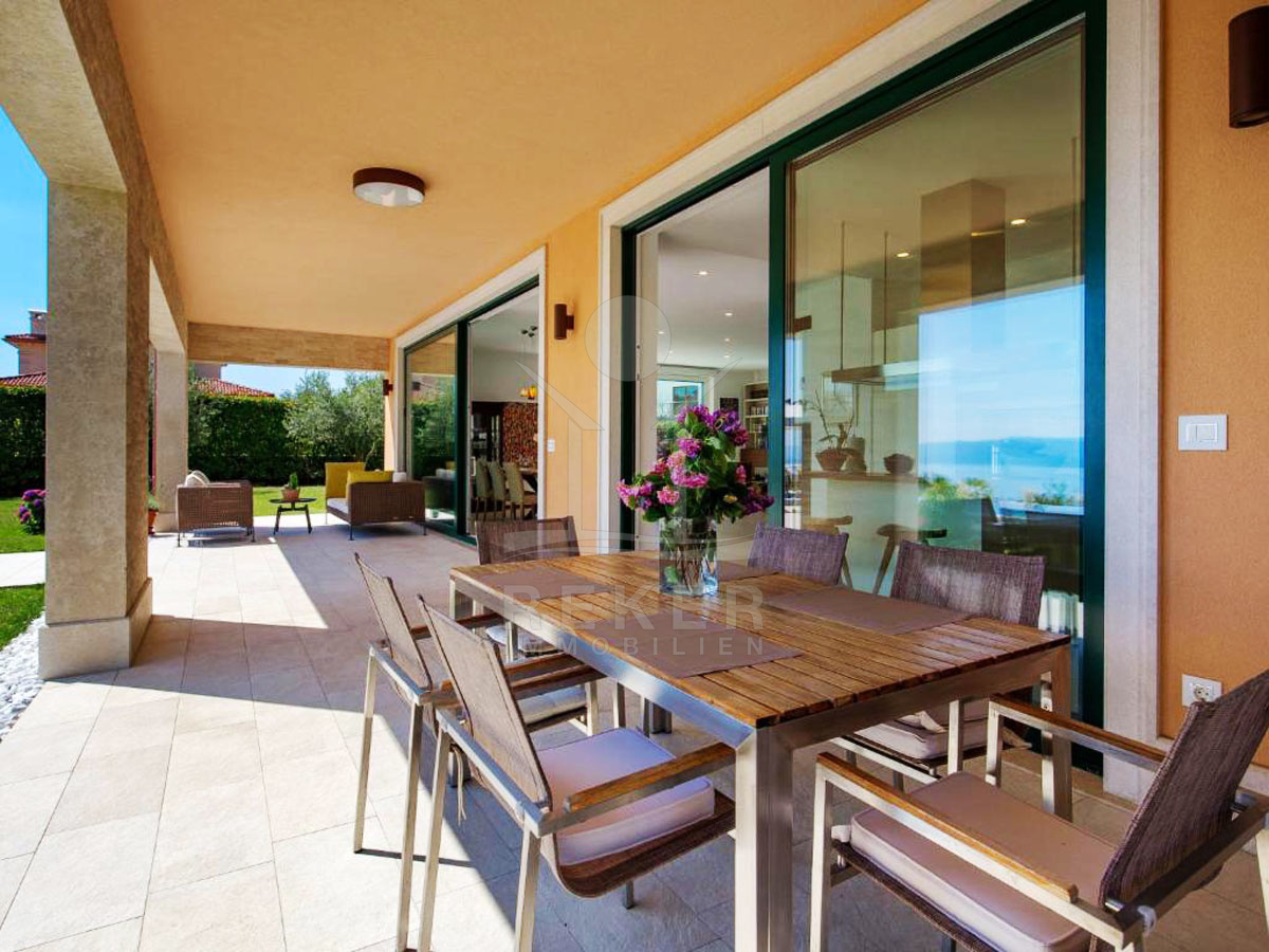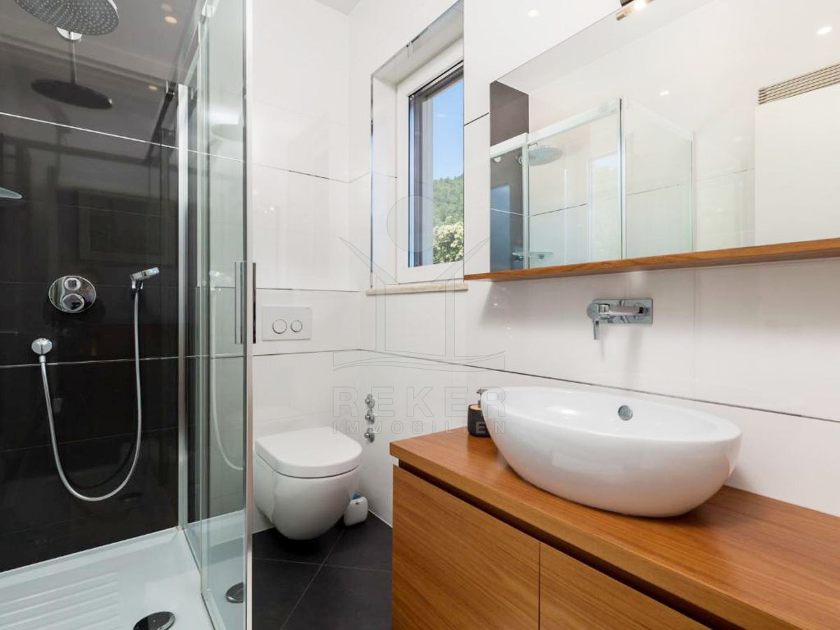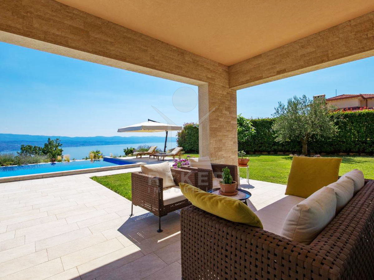 Das Anwesen ist ein wahres Juwel, das auf einem imposanten 3.400 m² großen Grundstück in Hanglage thront. Der harmonisch angelegte Garten mit Olivenbäumen und mediterranen Pflanzen bietet einen offenen Blick auf die Kvarner-Bucht, während der gepflegte Rasen mit automatischer Bewässerung von einer grünen Hecke umgeben ist, die für absolute Privatsphäre sorgt. Das Gebäude selbst erstreckt sich über 2 Etagen und verfügt über eine Wohnfläche von 250 m², wurde im Jahr 2018 erbaut und ist mit erstklassigen Merkmalen ausgestattet, darunter eine Wärmepumpe, Solarpaneelen zur Warmwasseraufbereitung, eine Alarmanlage und Videoüberwachung. Darüber hinaus gibt es ein Gartenhäuschen für Gartengeräte.