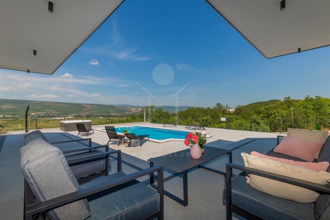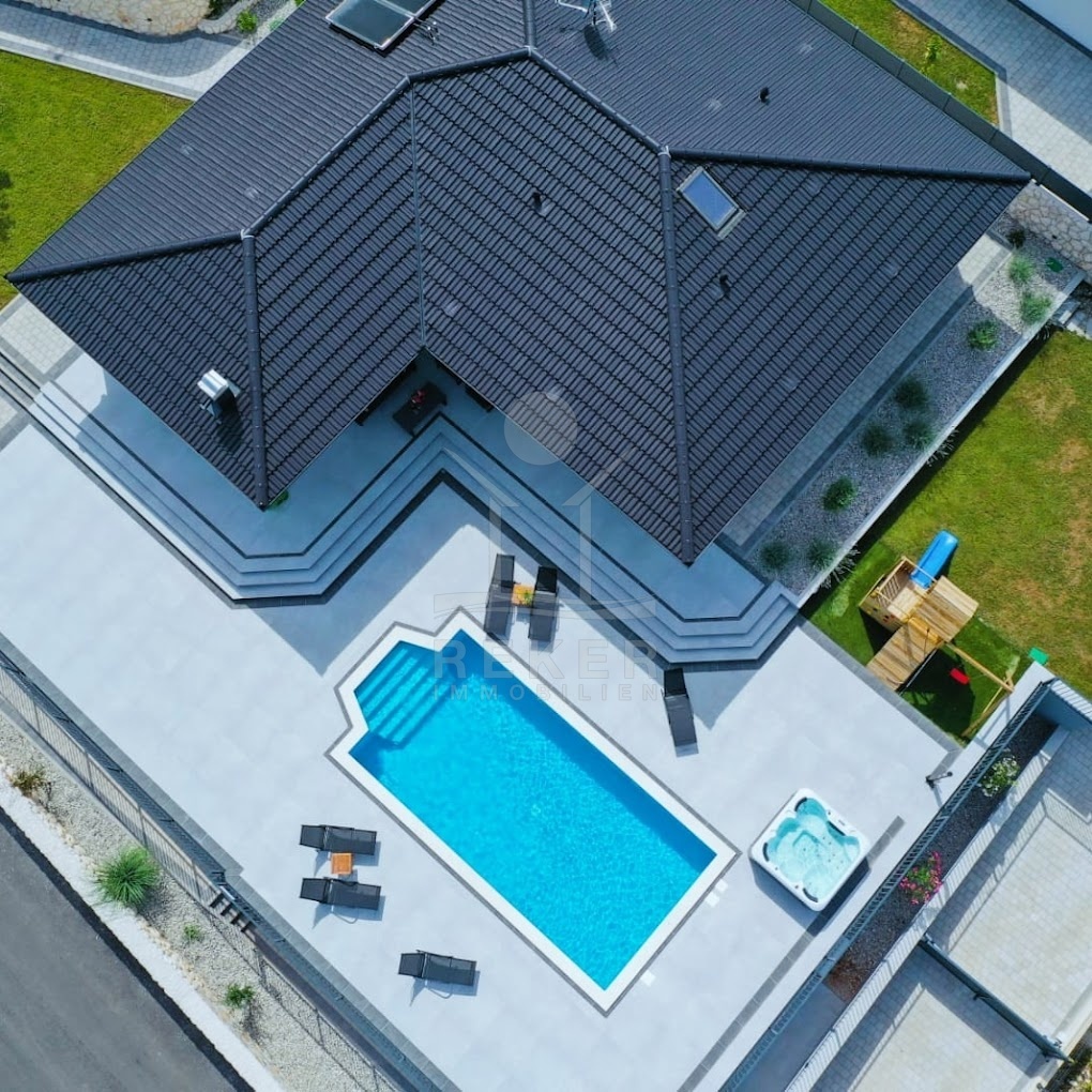 Die Villa verfügt über eine großzügige Terrasse, die Ihnen einen Rückzugsort im Freien bietet. Hier finden Sie einen beheizten Pool mit den Maßen 8x4 m, der zum Entspannen und Schwimmen einlädt, sowie eine Außendusche für Ihre Bequemlichkeit. Zusätzlich gibt es einen luxuriösen Whirlpool und gemütliche Gartenmöbel, die zum Verweilen und Genießen einladen. Eine Außenküche mit Steingrill erweitert den Platz für gesellige Zusammenkünfte und kulinarische Abenteuer im Freien. Die Kombination aus modernem Design und hochwertigen Annehmlichkeiten macht diese Villa zu einem idealen Rückzugsort für die ganze Familie.