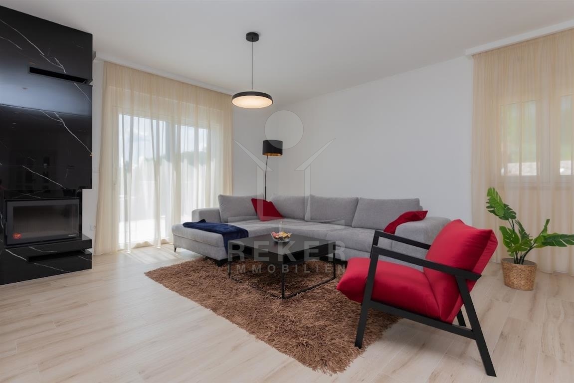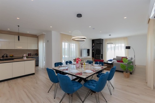 Das Anwesen erstreckt sich über 1200 m² und befindet sich in einer malerischen Lage mit Ausrichtung nach Norden und Osten. Das frei stehende Gebäude überzeugt durch eine elegante Wohnfläche von 195 m² und wurde als Neubau im Jahr 2024 errichtet. Die großzügige Gestaltung der Räume mit einer Deckenhöhe von 3 m sorgt für eine helle und luftige Atmosphäre. Die moderne Fußbodenheizung und die Klimaanlagen in jedem Raum garantieren höchsten Komfort und ein ideales Wohnklima zu jeder Jahreszeit. Im Keller befinden sich ein Technikraum sowie ein ungenutzter Raum von 40 m², der zahlreiche Nutzungsmöglichkeiten eröffnet.