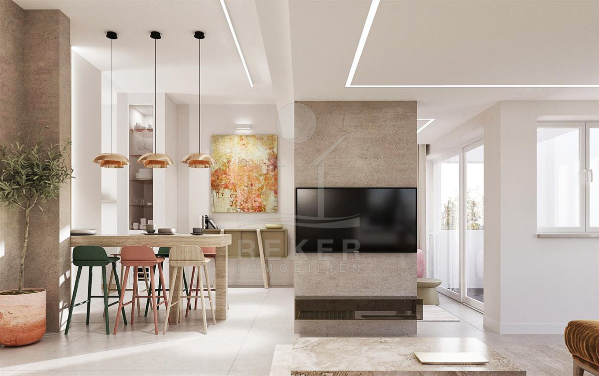 Der 1. Stock beherbergt eine großzügige 2-Zimmer-Wohnung mit Wohnzimmer (144,50 m²), Küche, Schlafzimmer, Badezimmer und 2 Terrassen geräumigen Terrassen.