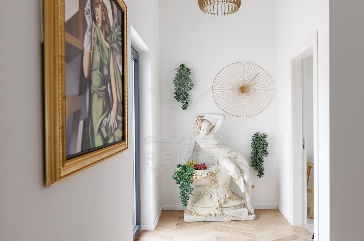 Ruhig gelegen. Etwa einen Kilometer vom Meer entfernt, genauso weit ins Zentrum von Malinska. Die Nachbarschaft? Entspannt. Die Zufahrt ist problemlos, geparkt wird bequem: zwei Stellplätze in der Garage, fünf draußen.