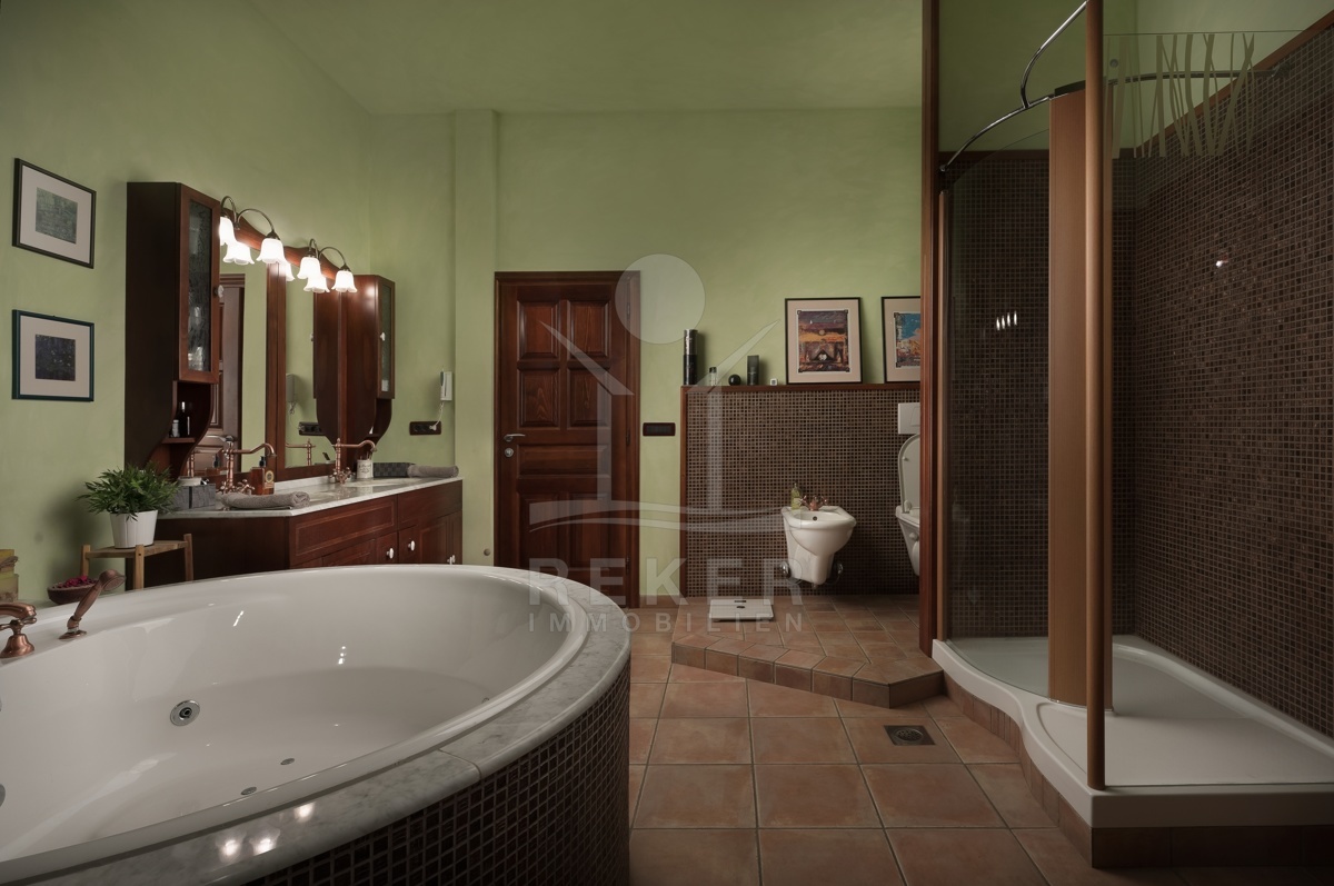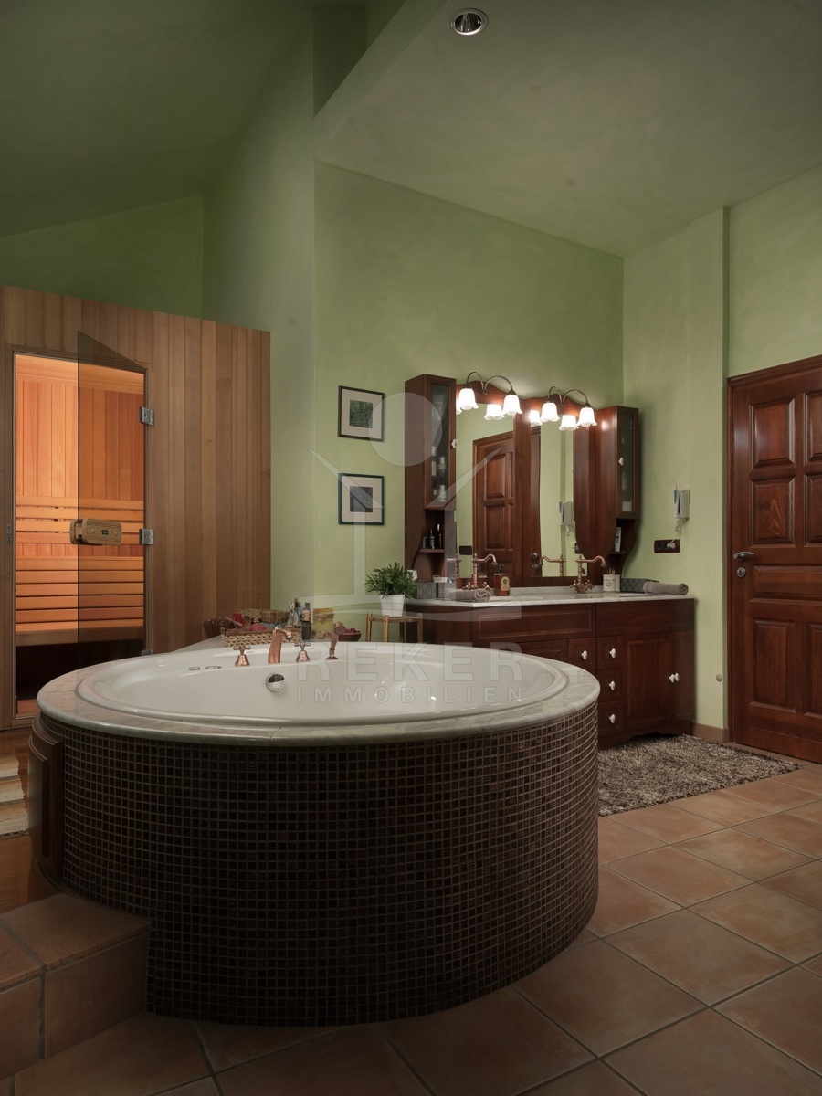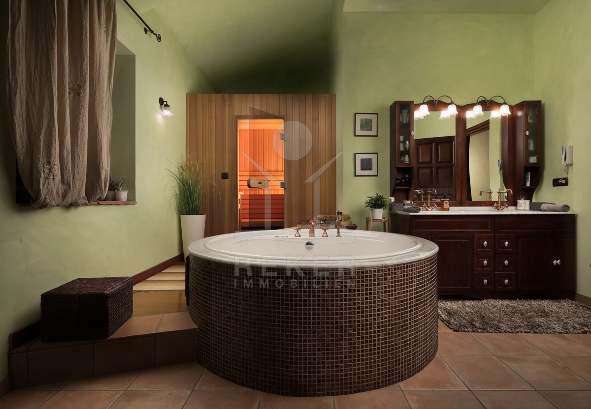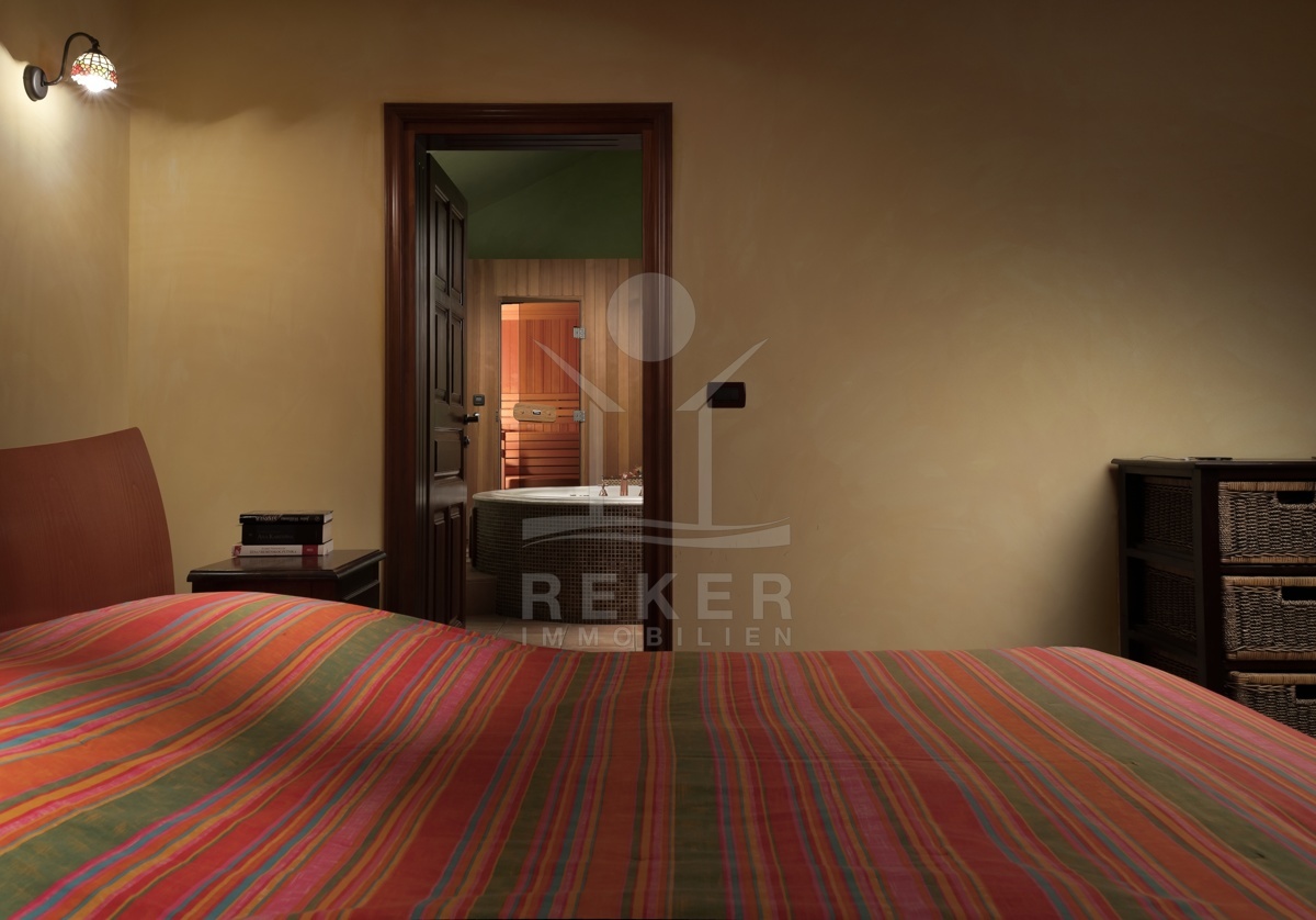 Die Villa bietet insgesamt fünf Schlafzimmer und zwei Badezimmer. Ein besonderes Highlight ist die Sauna, die für Entspannung und Entschleunigung sorgt. Der absolute Höhepunkt ist jedoch die runde Badewanne inmitten der Wellness-Oase, die ein wahrer Ort der Entspannung und des Wohlbefindens ist. Ein Schlafzimmer verfügt über einen direkten Zugang zu dieser Wohlfühloase. Das Anwesen bietet einen luxuriösen und erholsamen Lebensstil in einer mediterranen Atmosphäre.