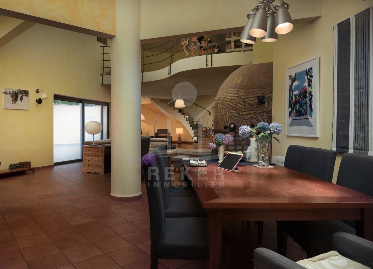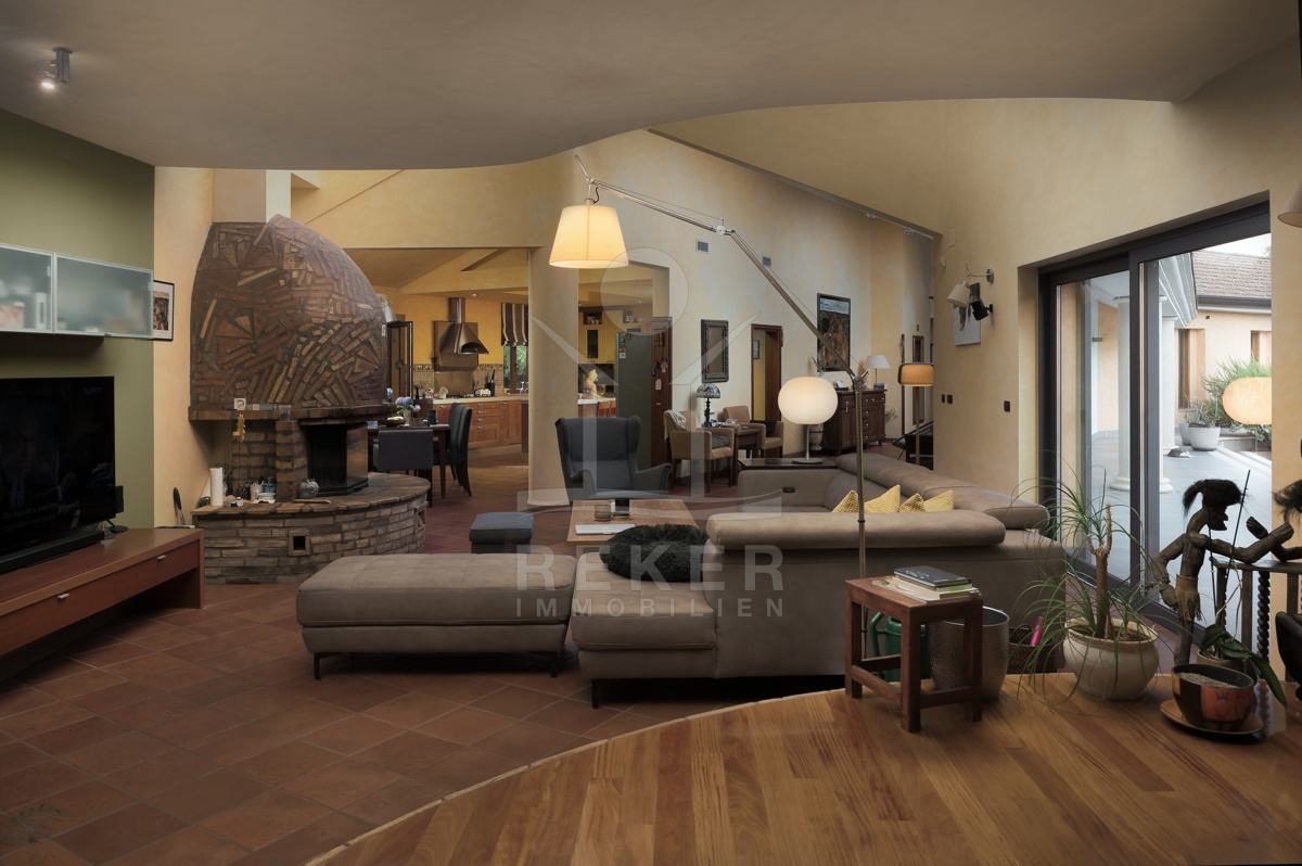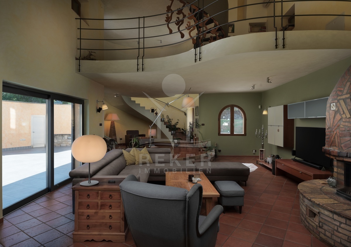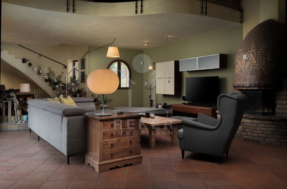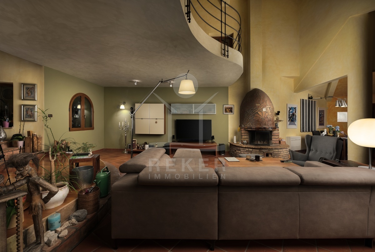 Ein kunstvoll gestalteter, großer Kamin dient als zentraler Mittelpunkt und sorgt für warme und gemütliche Stunden. Über eine Innentreppe gelangen Sie zur ausgedehnten Galerie im oberen Teil des Raumes, die zusätzlichen Platz und Möglichkeiten für die Nutzung bietet.
