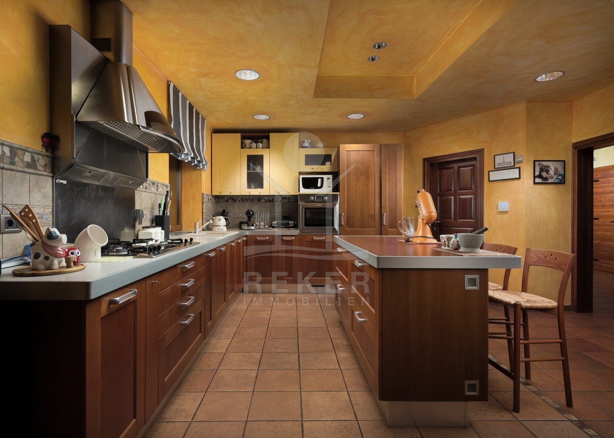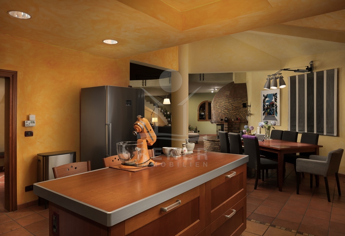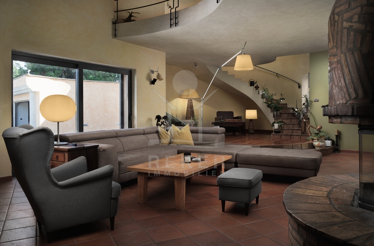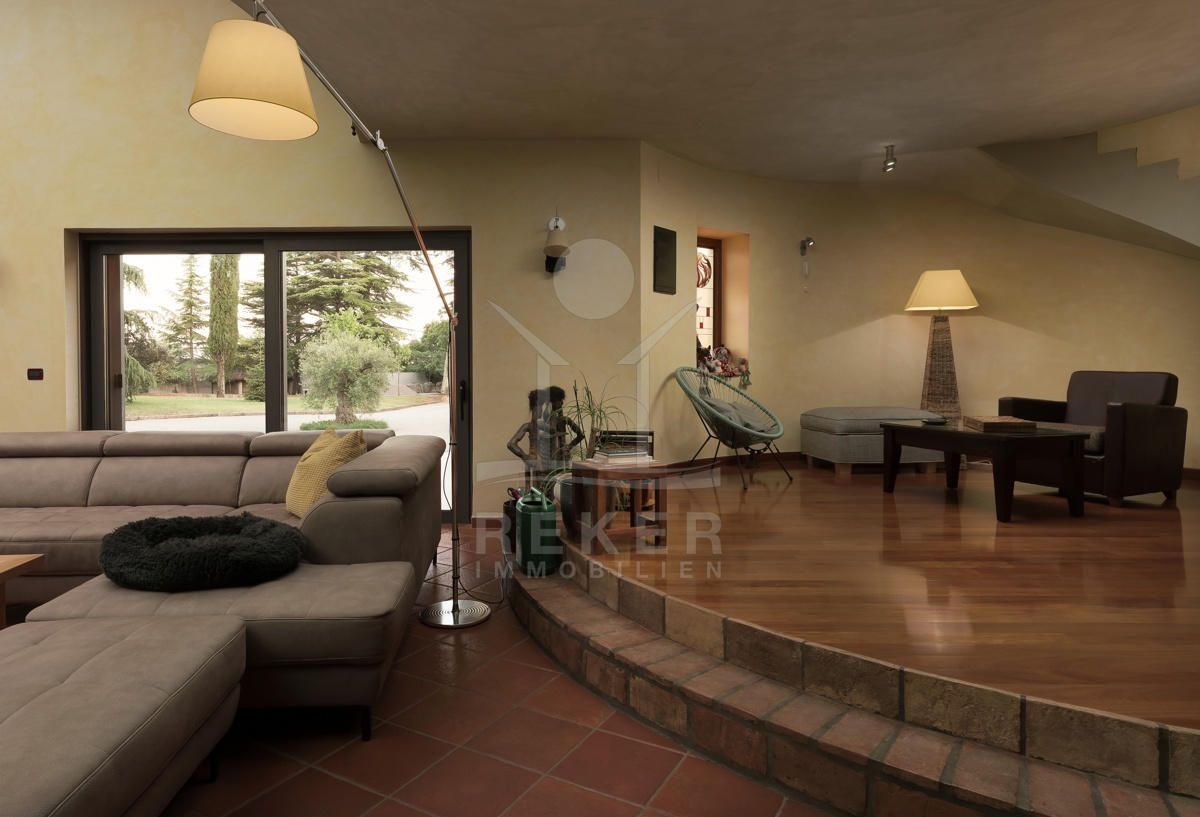 Ein kunstvoll gestalteter, großer Kamin dient als zentraler Mittelpunkt und sorgt für warme und gemütliche Stunden. Über eine Innentreppe gelangen Sie zur ausgedehnten Galerie im oberen Teil des Raumes, die zusätzlichen Platz und Möglichkeiten für die Nutzung bietet.
