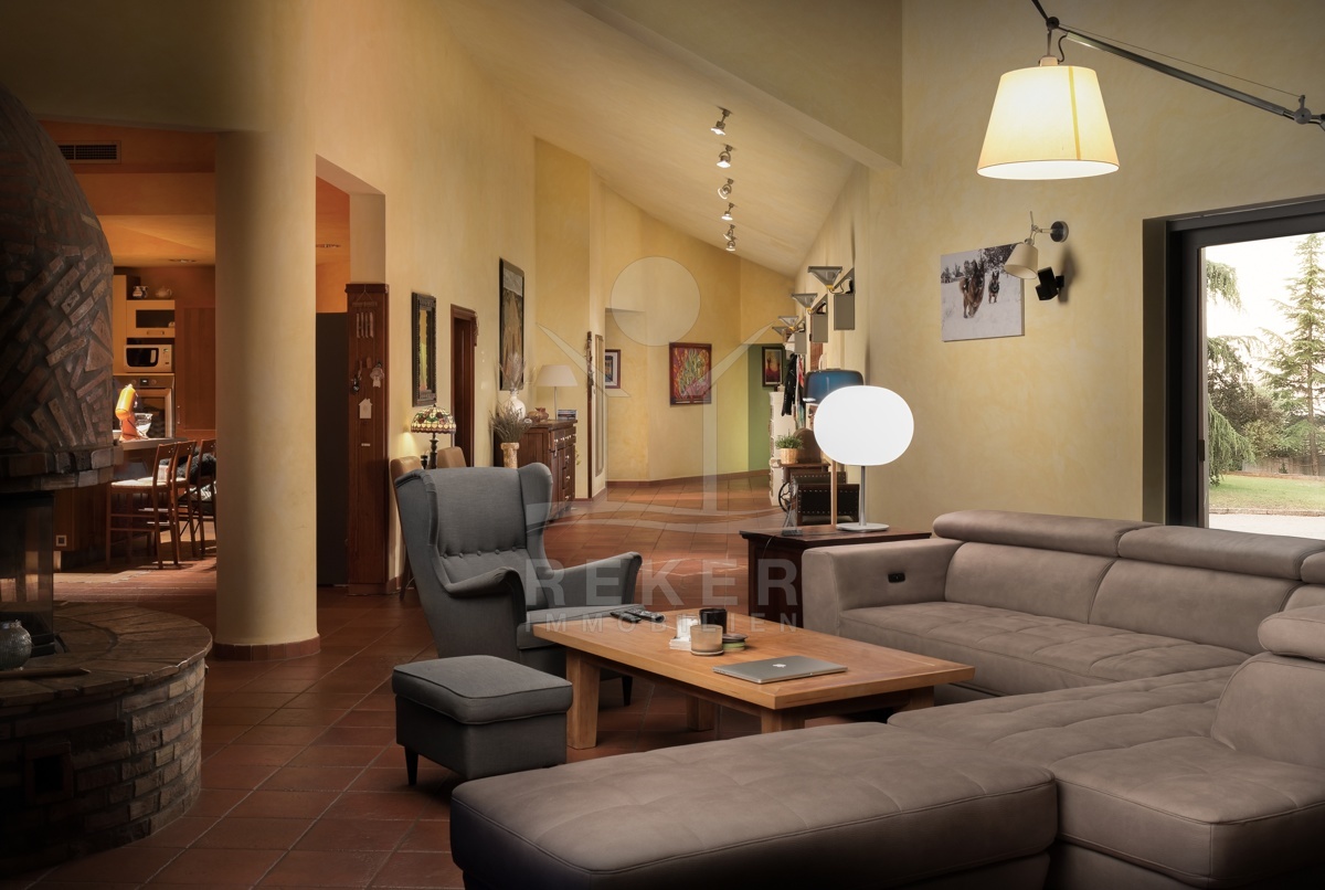Das Anwesen liegt auf einem großzügigen Grundstück von 8.090 m², das mit schönem, sattem Grün und Bäumen eingebettet ist. Die südliche Ausrichtung sorgt für eine optimale Sonneneinstrahlung und schafft eine idyllische Atmosphäre. Das Gebäude, bestehend aus einem Erdgeschoss und einer Galerie, wurde im Jahr 2007 erbaut und verfügt über ein Solarkraftwerk und ein Bewässerungssystem. Eine Gegensprechanlage mit Kamera bietet zusätzliche Sicherheit und Komfort für die Bewohner.