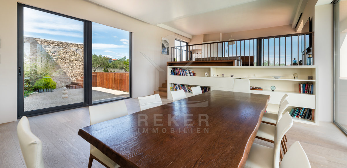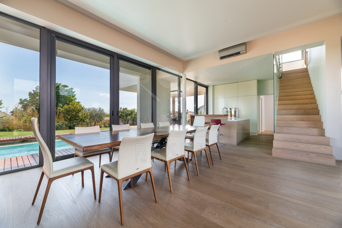 Genießen Sie die frisch zubereiteten Köstlichkeiten Istriens in diesem großzügigen und hellem Essbereich der Villa.
