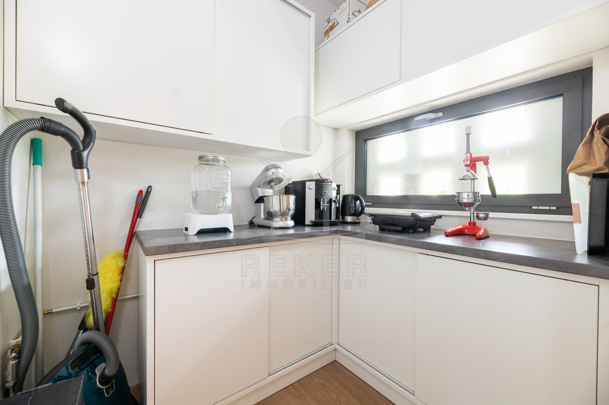 Die hochwertige Küche erfüllt höchste Ansprüche und stammt aus dem Hause Gaggenau. Alle Schränke sind mit Touch-Funktion ausgestattet.