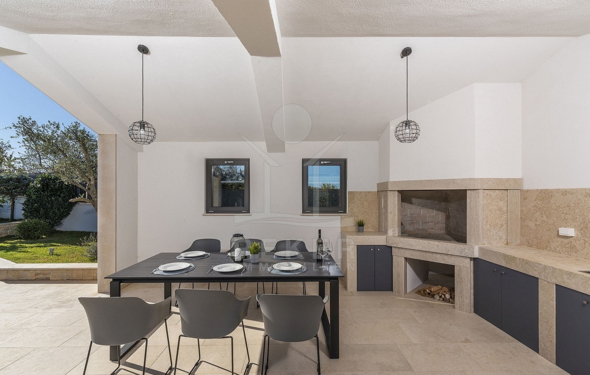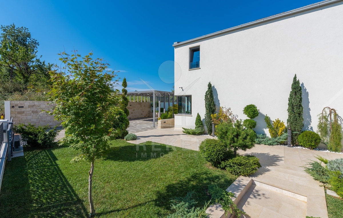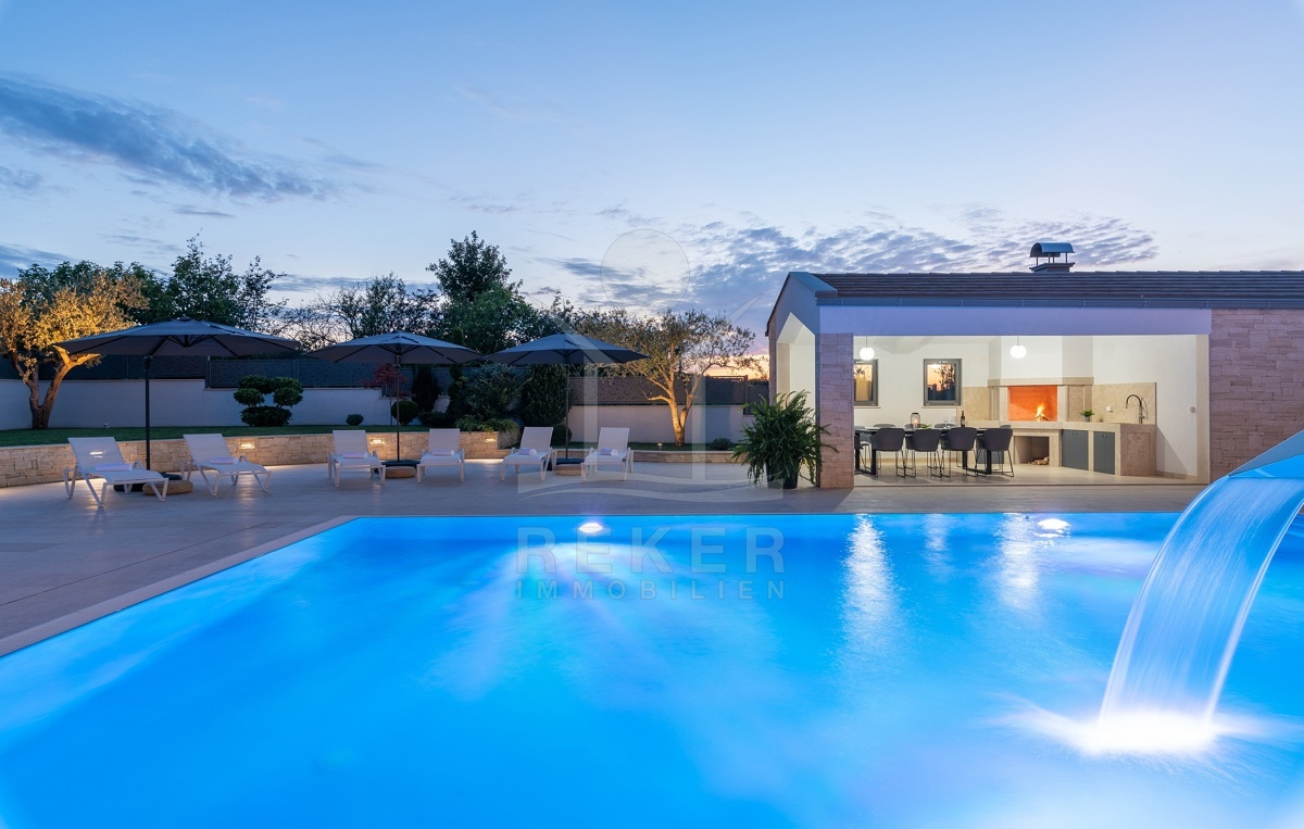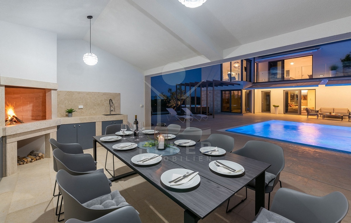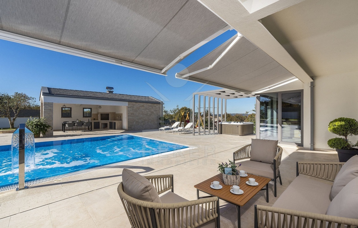 Eine Sommerküche mit Steingrill erwartet Sie mit höchstem Genuss in Vollendung, während die mediterrane Bepflanzung durch eine automatische Bewässerung gepflegt wird. Etwa 120 mediterrane Pflanzen bereichern den Garten, zu denen Olivenbäume, Lavendel, Pinien, Zypressen, Lorbeer, Ahorn und Wacholder gehören.