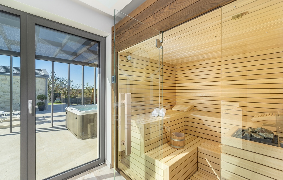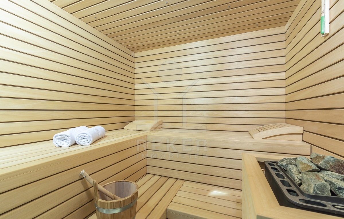 Betreten Sie Ihr neues Wohnparadies und lassen Sie den überwältigenden Anblick kurz sacken! Sie finden im Erdgeschoss das knapp 46 m² große Wohnzimmer mit offener Küche, das 30 m² große Esszimmer, 1 Schlafzimmer mit Badezimmer en suite, eine überdachte Terrasse, das Gäste-WC, den Heizungsraum, den Fitnessbereich und die Sauna. Eine zweiläufige Treppe führt in das Obergeschoss.