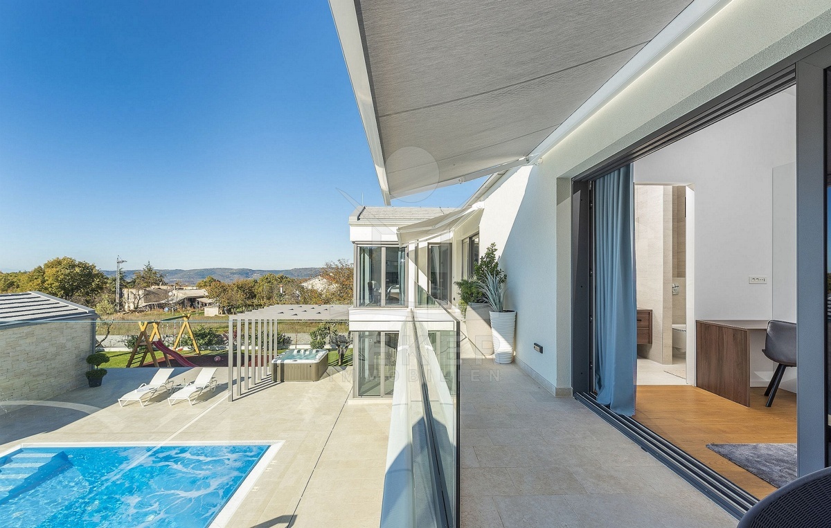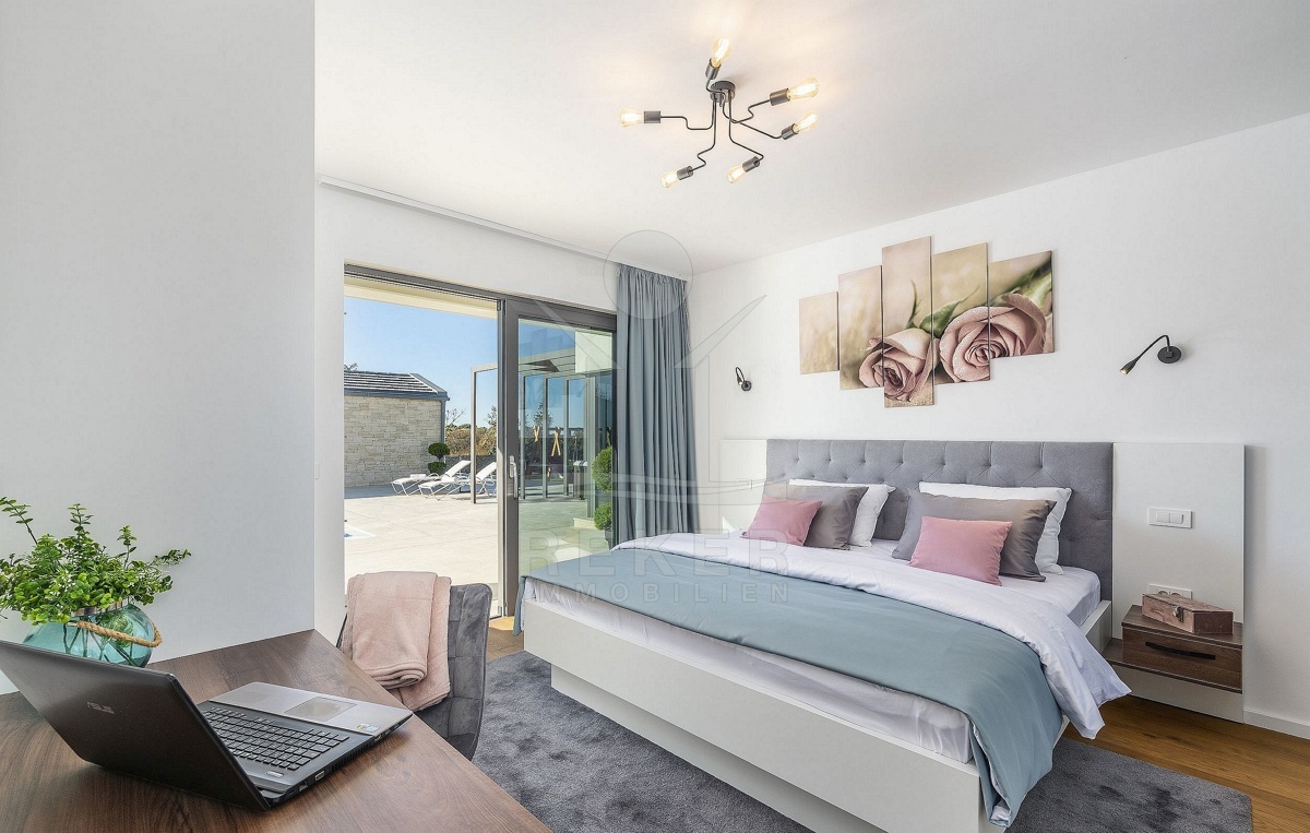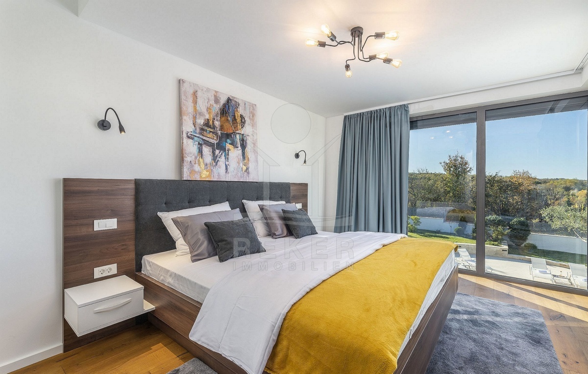 4 weitere Schlafzimmer, ebenfalls mit Badezimmern en suite, 2 Balkone, eine Waschküche und die Speisekammer erwarten Sie im 1. Stockwerk. Die Luxus-Villa ist klimatisiert, sodass sie das ganze Jahr über Wohlfühlen auf höchstem Niveau ermöglicht.