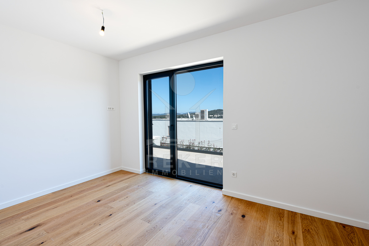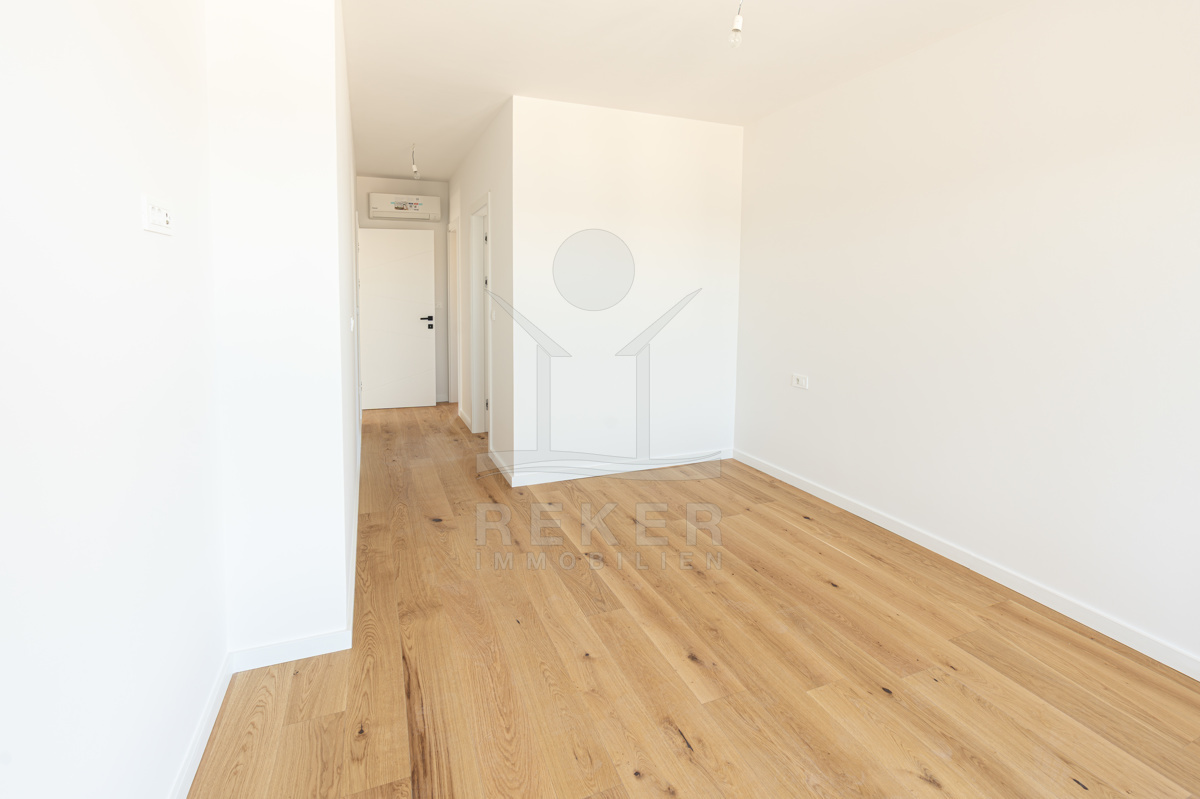 Drinnen geht's so weiter: durchdachte Architektur, helle Räume, hochwertige Materialien. Im Keller: Garage, Abstellraum, Waschküche. Im Erdgeschoss: ein luftiger Wohnbereich mit Design-Küche, Essplatz und direktem Zugang zur Terrasse. Zwei Schlafzimmer, beide mit Zugang nach draußen, dazu ein modernes Bad und ein Gäste-WC.