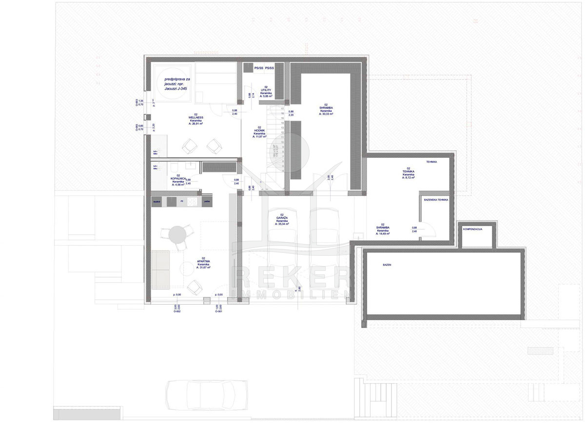 Das Untergeschoss beherbergt eine geräumige separate Wohnung mit 32 m². Diese verfügt über eine eigenständige Küche, ein Esszimmer und ein großzügiges Wohnzimmer. Zusätzlich bietet der Keller ein Badezimmer sowie einen Wellnessbereich, der bereits für einen Whirlpool vorbereitet ist, um Ihnen vollkommenes Vergnügen zu bereiten. Des Weiteren stehen mehrere Abstellräume zur Verfügung, die einen direkten Zugang zur Garage ermöglichen