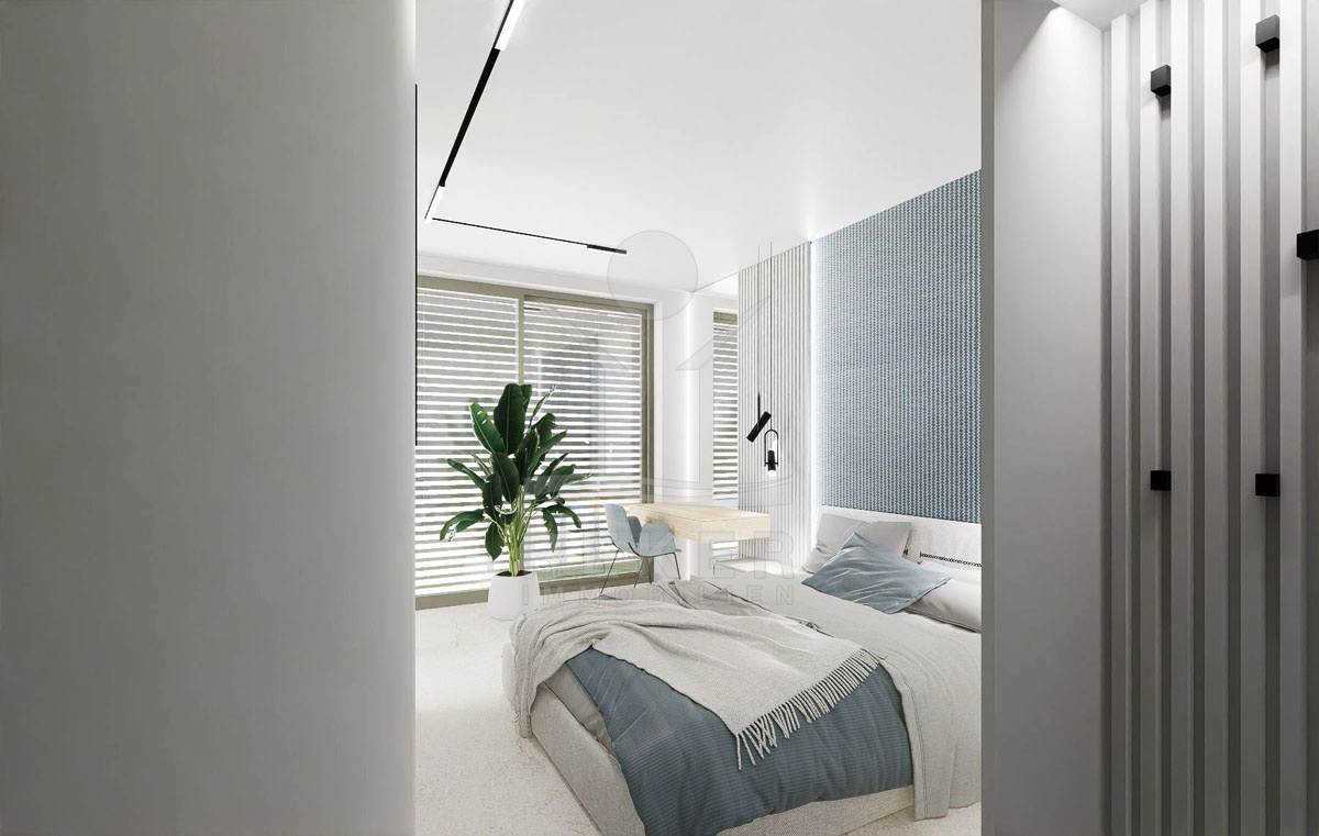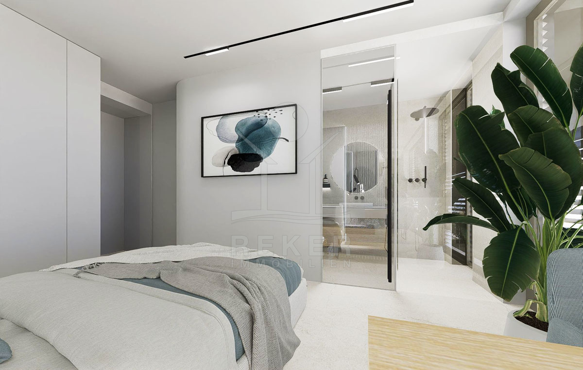 Der erste Stock der Villa (Erdgeschoss) ist großzügig geplant und umfasst drei Schlafzimmer, von denen jedes über ein eigenes Badezimmer verfügt. Das Hauptschlafzimmer besitzt zudem ein eigenes Ankleidezimmer mit Blick auf das Meer. Ein geräumiges Wohnzimmer mit offener Küche und Essbereich, der insgesamt 57 m² misst, öffnet sich zur Außenterrasse, zum Garten und zum Swimmingpool. Dies schafft eine nahtlose Verbindung zwischen Innen- und Außenbereich und sorgt für eine herrliche Aussicht und ein geselliges Ambiente.