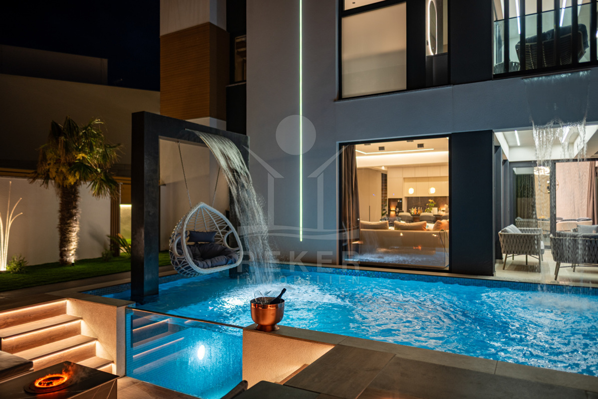 Der Außenbereich ist wie gemacht für lange Sommertage. Der Garten ist auf 601 m² perfekt angelegt – mediterrane Pflanzen, Palmen und stimmungsvolle Beleuchtung schaffen echtes Ferienflair. Im Mittelpunkt steht der 47 m² große, beheizte Pool mit Wasserfallfunktion, Massagedüsen und Lichtspielen. Auch abends ein absoluter Blickfang. Gleich daneben finden Sie die überdachte Sommerküche mit Grillplatz und großem Esstisch. Ideal für gesellige Abendessen im Freien – mit Blick auf den Pool, geschützt und dennoch offen. Die südlich ausgerichtete Terrasse im Erdgeschoss geht fließend in den Wohnraum über und ist teils überdacht. Hochwertige Outdoor-Möbel sorgen für maximalen Komfort. Der gesamte Außenbereich ist durch einen modernen Zaun abgegrenzt und beleuchtet – Privatsphäre garantiert.