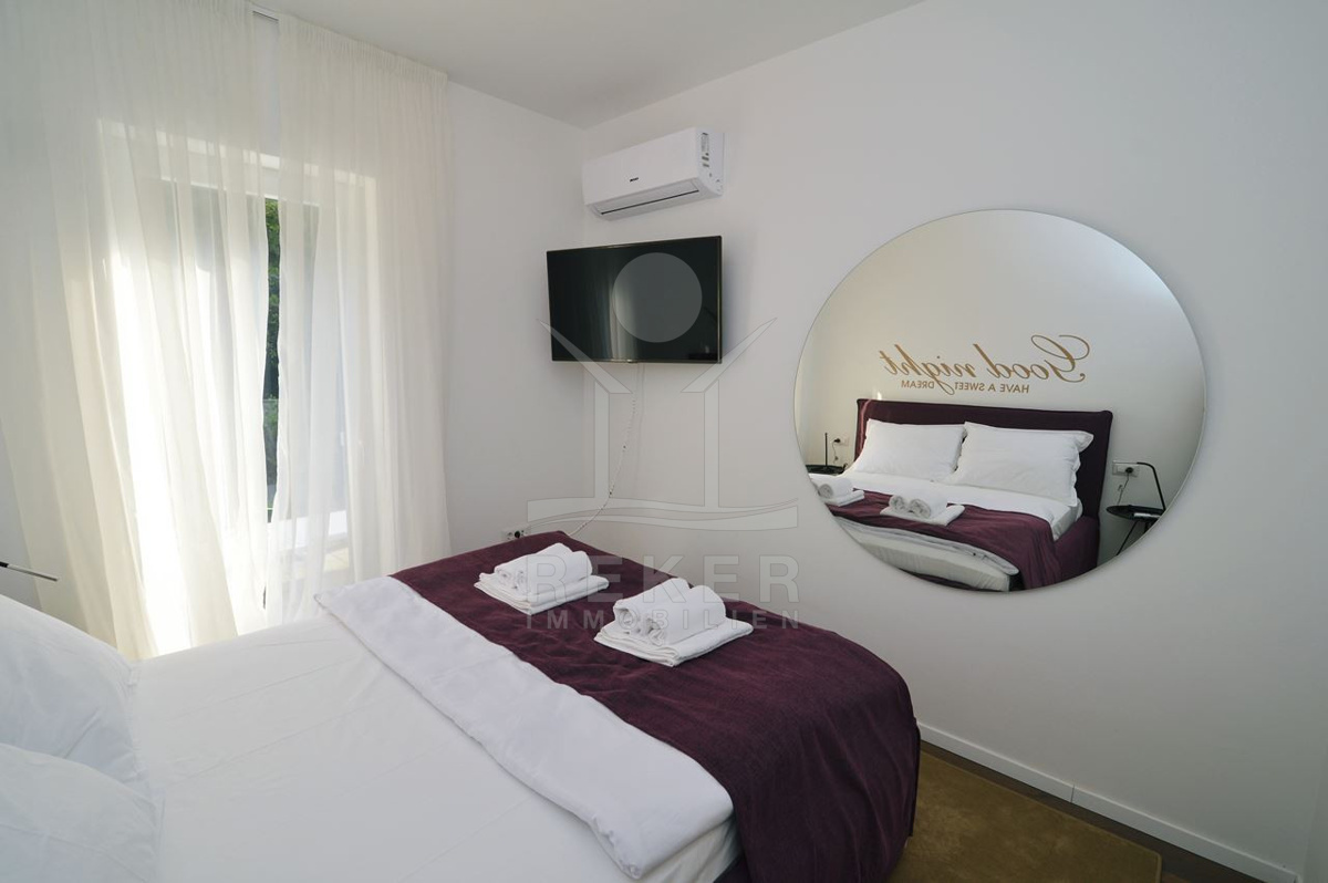 Sie möchten direkt ans Meer? Diese moderne Villa aus dem Jahr 2018 liegt nur etwa 50 Meter vom Wasser entfernt – mit freiem Blick auf die Adria und nur zehn Gehminuten von der Altstadt von Opatija. Das Gebäude hat eine Gesamtfläche von 1.205 m² und steht auf einem rund 830 m² großen Grundstück. Sechs private Parkplätze gehören dazu, zusätzlich gibt’s einen öffentlichen Parkplatz direkt nebenan – ideal für Gäste oder Mieter. Auch Busverbindungen nach Opatija oder Rijeka sind gleich um die Ecke.