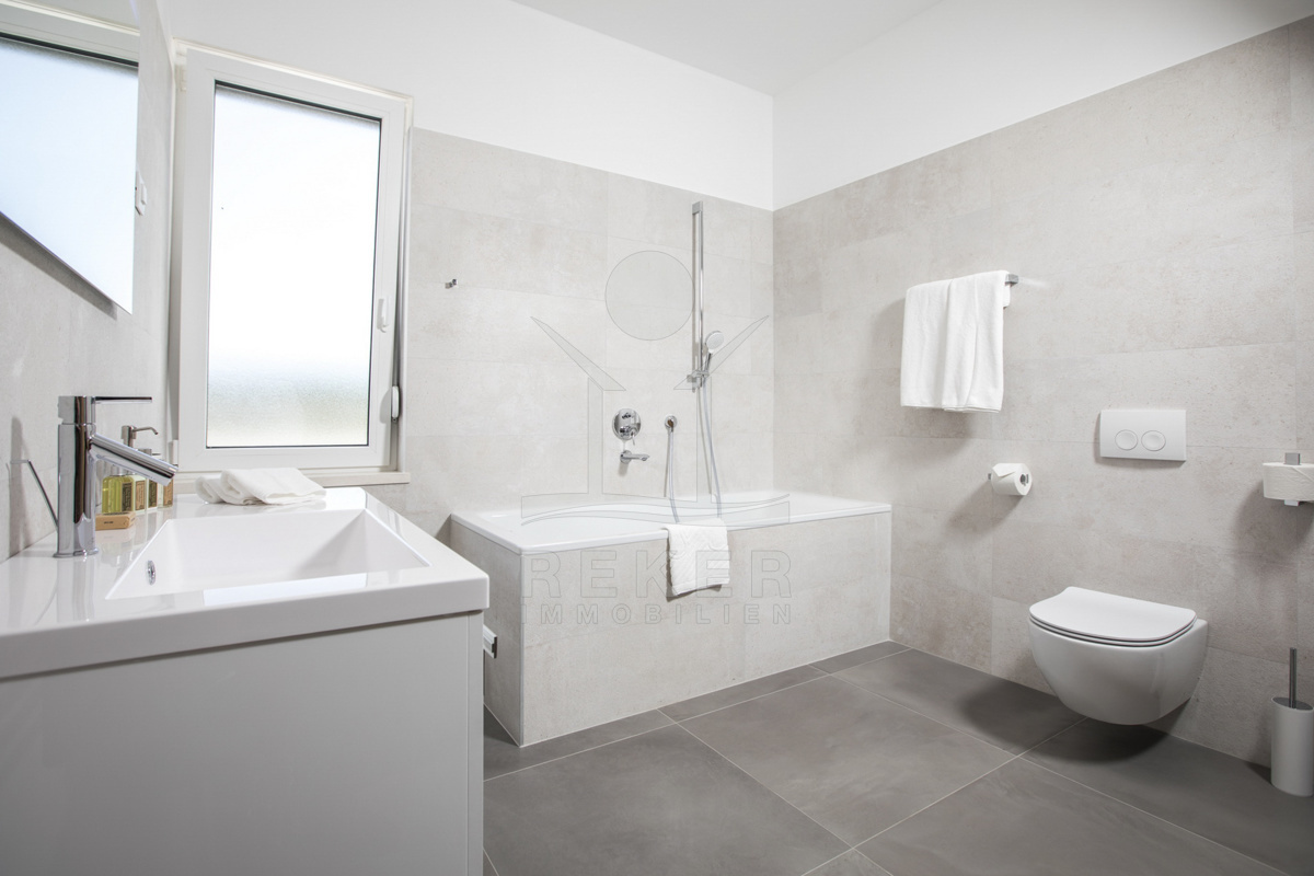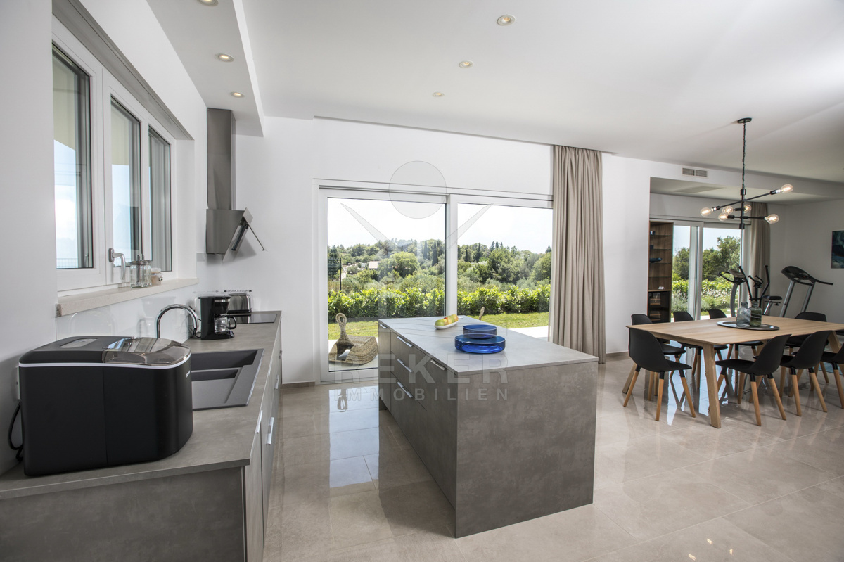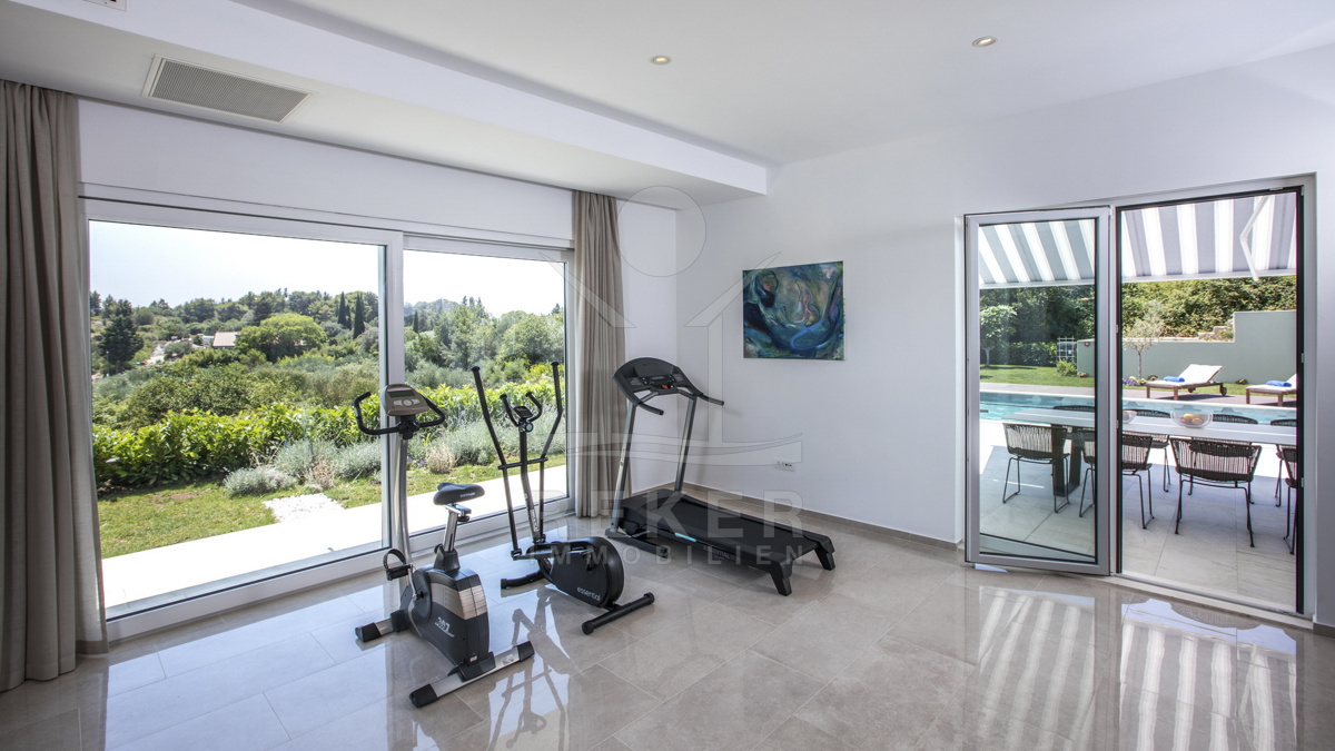 Die exquisite Villa ist modern ausgestattet und bietet höchsten Komfort und Privatsphäre. Die Villa verfügt über einen offenen Wohn- und Essbereich mit einer voll ausgestatteten Küche im Erdgeschoss. Ein Badezimmer und ein Fitnessraum befinden sich ebenfalls auf dieser Etage. Große Schiebetüren vom Wohnzimmer führen auf die Terrasse und den Pool, die zum Entspannen und Genießen einladen.