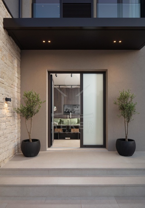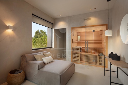 Im Obergeschoss warten drei Schlafzimmer, jedes mit eigenem Bad und Blick ins Grüne. Die hochwertige Ausstattung zieht sich durch alle Räume: Fußbodenheizung mit Wärmepumpe, Microtopping-Böden, italienische Möbel, Designleuchten und flächenbündige Türen. Alles wirkt ruhig, klar und durchgängig edel. Die Villa wird komplett möbliert verkauft – einziehen und ankommen.