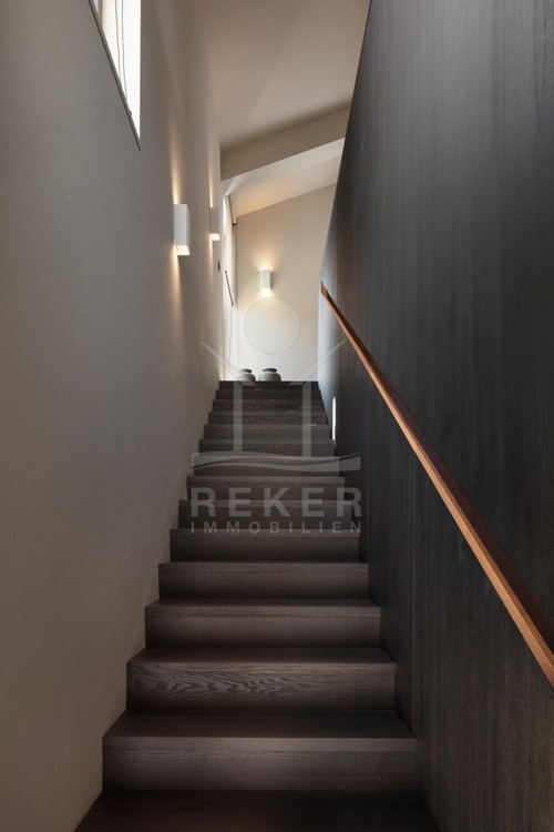 Im Erdgeschoss der Villa verschmelzen Kochen, Essen und Wohnen zu einem offenen, stilvollen Raum. Große Glasschiebetüren sorgen für viel Licht und verbinden den Innenraum direkt mit der Terrasse. Ein Kamin bringt zusätzliche Wärme und Atmosphäre. Ergänzt wird die Etage durch ein Gäste-WC, eine Garderobe, Hauswirtschaftsräume, eine Waschküche sowie einen Wellnessbereich mit Sauna und Dusche.