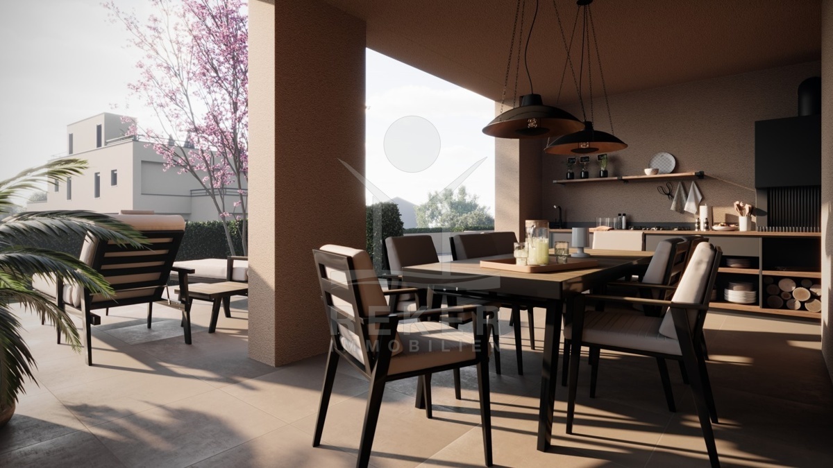 Im Erdgeschoss der Wohnung empfängt Sie ein einladender Flur, der zu einem geräumigen Wohnzimmer mit offener Küche führt. Das Esszimmer bietet direkten Zugang zur Terrasse, wo sich eine Sommerküche für unvergessliche Grillabende im Freien befindet. Ein Schlafzimmer mit eigenem Bad, ein separates WC, ein Abstellraum sowie ein Technik- und Maschinenraum runden diese Etage ab.